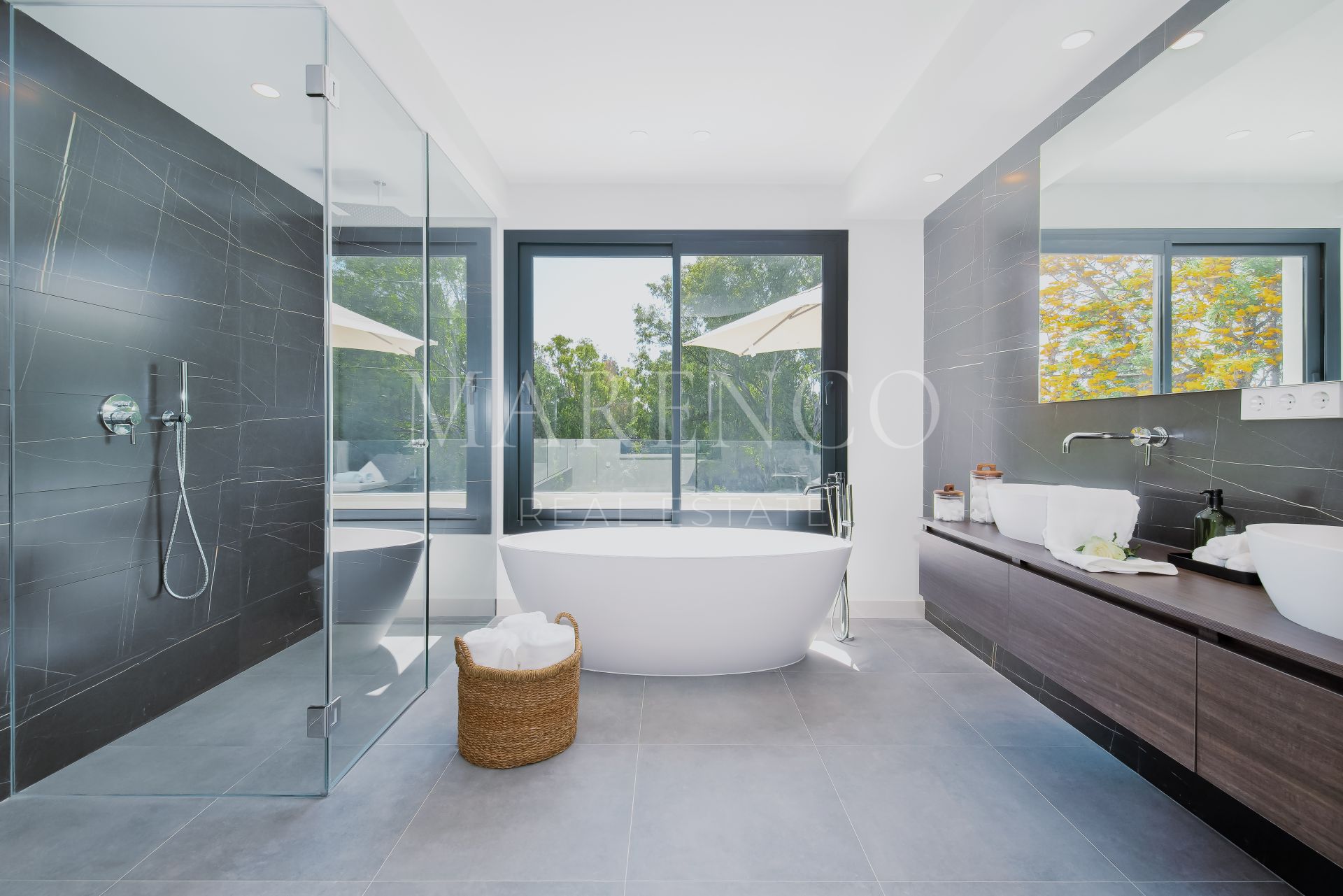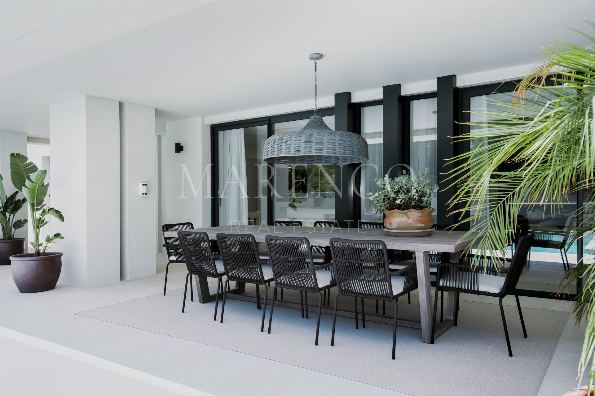 Villa zu verkaufen in Guadalmina Baja, San Pedro de Alcantara mit 4 Schlafzimmer, 4 Badezimmer, 1 Toilette und hat Schwimmbad (privat) und Garten (privat). Maße: 435m² Gebaut, 1124m² handlung und 132m² Terrasse.