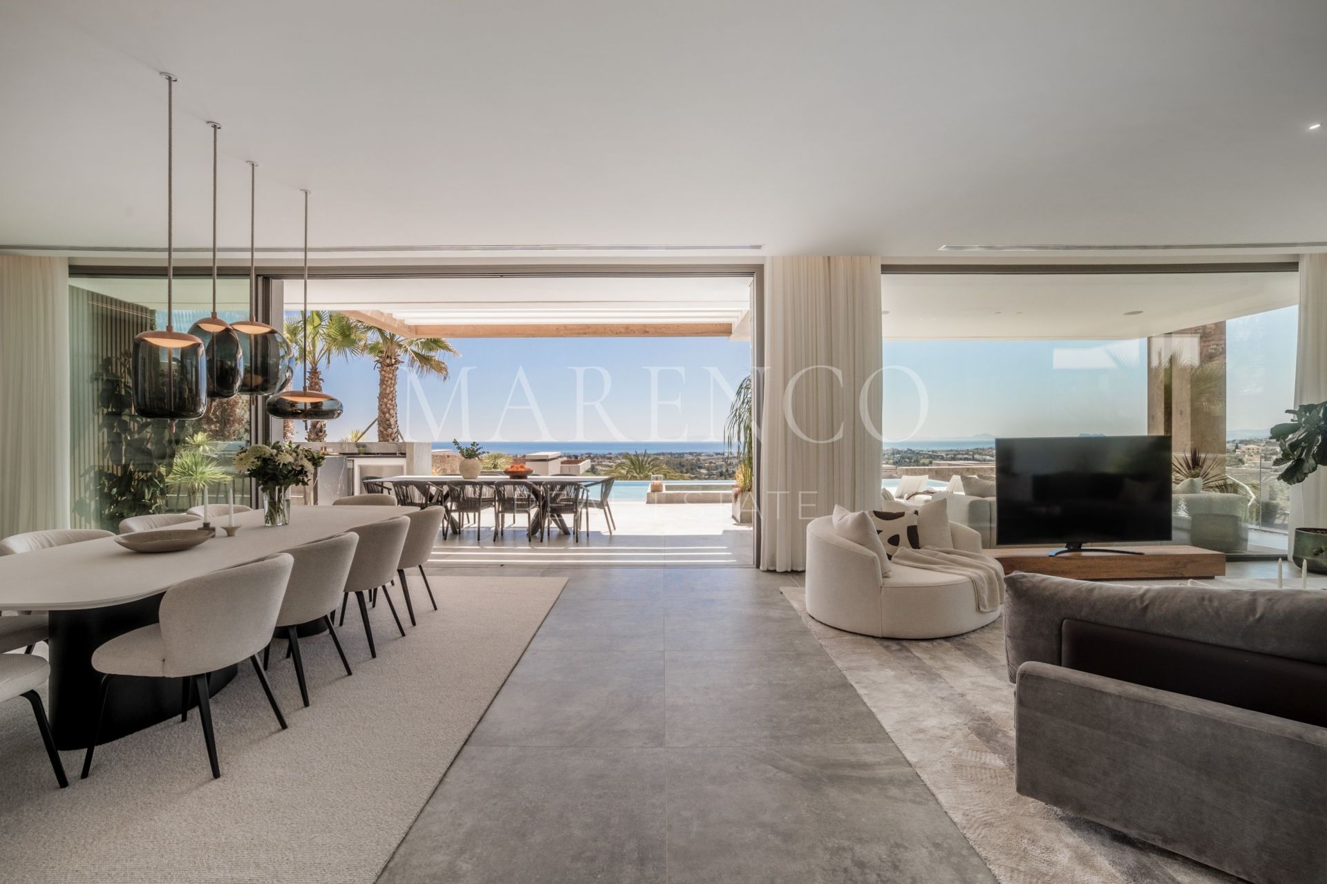 Das moderne Design der Villa unterstreicht dieses Erlebnis – mit offenen Wohnbereichen, die nahtlos mit der natürlichen Umgebung verschmelzen. Bodentiefe Fenster und großzügige Räume schaffen einen fließenden Übergang zwischen Innen- und Außenbereich und lassen viel Tageslicht, frische Luft und freie Sicht in jeden Winkel des Hauses.