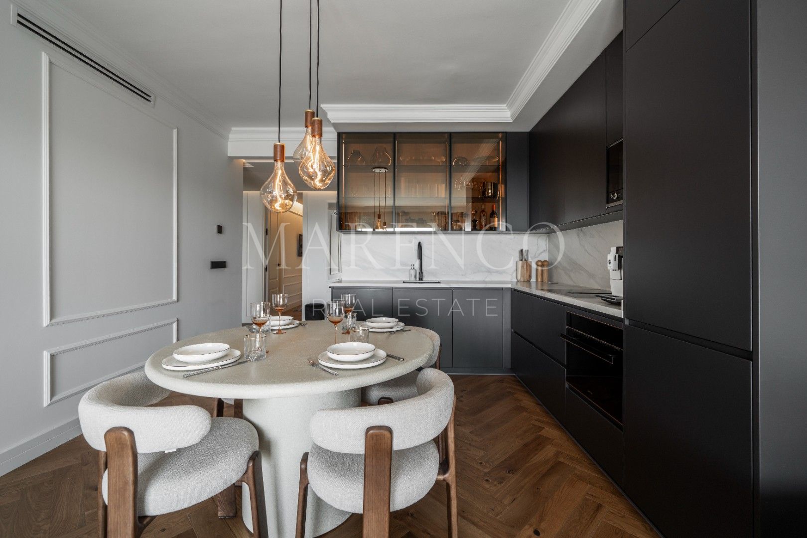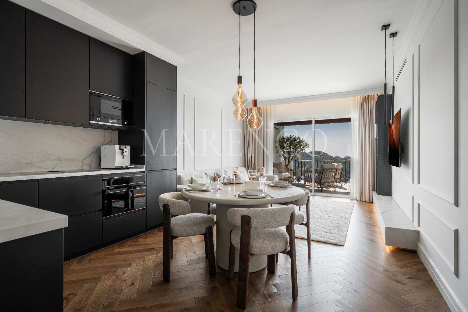 Das kürzlich hochwertig renovierte Penthouse zeichnet sich durch sorgfältig ausgewählte Details aus, darunter Fischgrätparkett, maßgefertigte Wandverkleidungen und eine voll ausgestattete Küche mit hochwertigen Geräten. Die teilweise überdachte Terrasse wurde als natürliche Erweiterung des Innenbereichs konzipiert und verfügt über Ess- und Loungebereiche sowie eine Außenküche, ideal, um das ganze Jahr über das Klima zu genießen.
