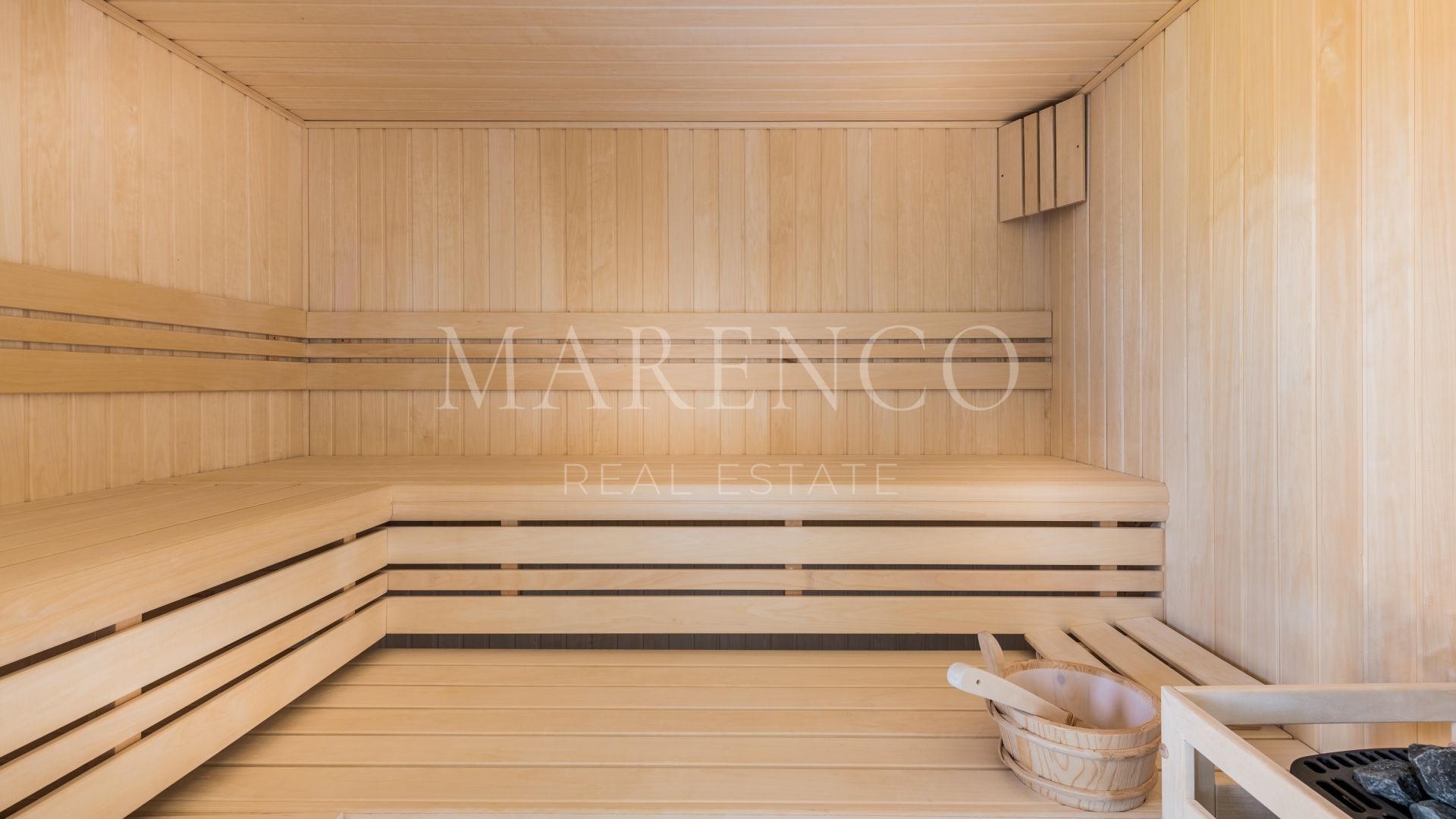 Die Immobilie wurde mit hochwertigen Materialien renoviert, darunter bodentiefe Doppelverglasungsfenster, Marmor- und Holzböden, Fußbodenheizung im gesamten Haus, Klimaanlage (warm und kalt), ein Hausautomationssystem, Sicherheits- und Mediensystem, eine voll ausgestattete Küche, ein Innenpool mit Bar, Sauna, Fitnessraum, Kino sowie ein Außenpool mit beeindruckenden und großzügigen Gärten.