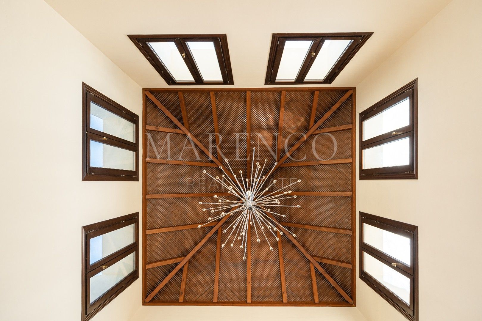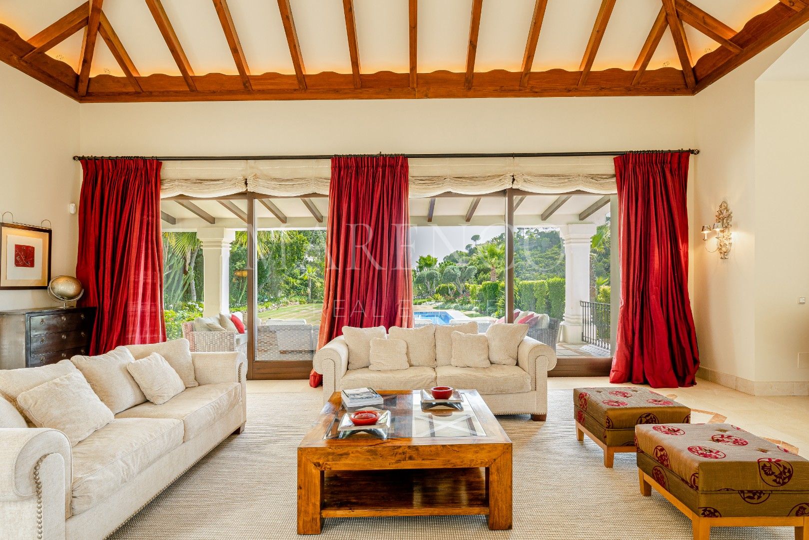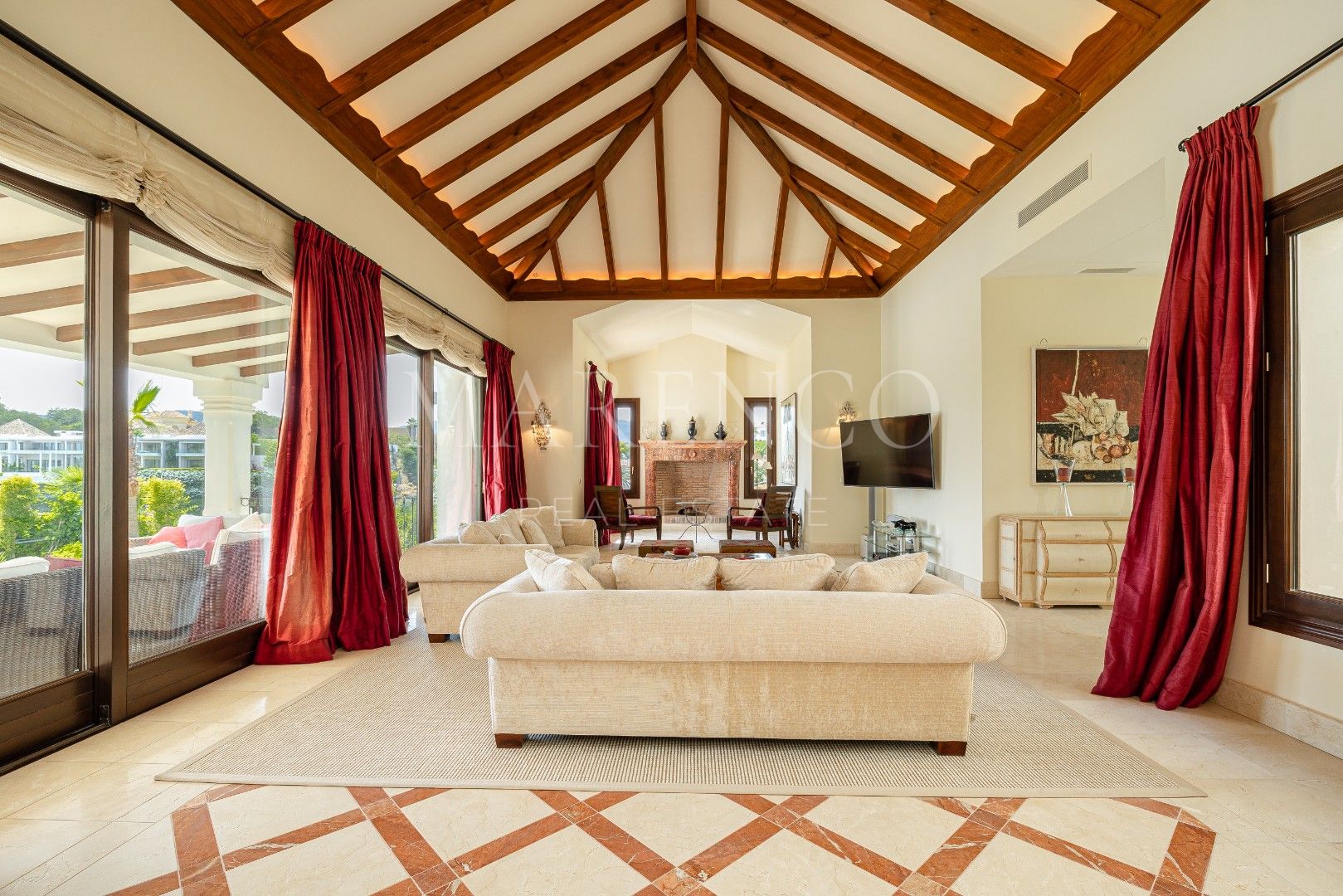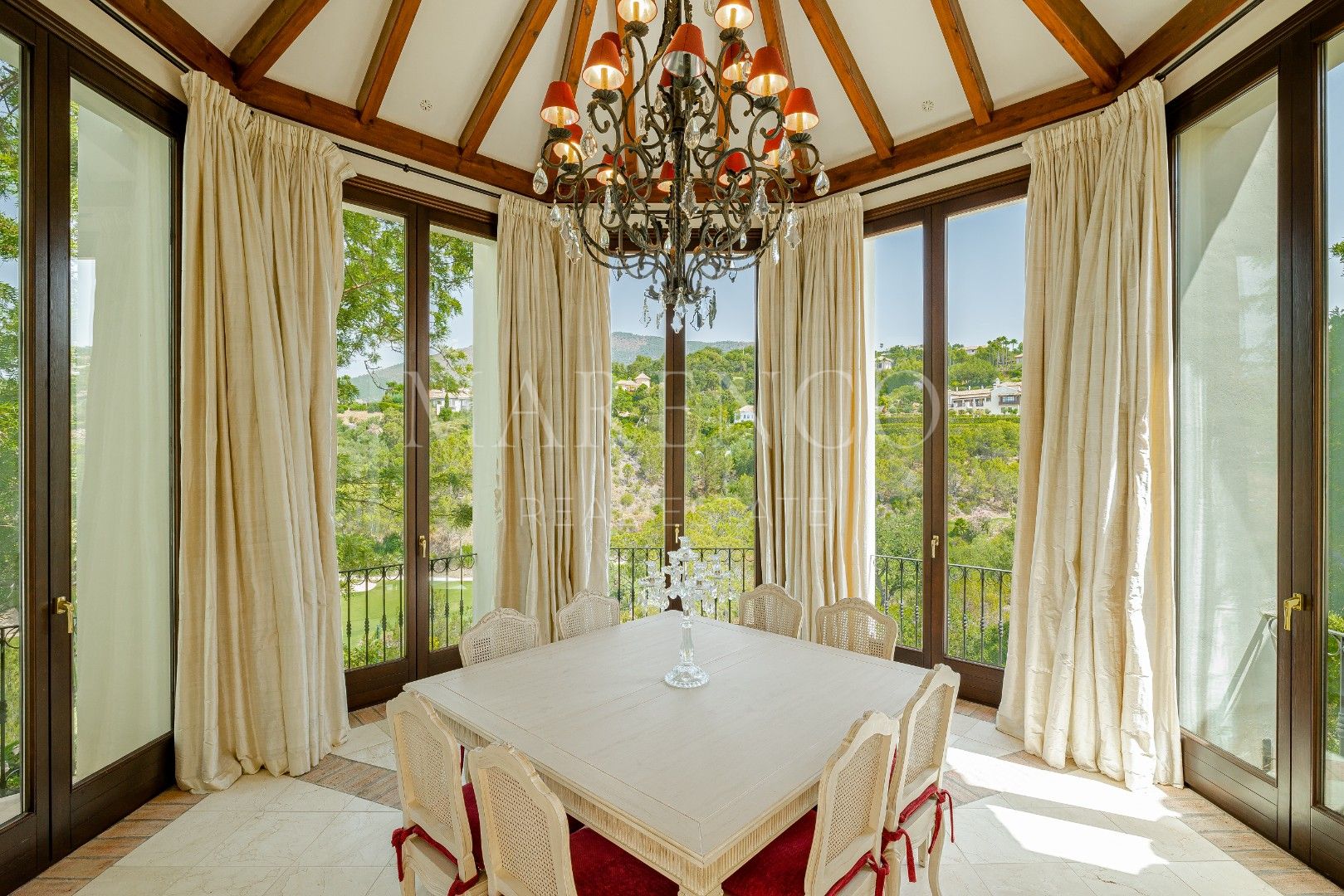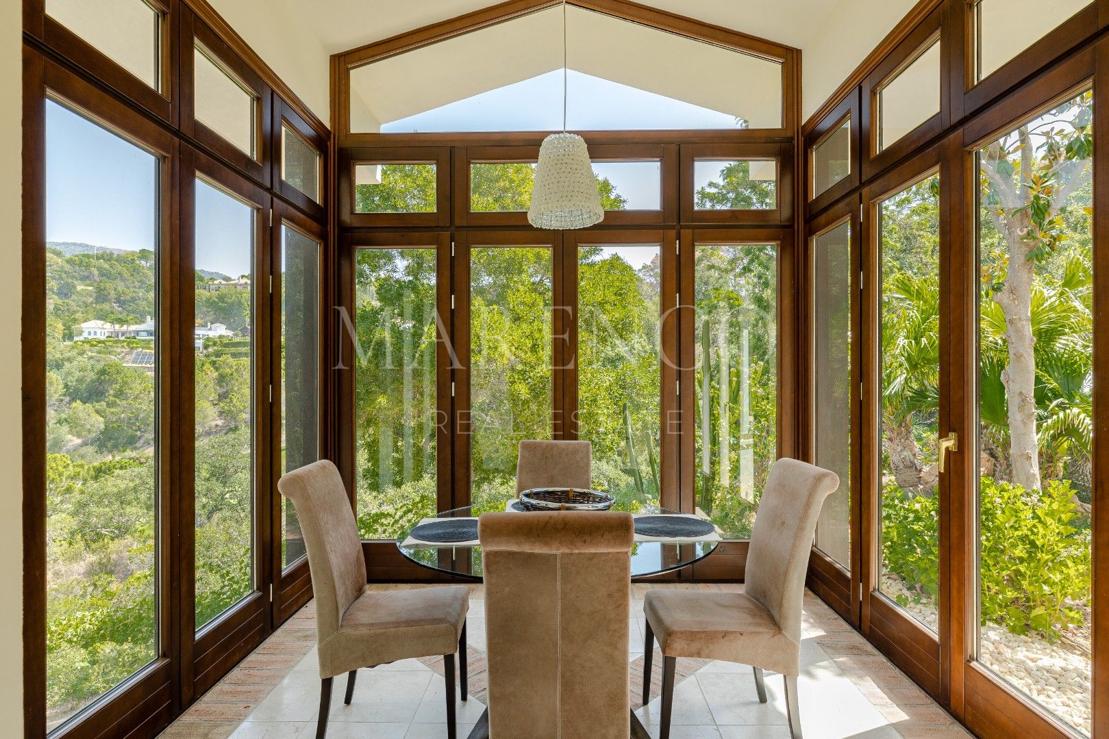 Beim Betreten der Villa gelangen Sie über eine majestätische Auffahrt, die zur Hauptfassade des Hauses führt, umgeben von perfekt gepflegten Gärten, großzügigen Parkmöglichkeiten und einer Tiefgarage für bis zu 5 Fahrzeuge. Durchqueren Sie die Auffahrt, gelangen Sie in eine beeindruckende Eingangshalle mit hohen Decken und großen Fenstern, die den ganzen Tag über natürliches Licht hereinlassen. Das Wohnzimmer verfügt über eine gewölbte Holzdecke und einen wunderschönen Kamin, der eine gemütliche und elegante Atmosphäre schafft. Von hier aus öffnet sich der Raum zur Küche, die einen separaten Frühstücksbereich mit atemberaubendem Blick auf den Golfplatz bietet. Das Esszimmer, eines der Highlights dieser Villa, hat eine runde Form mit großen Wintergarten-ähnlichen Fenstern und bietet eine beeindruckende Kulisse für Mahlzeiten mit Panoramablick auf den Golfplatz und die Berge.