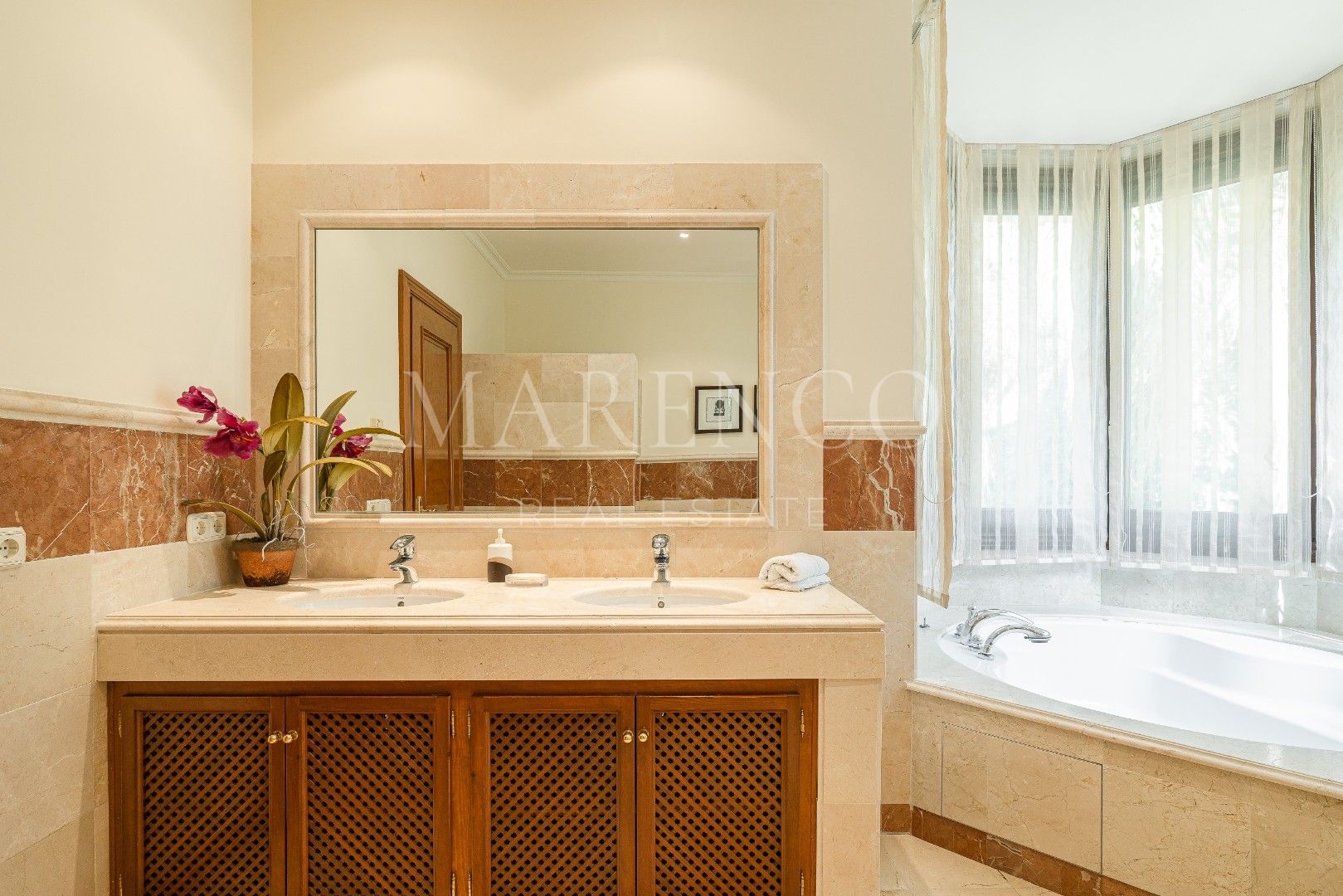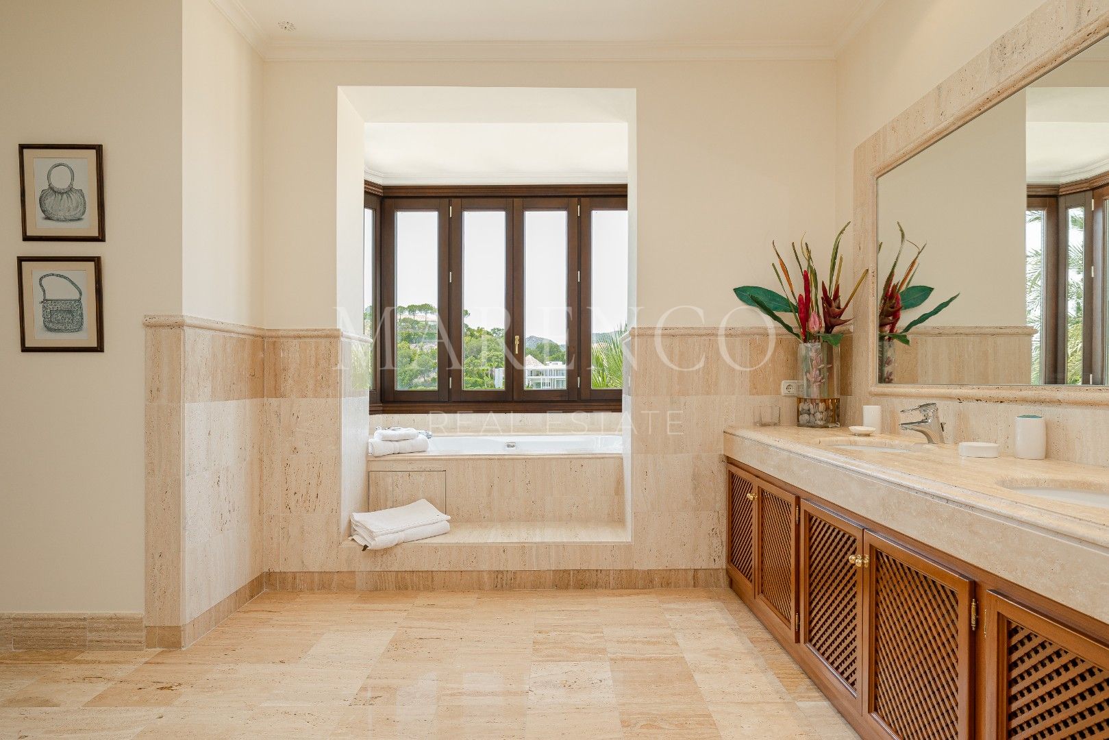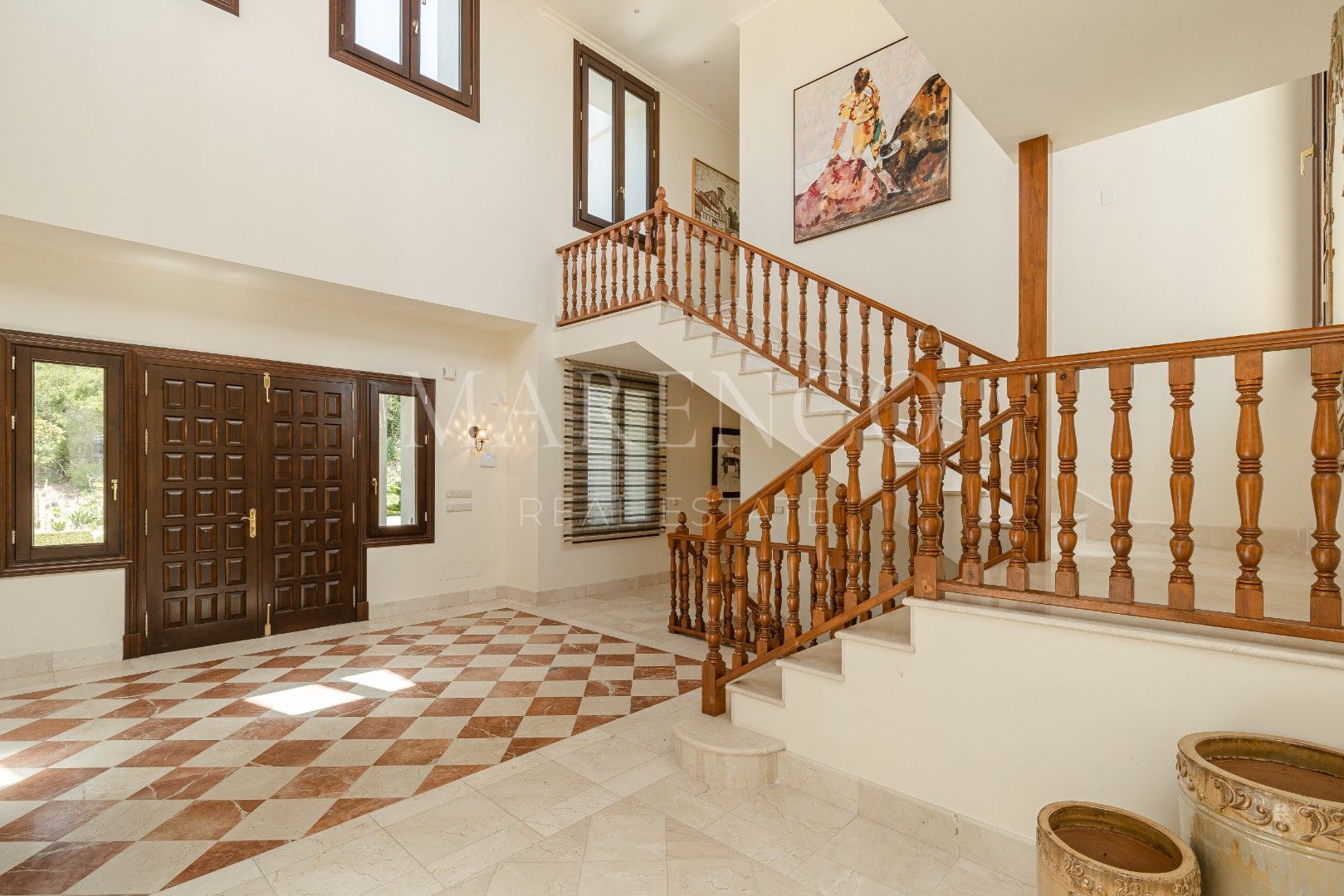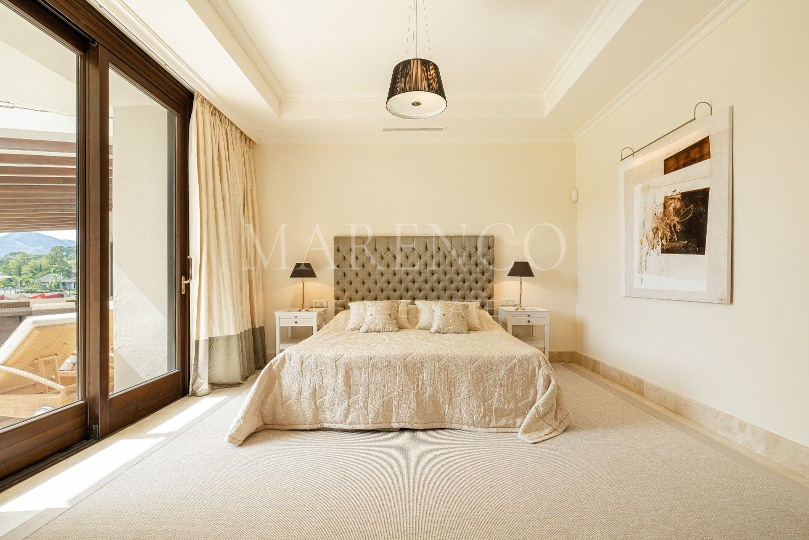 Im Erdgeschoss befinden sich außerdem 3 Doppelzimmer, alle elegant eingerichtet und mit en-suite Badezimmern ausgestattet. Im Obergeschoss befindet sich die beeindruckende Hauptsuite, ein geräumiges und luxuriöses Zimmer mit Einbauschränken, einem großen Badezimmer mit Dusche und Whirlpool-Badewanne sowie einem Balkon mit spektakulärem Blick auf den Garten, den Pool und den Golfplatz.
