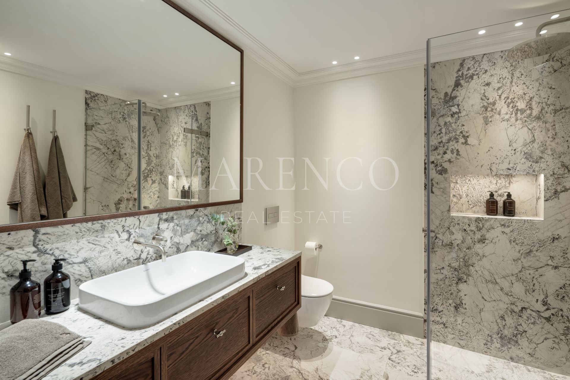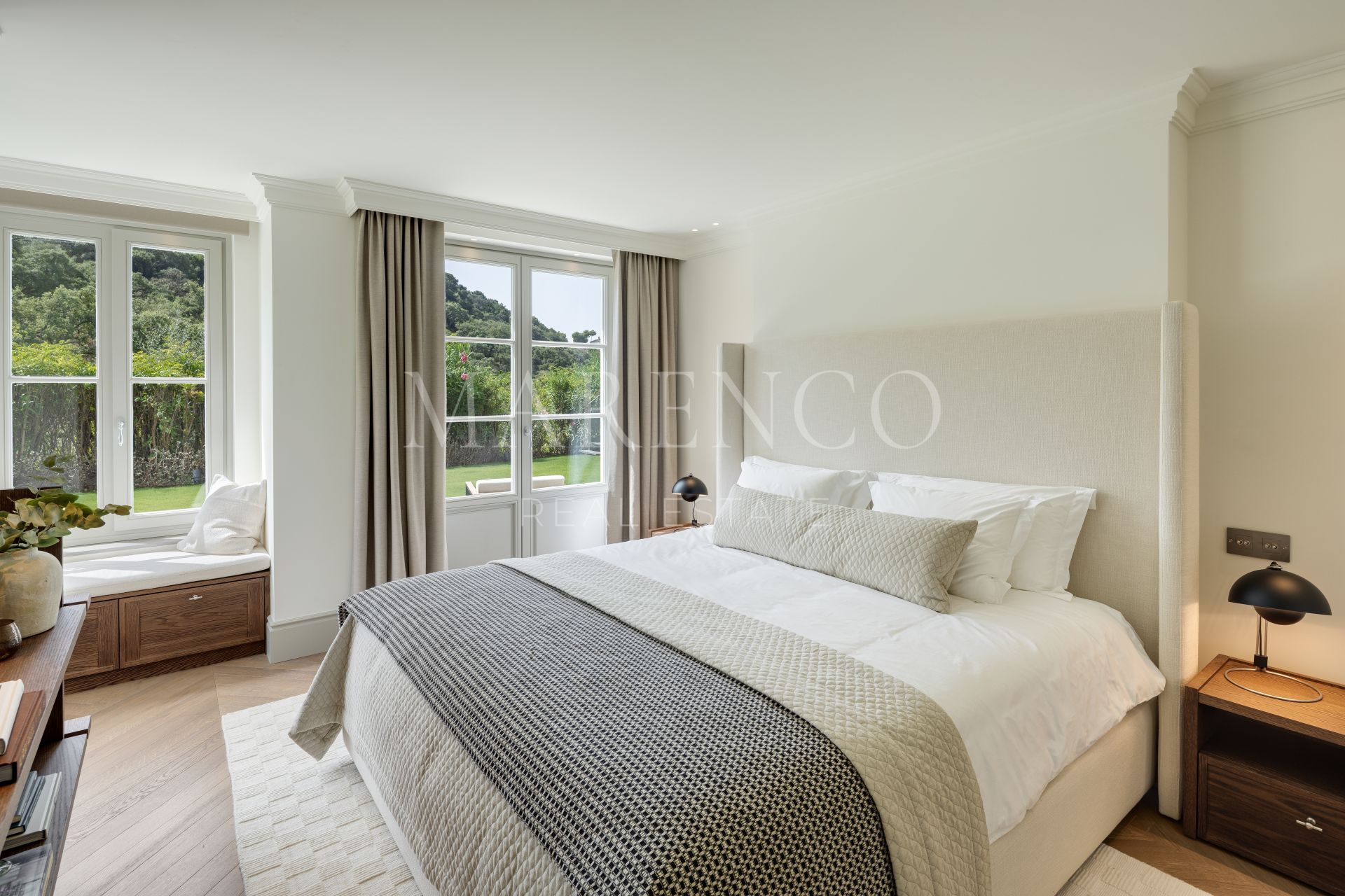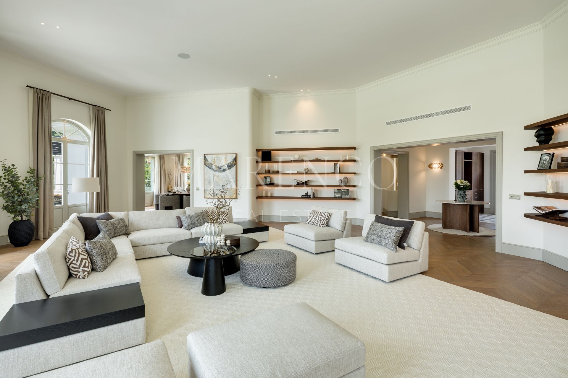 Mit 695 m² Wohnfläche und 66 m² Terrassen erstreckt sich die Immobilie über zwei Ebenen, die die Gemeinschaftsbereiche auf natürliche Weise von den privaten Rückzugsräumen trennen. Die Eingangshalle führt in ein großzügiges Wohnzimmer mit hohen Decken und großen Fenstern, die das Innere mit Tageslicht durchfluten und den Blick auf Garten und Pool freigeben. Die Villa verfügt über fünf Schlafzimmer mit eigenem Bad, sechs Bäder und eine Küche mit Miele-Geräten sowie Innen- und Außen-Essbereiche.