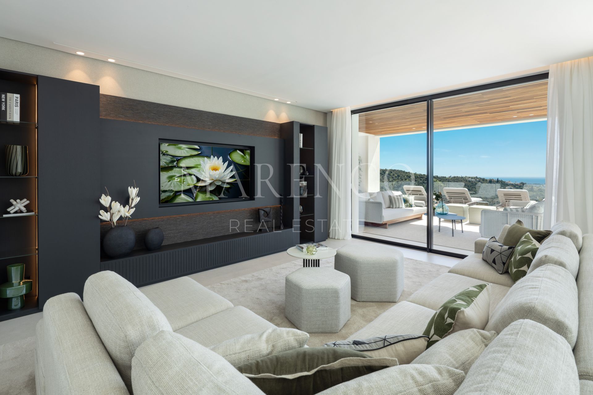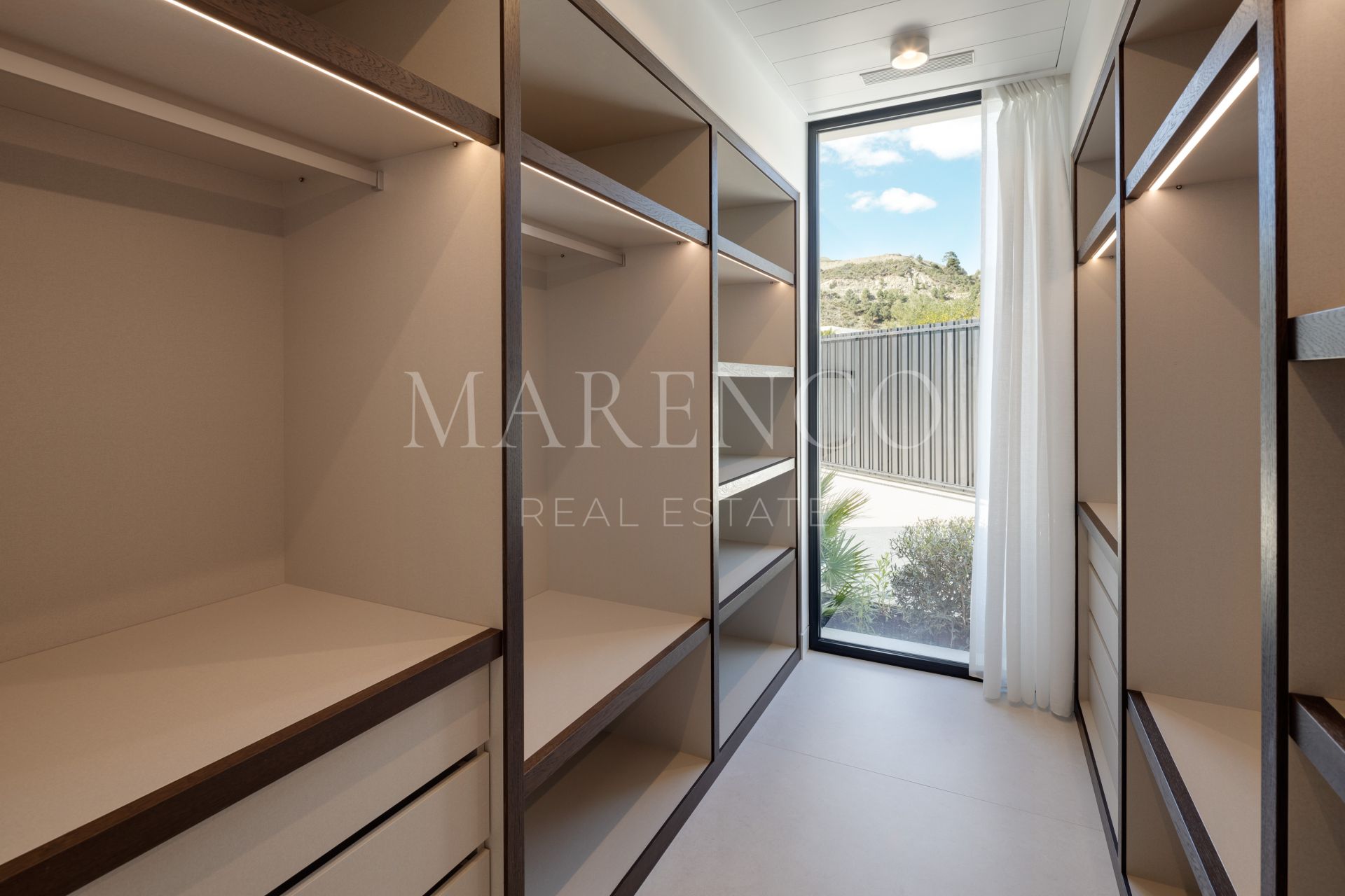 Das Erdgeschoss ist ganz dem stilvollen Wohnen und dem gehobenen Entertainment gewidmet: mit einer TV-Lounge, einem formellen Wohnzimmer mit großzügigem Kamin und einer voll ausgestatteten Modulnova-Küche. Ein begehbarer Weinkeller bereichert das kulinarische Erlebnis, während die weitläufigen Außenterrassen mit einer Außenküche, einem Essbereich und einem Infinity-Pool mit Blick auf das Mittelmeer beeindrucken.