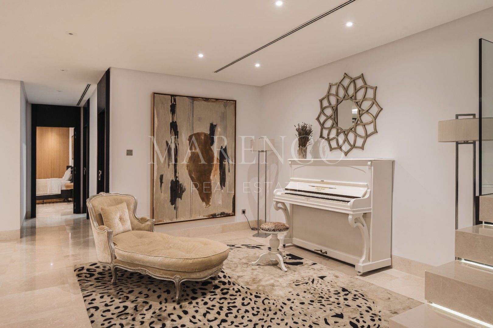 Auf einem großzügigen Grundstück von 2.109 m² in erster Reihe zum Golfplatz umfasst dieses dreigeschossige Haus 1.092 m², einschließlich Terrassen, die für einen exklusiven Lebensstil konzipiert wurden. Das Wohnzimmer ist geräumig und hell, mit hohen Decken, Marmorböden, einem modernen Kamin und sogar Platz für ein Klavier. Die offene, voll ausgestattete Küche bietet ein elegantes Design, hochwertige Geräte und einen gemütlichen Essbereich. Ein elegantes Esszimmer lädt zu formellen Abendessen ein und bietet Zugang zu einer Terrasse für Mahlzeiten im Freien.