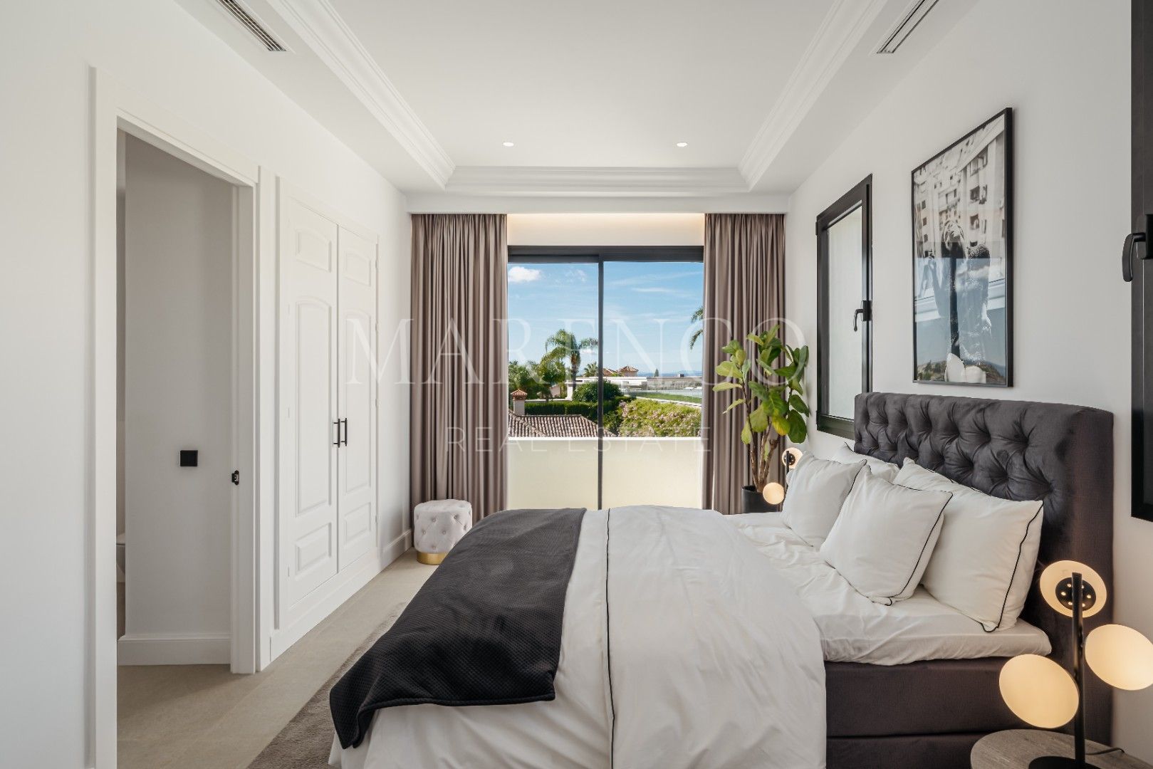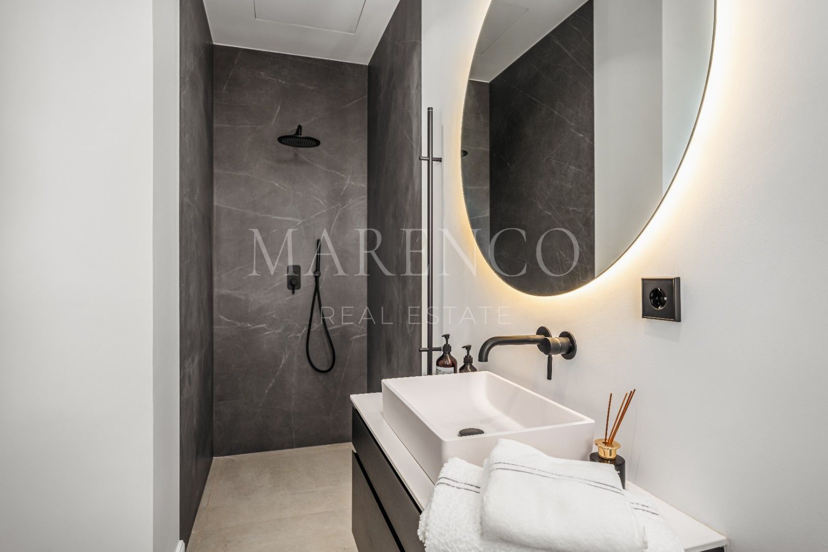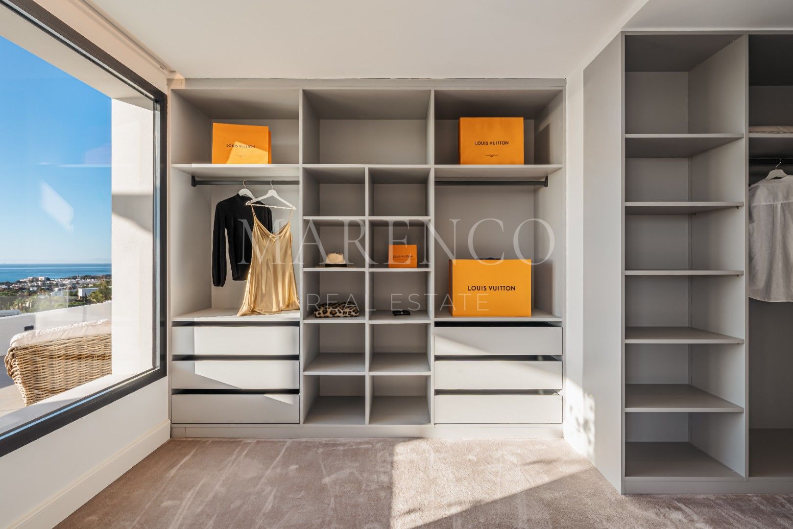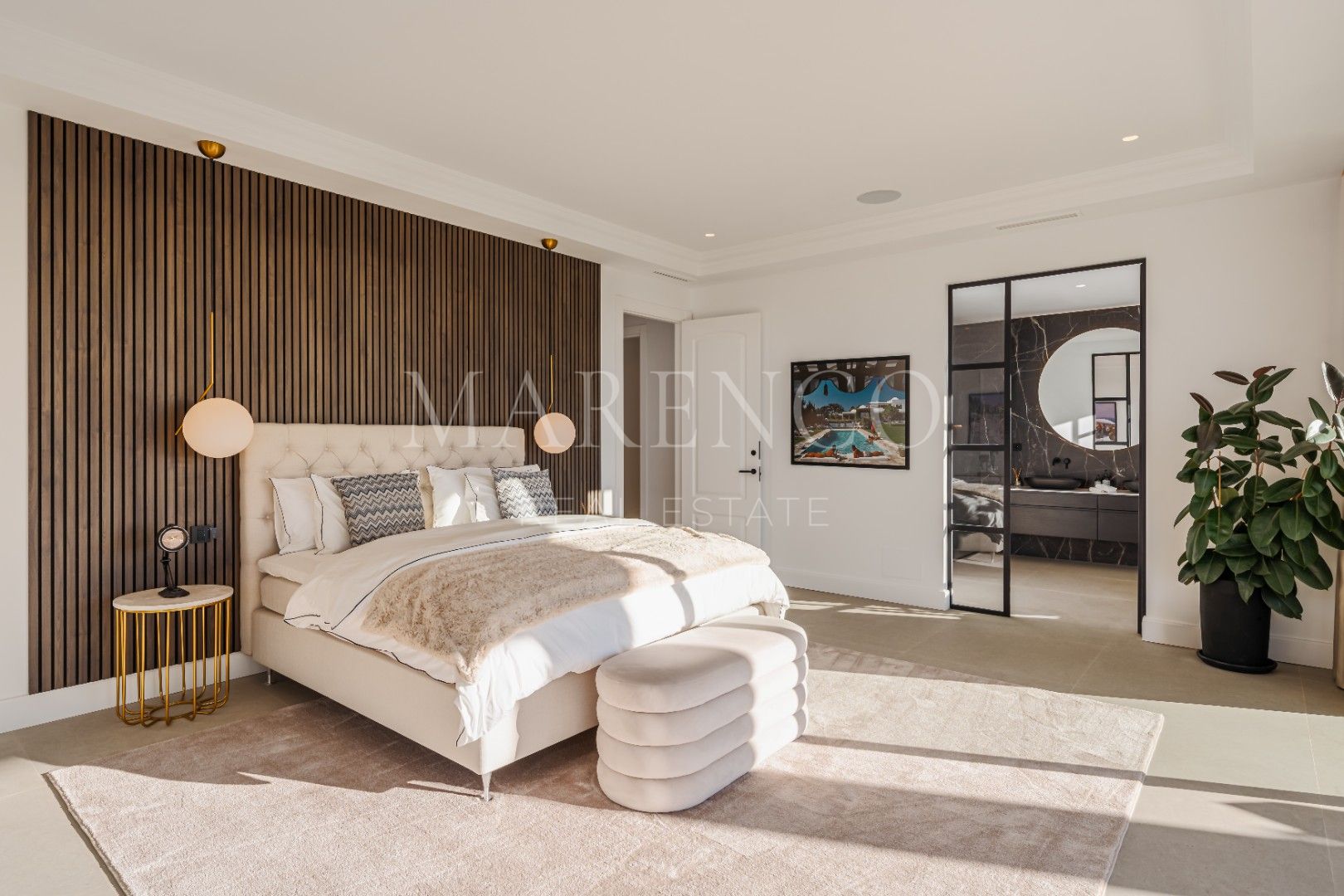 Im ersten Obergeschoss bietet das Hauptschlafzimmer mit eigenem Bad eine ruhige Rückzugsmöglichkeit. Es verfügt über ein privates Badezimmer mit einer freistehenden Badewanne, die so positioniert ist, dass man die Aussicht genießen kann, Zugang zu einer großen Terrasse und einen geräumigen begehbaren Kleiderschrank. Zwei weitere Schlafzimmer mit eigenem Bad auf dieser Etage sorgen für Komfort und Privatsphäre für alle Familienmitglieder.