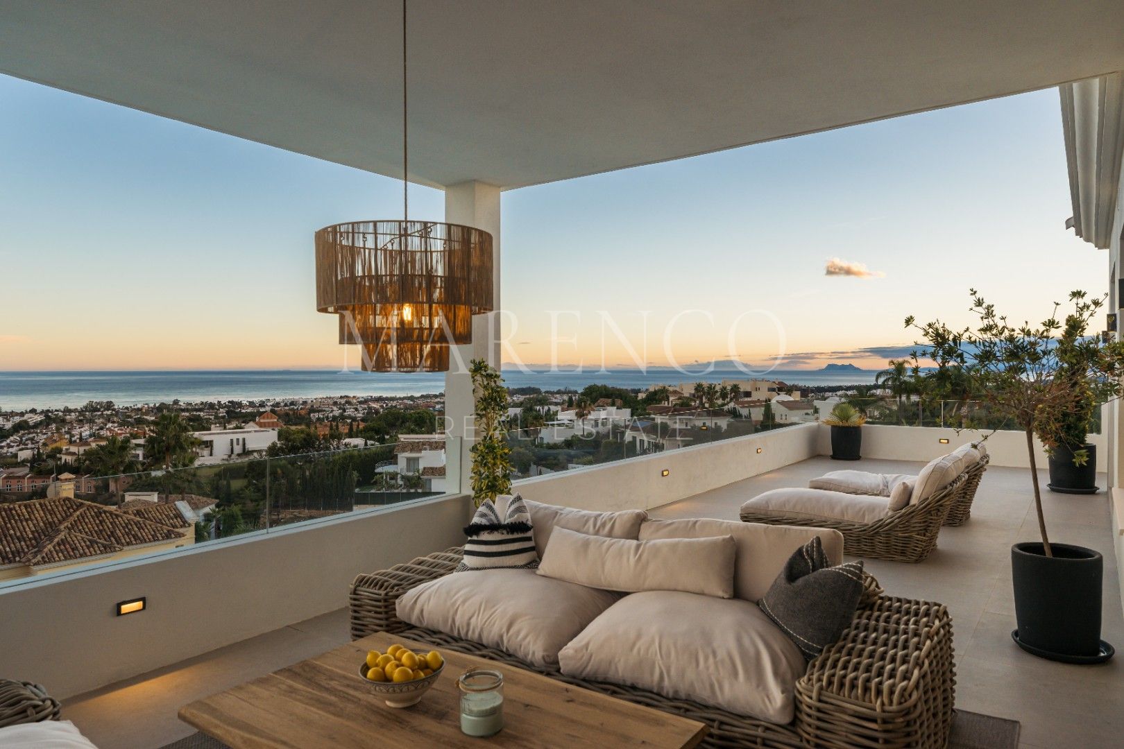 Die Dachterrasse bietet einen wirklich außergewöhnlichen Entspannungsbereich mit einem Tauchbecken, Liegestühlen, einer Außenküche und einem Essbereich – alles vor der Kulisse eines atemberaubenden Panoramablicks.