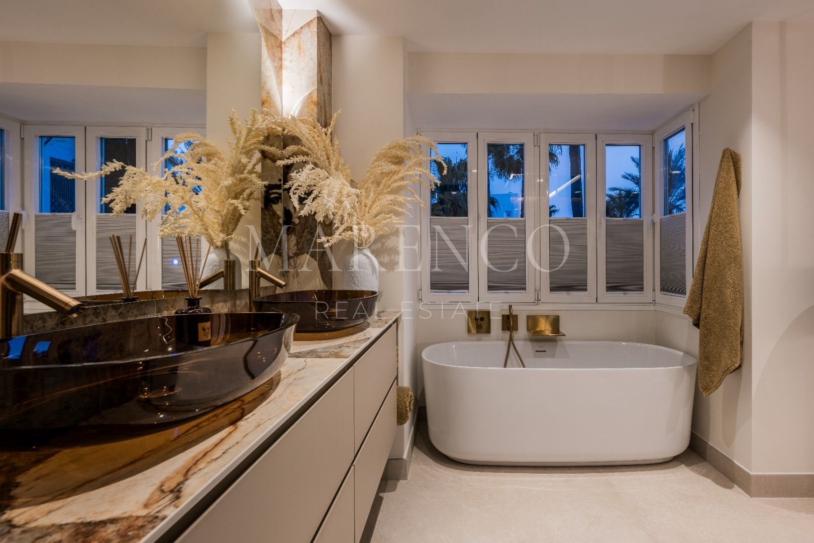 Erleben Sie Küsteneleganz in dieser wunderschön renovierten 3-Schlafzimmer-Wohnung in der renommierten Wohnanlage Los Monteros Palm Beach in Marbella. Die Immobilie liegt im ersten Stock mit Südwestausrichtung, bietet 150 m² Wohnfläche und eine 40 m² große Terrasse mit atemberaubendem Blick und direktem Zugang zum Strand.