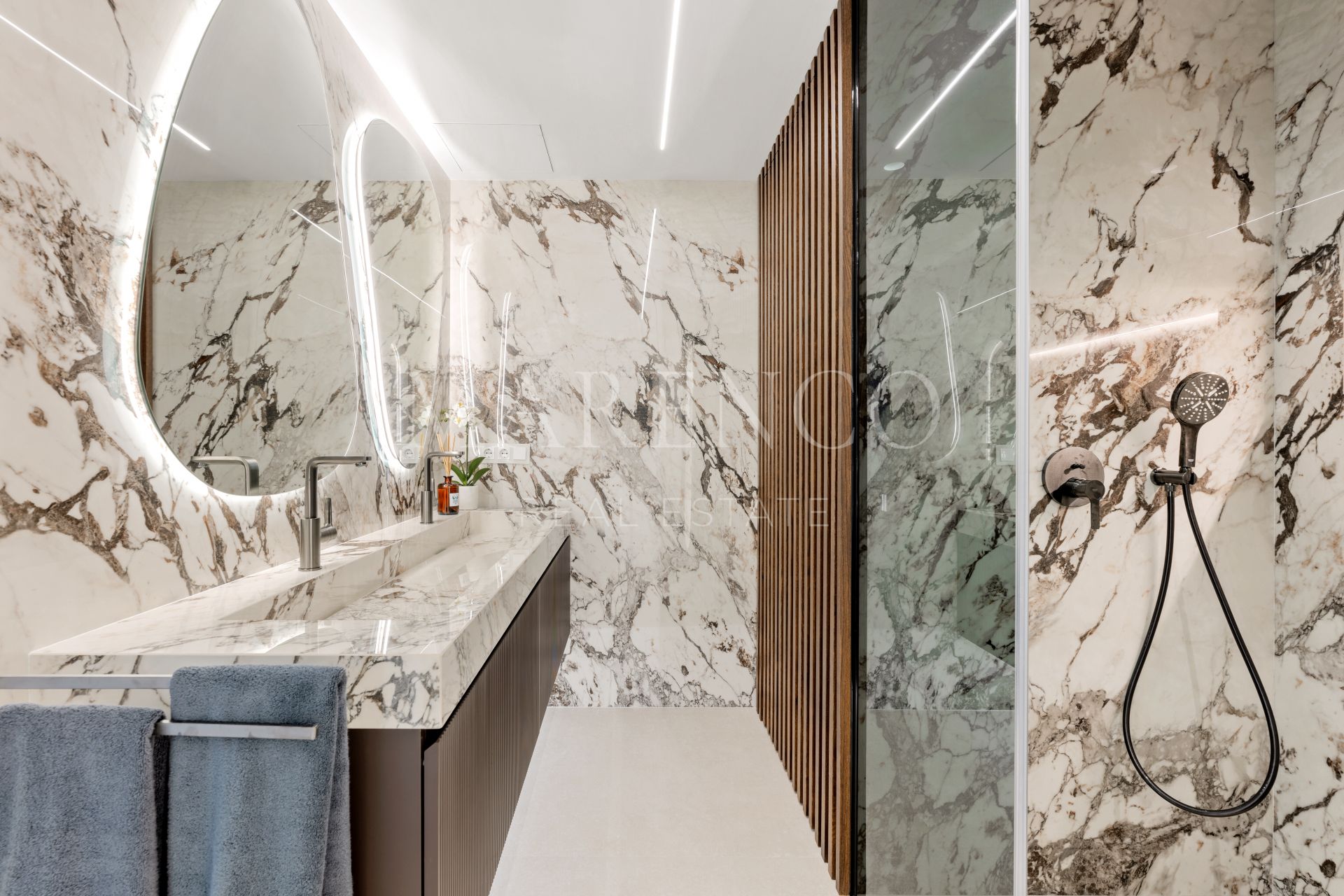 Das Interieur vereint modernen Luxus mit Komfort und bietet hochwertige Details wie ein B&O-Soundsystem, elektrische und Bioethanol-Kamine, einen versteckten Deckenfernseher, einen Weinkühlschrank, eine Bar und eine freistehende Badewanne. Die Mastersuite verfügt über ein Ankleidezimmer, während die voll ausgestattete Küche mit zwei Geschirrspülern und einem Thermomix ausgestattet ist.