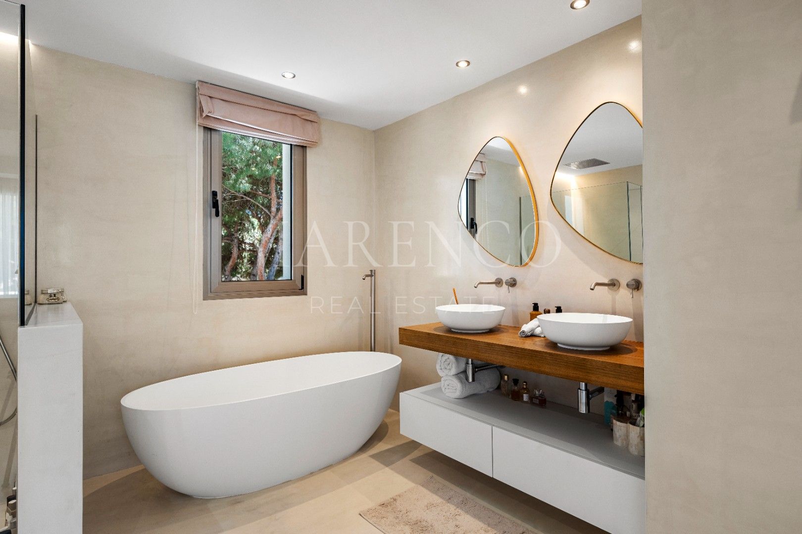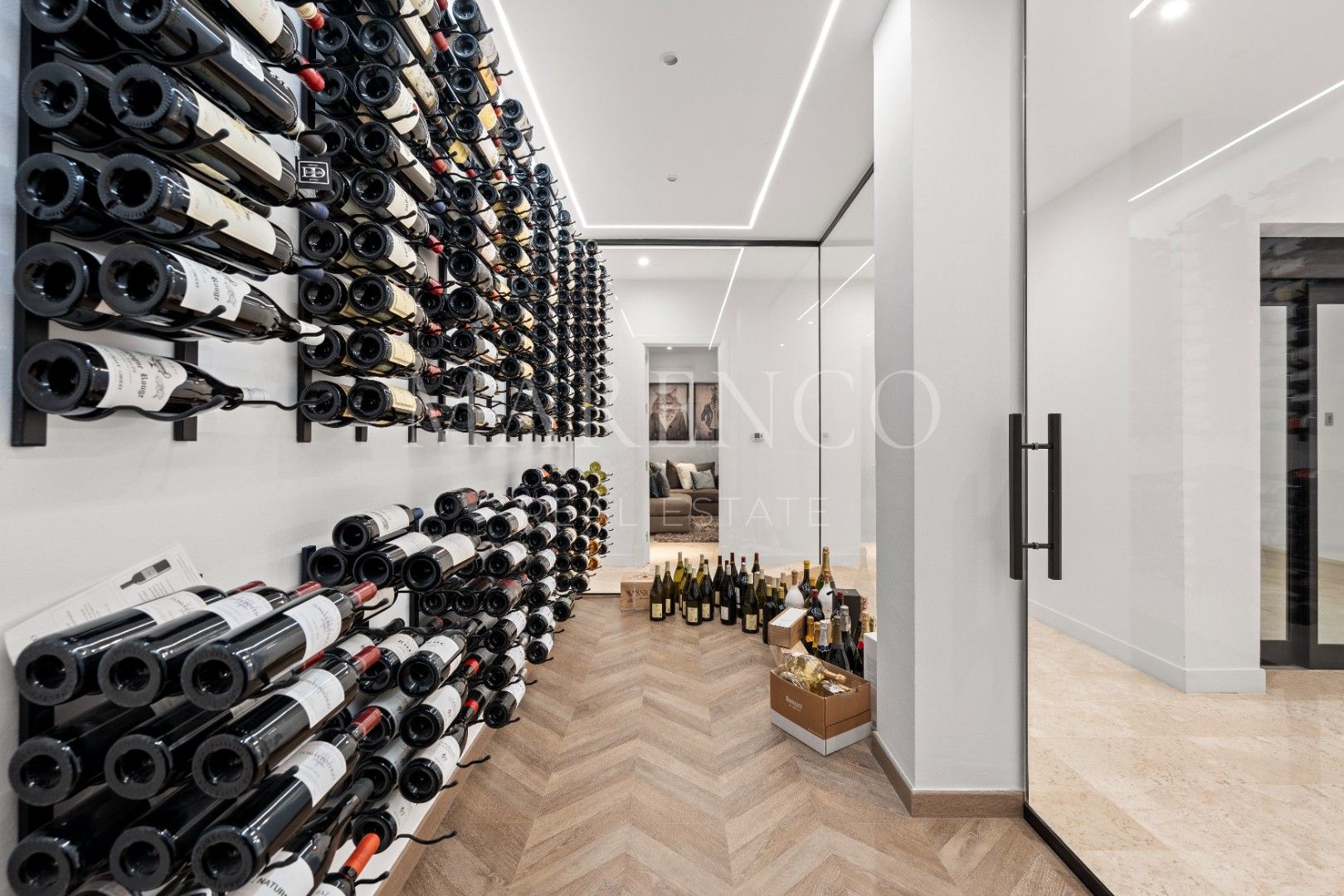 Direkter Zugang zu den Terrassen und dem Garten ermöglicht ein nahtloses Wohnen im Innen- und Außenbereich. Die untere Etage umfasst ein Gästezimmer mit eigenem Bad sowie eine Personalwohnung mit Wohnzimmer, Schlafzimmer und Bad. Zudem gibt es ein Heimkino, einen Weinkeller, ein Fitnessstudio, ein Büro, eine Waschküche und eine Garage mit Platz für sechs Autos. Alle Räume profitieren von natürlichem Licht, was den offenen Charakter der Immobilie unterstreicht.