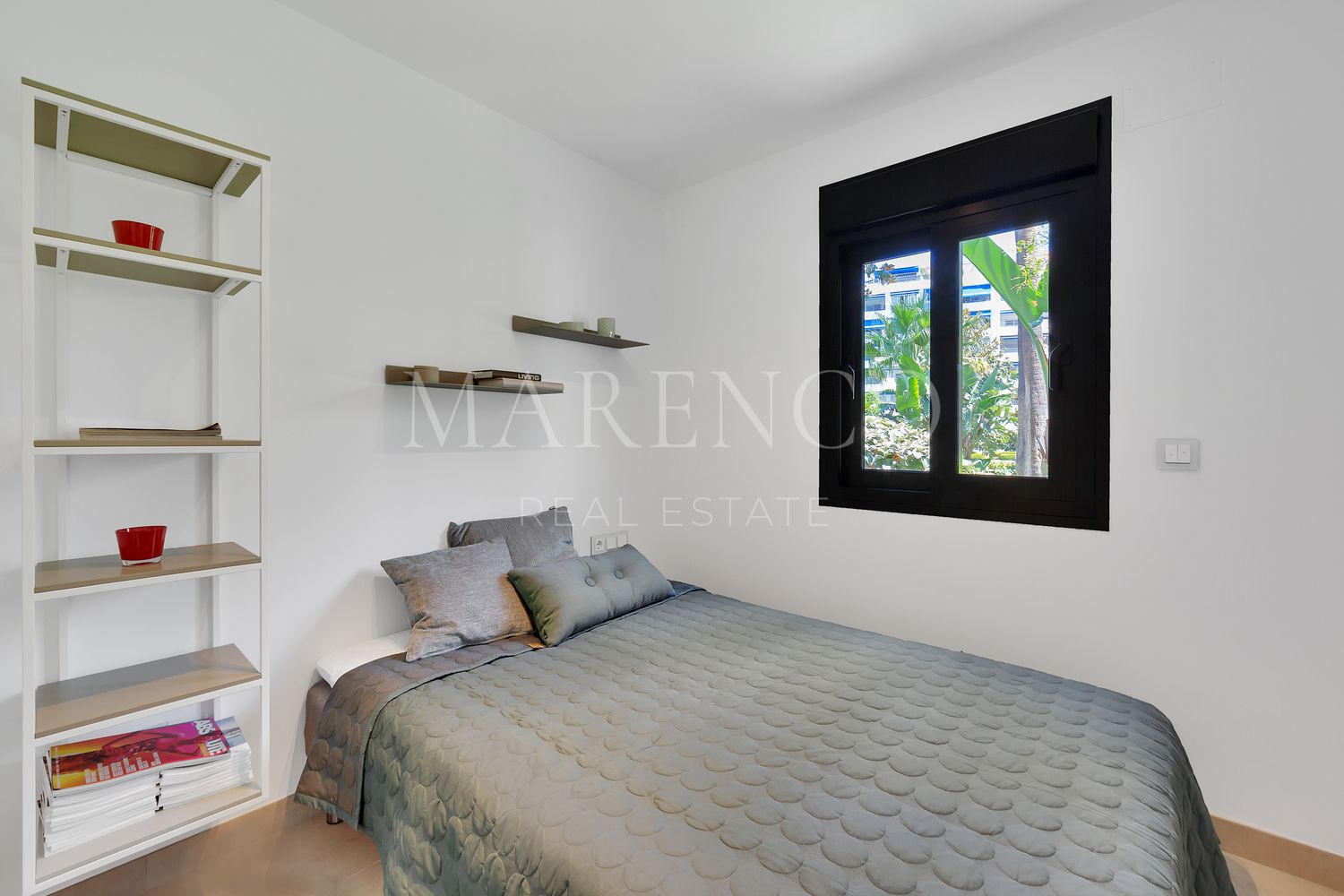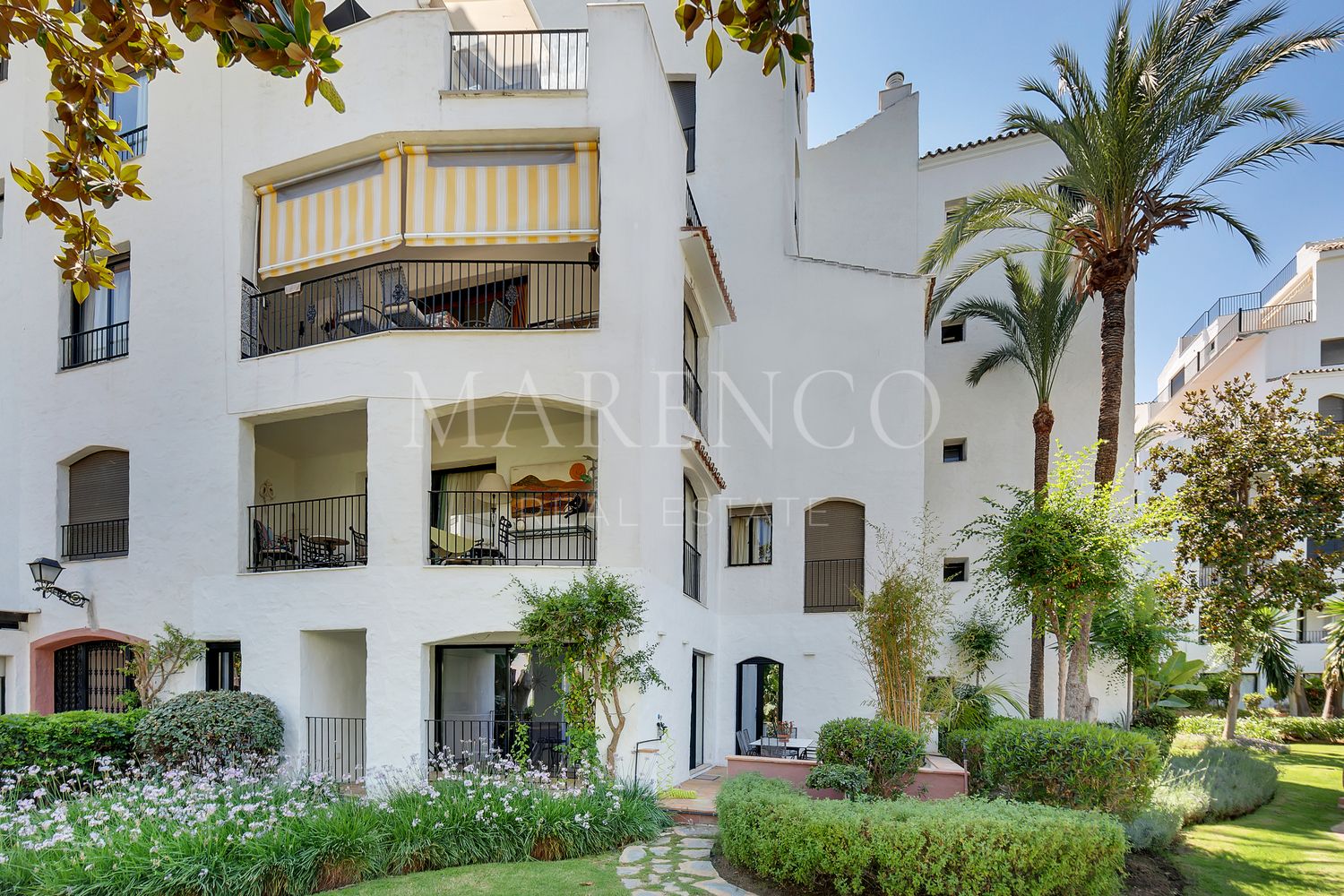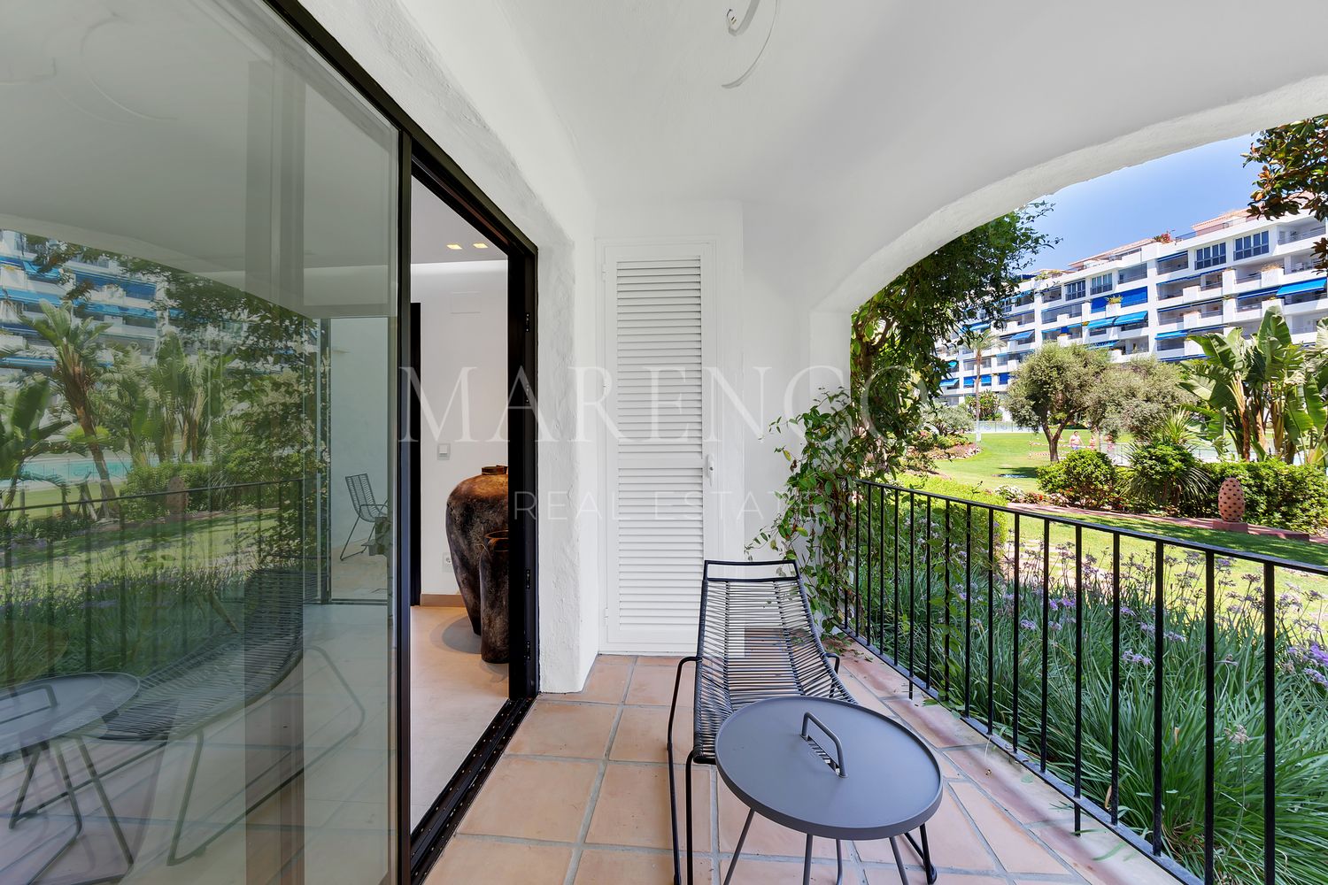 Erdgeschosswohnung zu verkaufen in Marbella - Puerto Banus, Marbella mit 3 Schlafzimmer, 2 Badezimmer und hat Schwimmbad (gemeinschaftlich) und Garten (gemeinschaftlich). Maße: 101m² Gebaut und 29m² Terrasse.