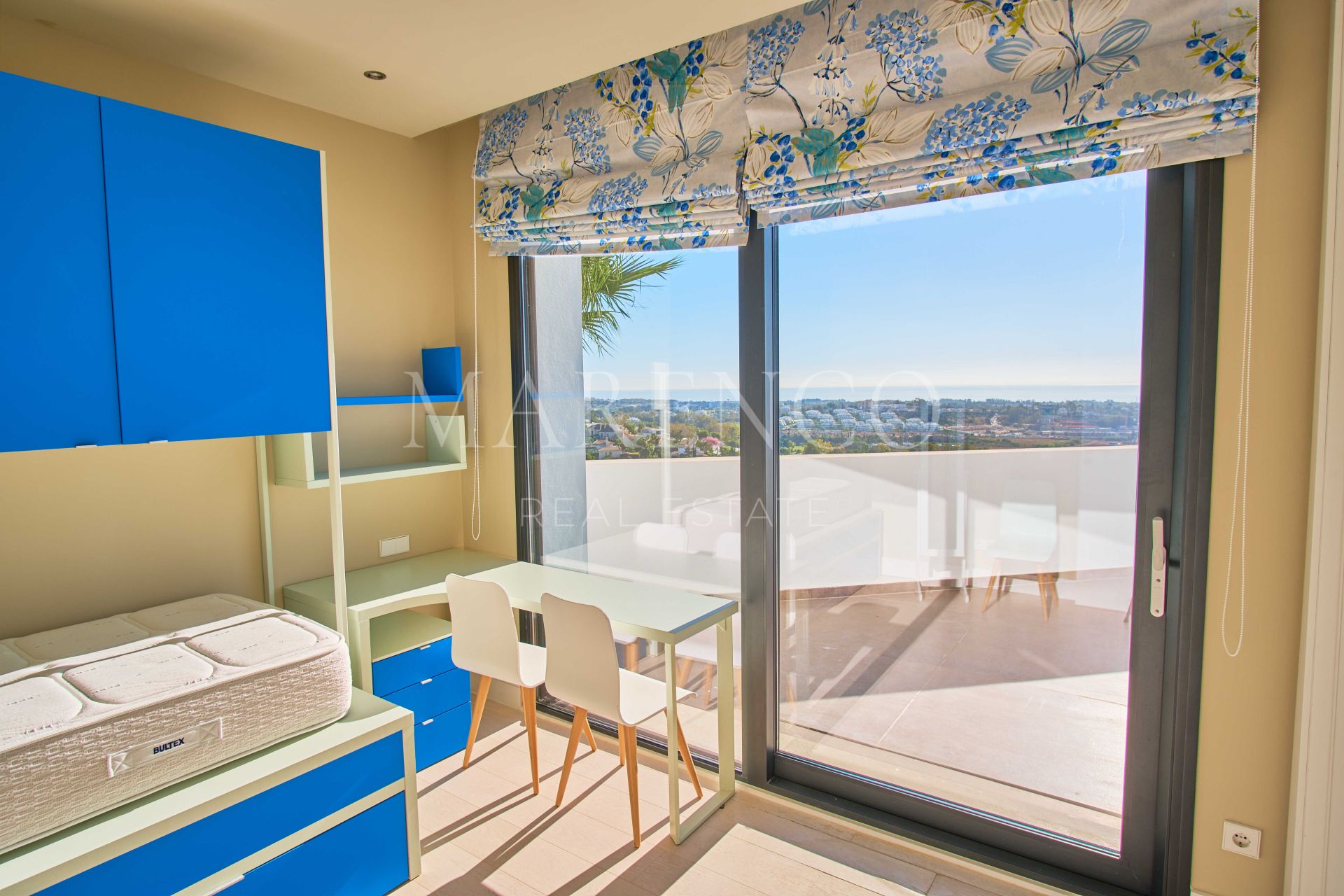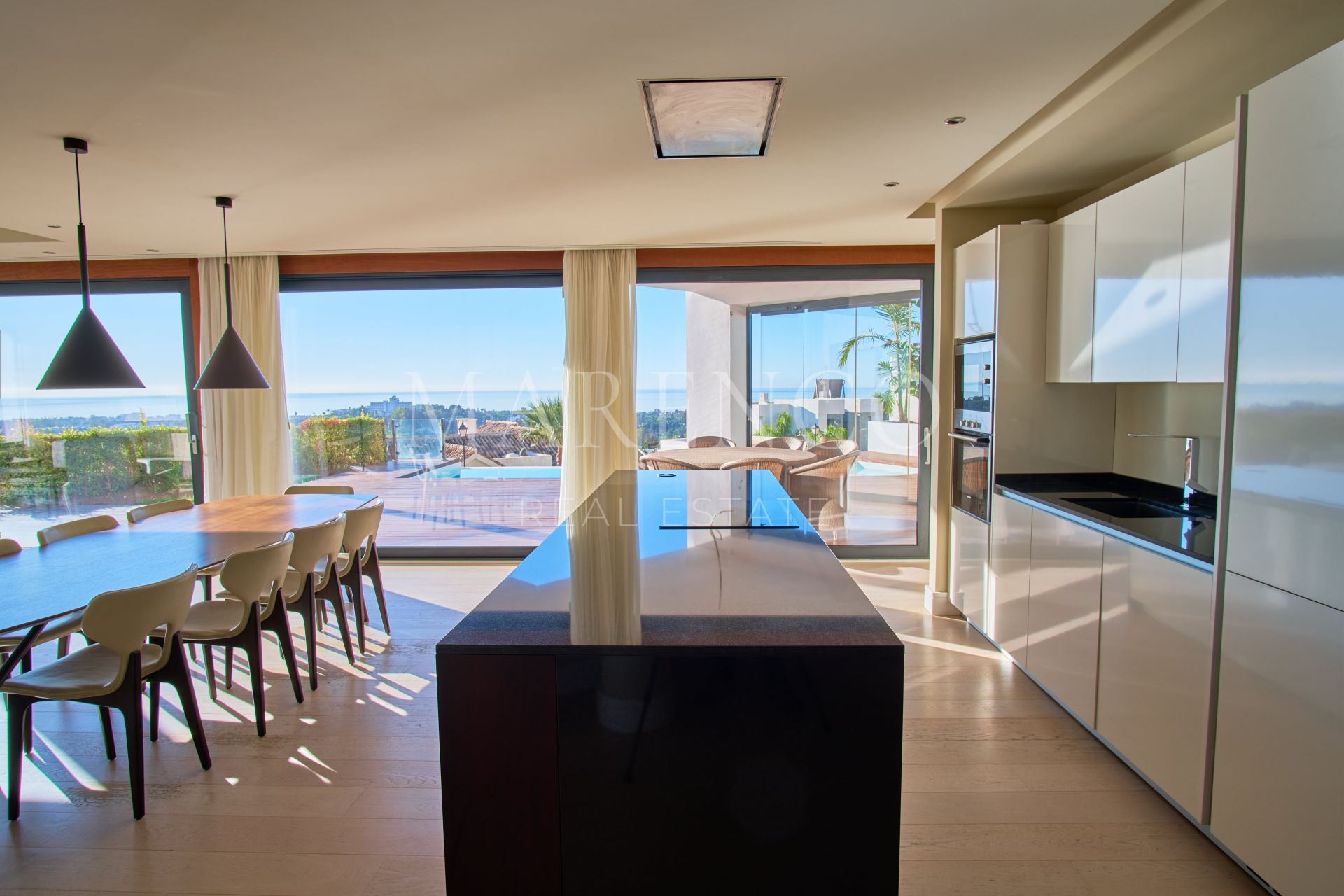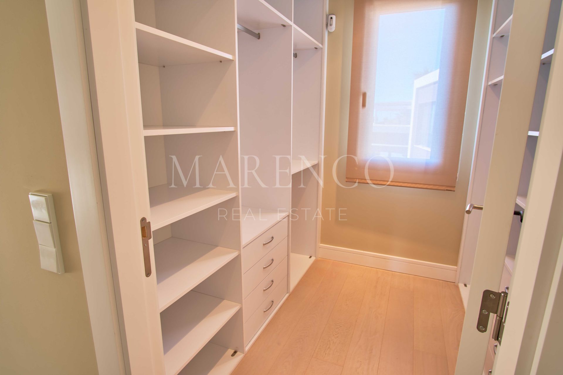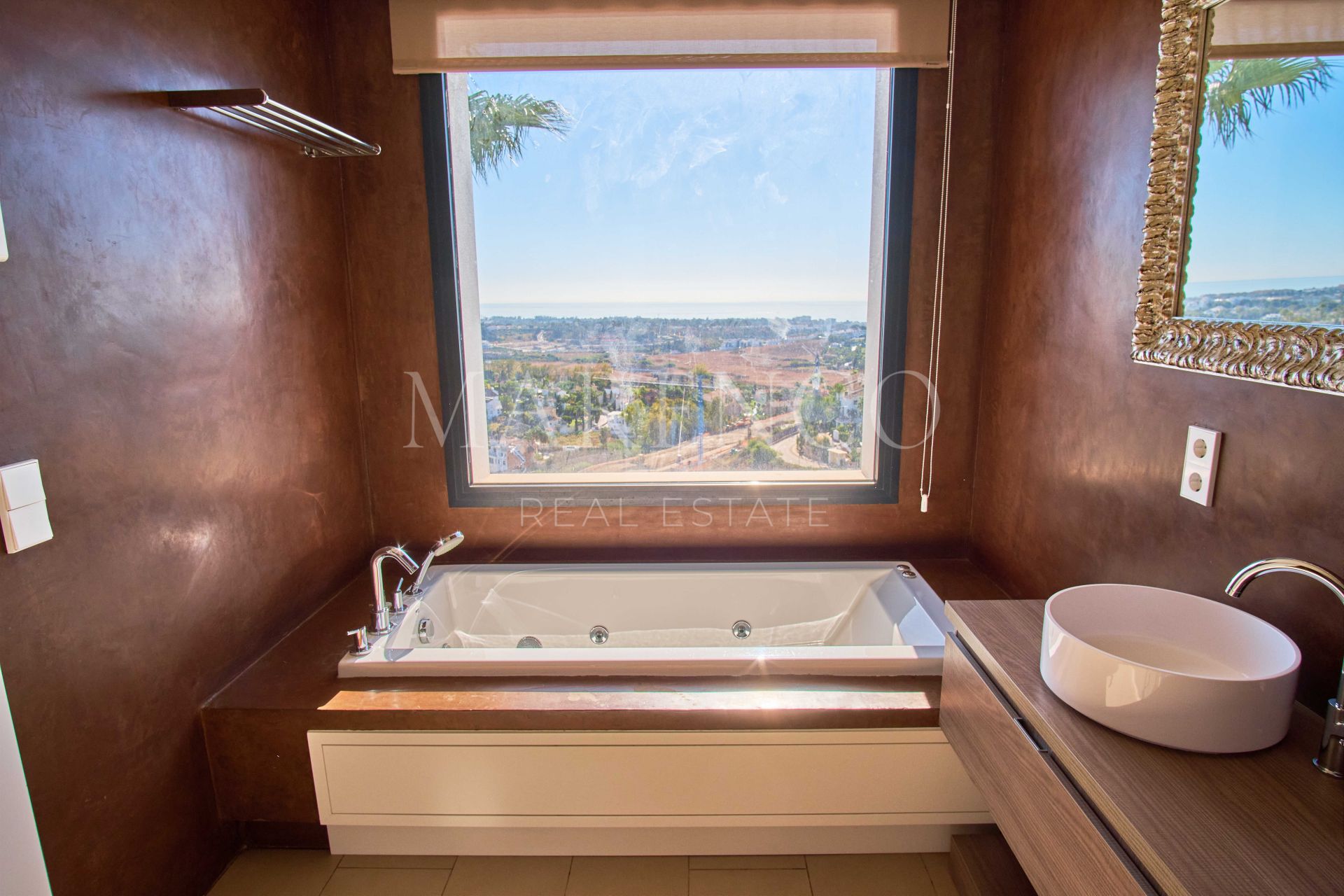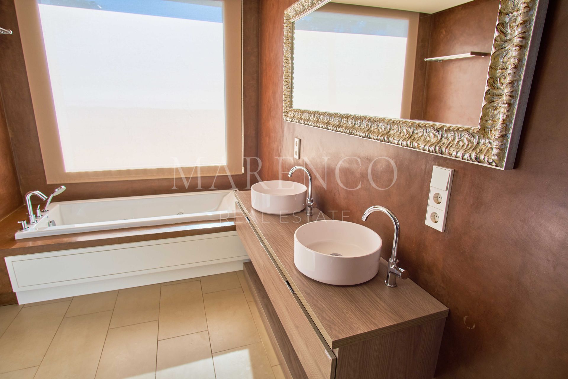 Diese Liegenschaft, orientation Süden, haben folgende Ausstattung: private terrasse, annehmlichkeiten nahebei, türsteher, klimaanlage, nahe ortszentrum, meerblick, küche ausgestattet, waschküche, bergsicht, golfsicht, fußbodenheizung im gesamten haus, nähe golfplatz, keller, glastüren, holzboden, waschküche, solarium, geschlossene wohnanlage, grill, kürzlich renoviert, 24std sicherheitsdienst, gästetoilette und panoramablick.