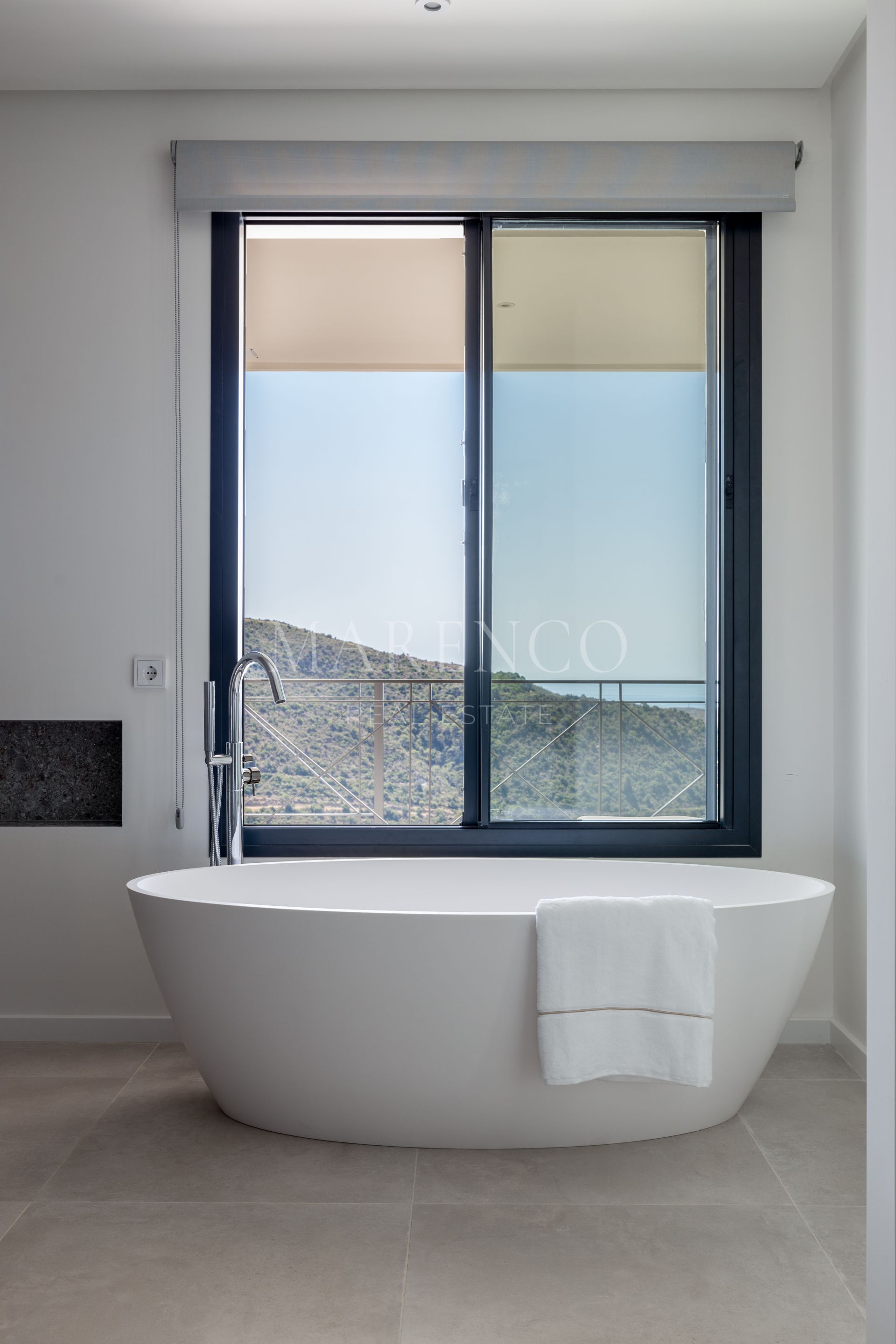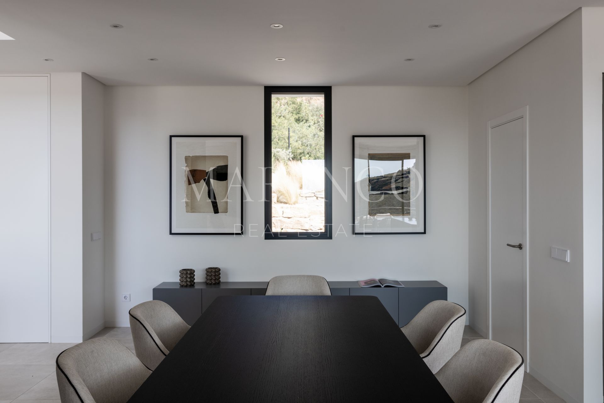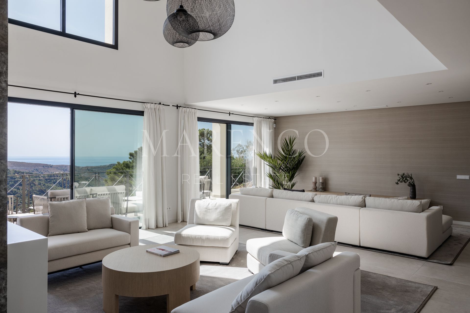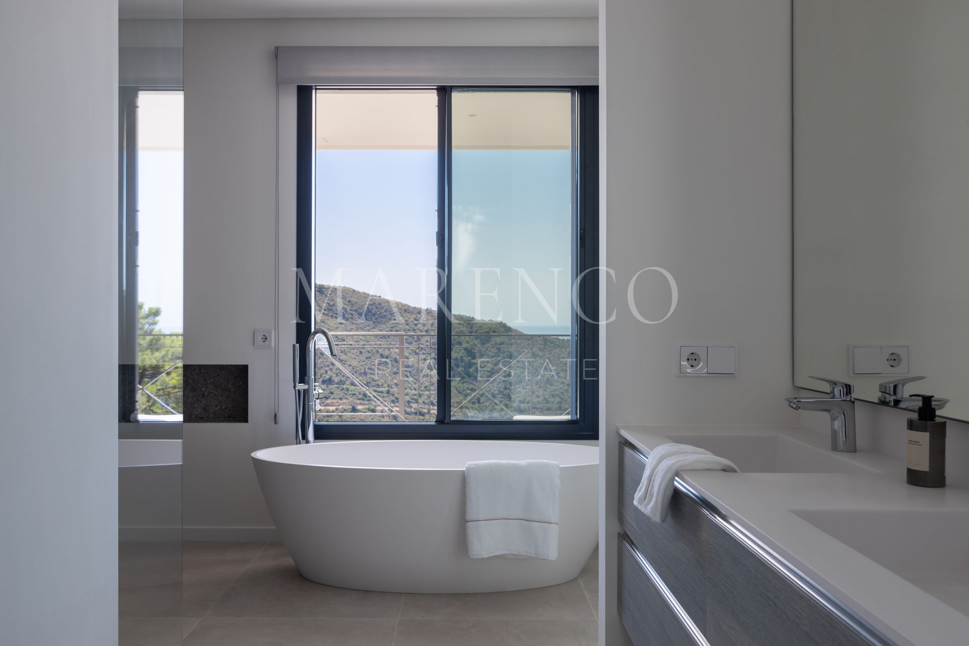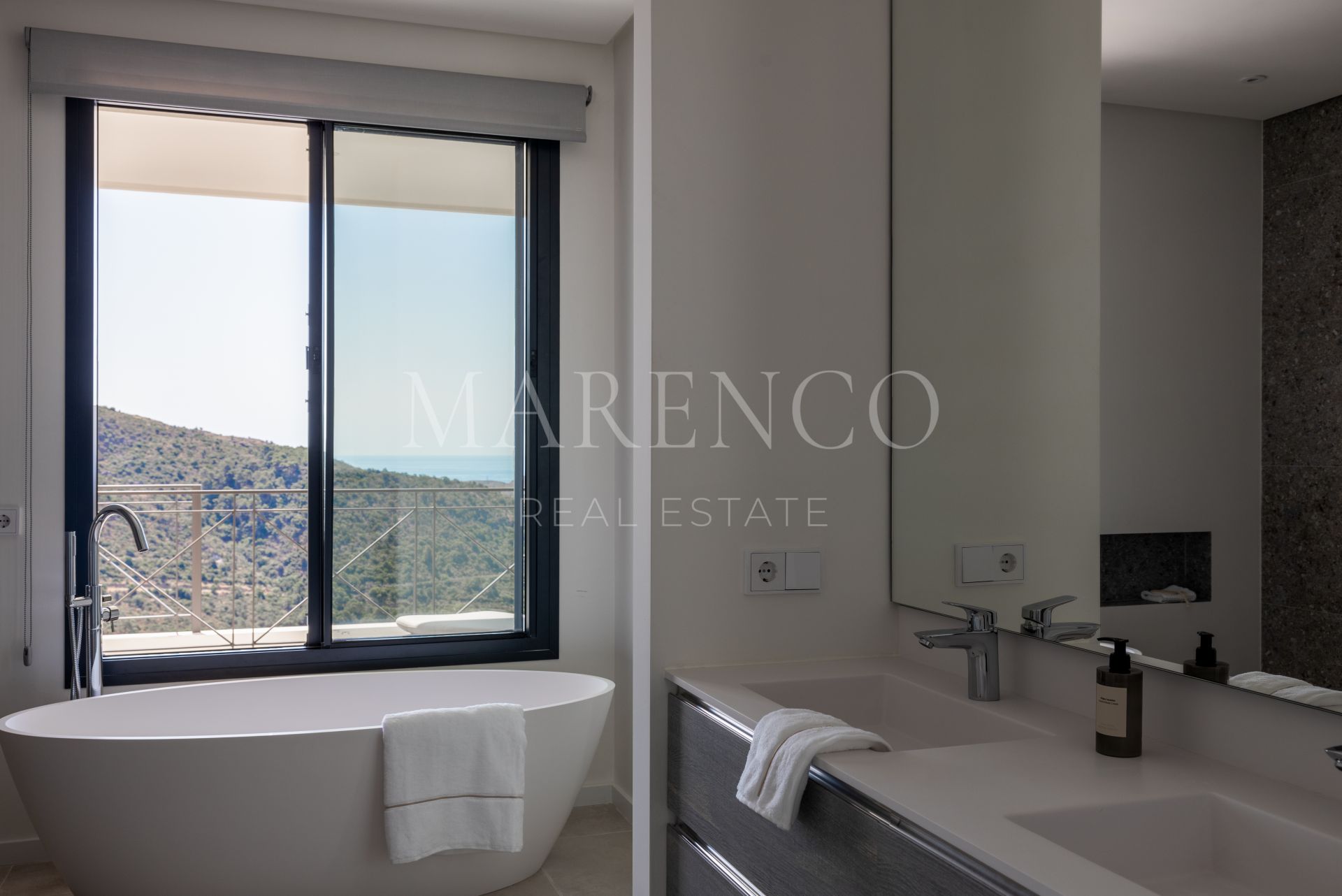 Diese Liegenschaft, orientation Süd-Ost, haben folgende Ausstattung: private terrasse, wohnzimmer, fussboden-kühlsystem, wassertank, nahe ortszentrum, meerblick, ausblick auf landschaft, bergsicht, büroraum, fußbodenheizung im gesamten haus, automatische bewässerungsanlage, hausautomation, waschküche, Überdachte terrasse, elektrische rollläden, einbauschränke, geschlossene wohnanlage, blick auf garten, blick aufs schwimmbad, panoramablick , bergnah, annehmlichkeiten nahebei, klimaanlage, küche ausgestattet, waschküche, offener kamin, nähe golfplatz, offene terrasse, keller, glastüren, abstellraum, offene küche, alarm, balkon, möbel nach wahl, sicherheitseingang, neubau, hervorragender zustand, wohnzimmer, 24std sicherheitsdienst und gästetoilette.