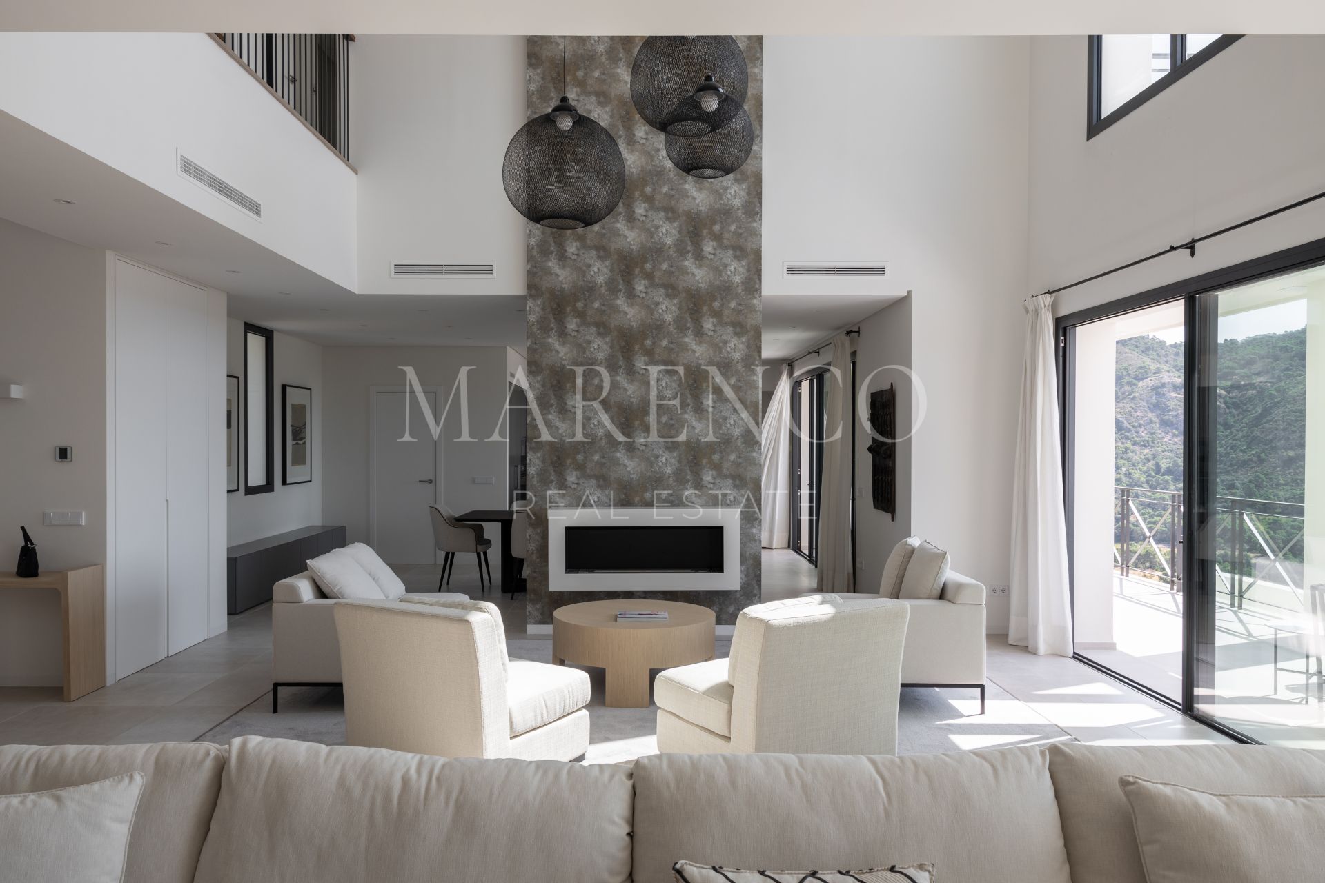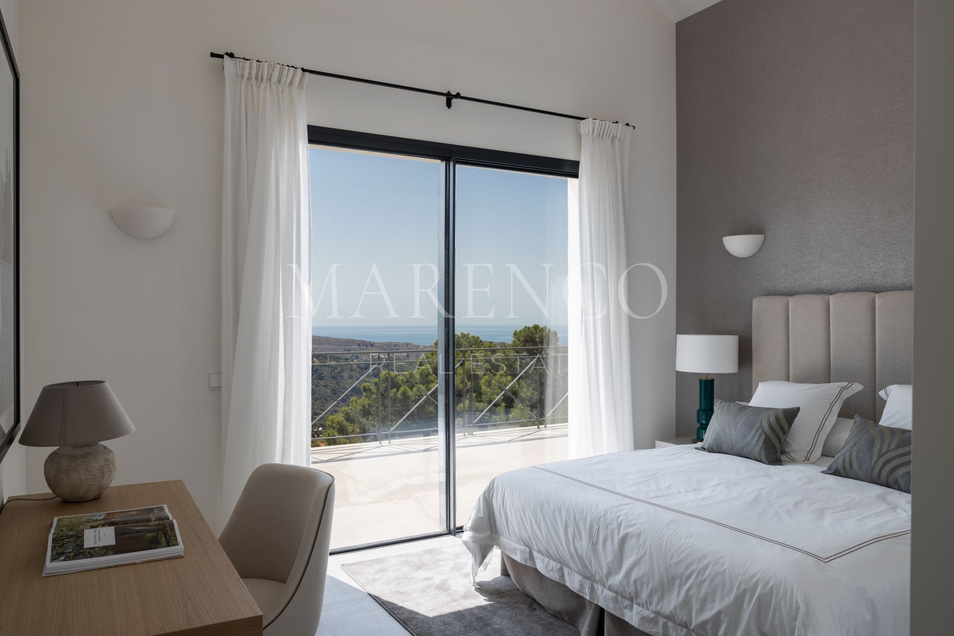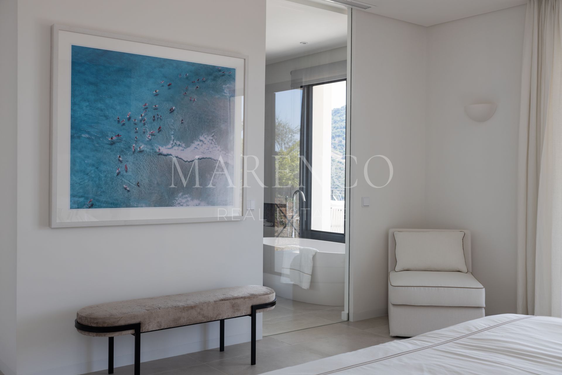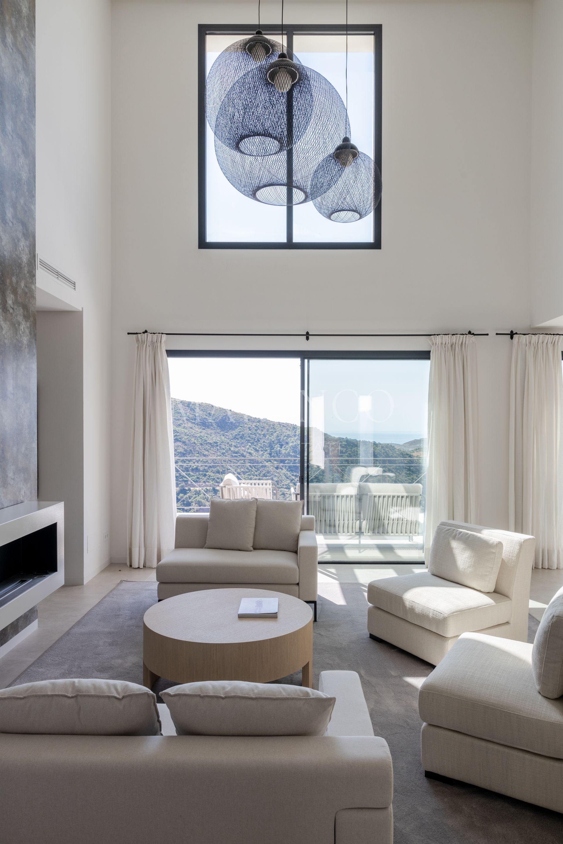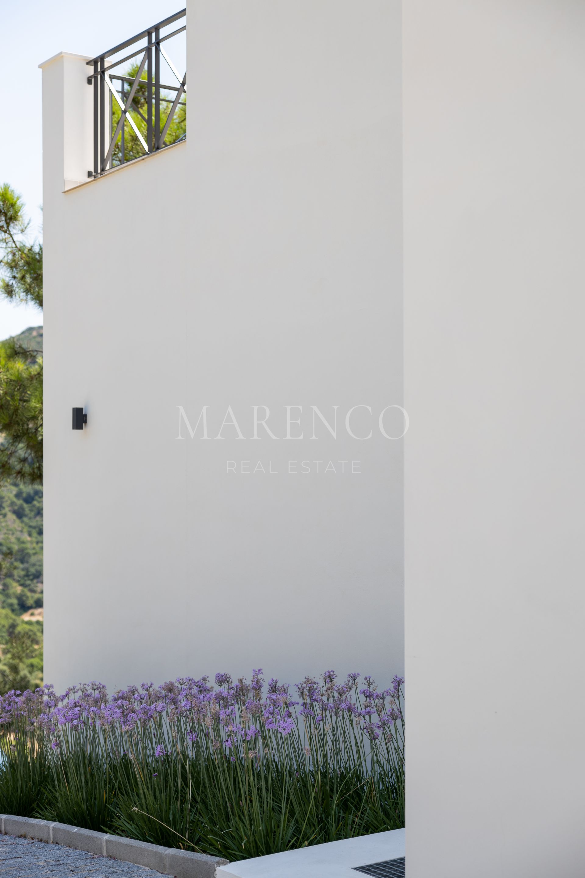 Diese Liegenschaft, orientation Süd-Ost, haben folgende Ausstattung: private terrasse, wohnzimmer, fussboden-kühlsystem, wassertank, nahe ortszentrum, meerblick, ausblick auf landschaft, bergsicht, büroraum, fußbodenheizung im gesamten haus, automatische bewässerungsanlage, hausautomation, waschküche, Überdachte terrasse, elektrische rollläden, einbauschränke, geschlossene wohnanlage, blick auf garten, blick aufs schwimmbad, panoramablick , bergnah, annehmlichkeiten nahebei, klimaanlage, küche ausgestattet, waschküche, offener kamin, nähe golfplatz, offene terrasse, keller, glastüren, abstellraum, offene küche, alarm, balkon, möbel nach wahl, sicherheitseingang, neubau, hervorragender zustand, wohnzimmer, 24std sicherheitsdienst und gästetoilette.