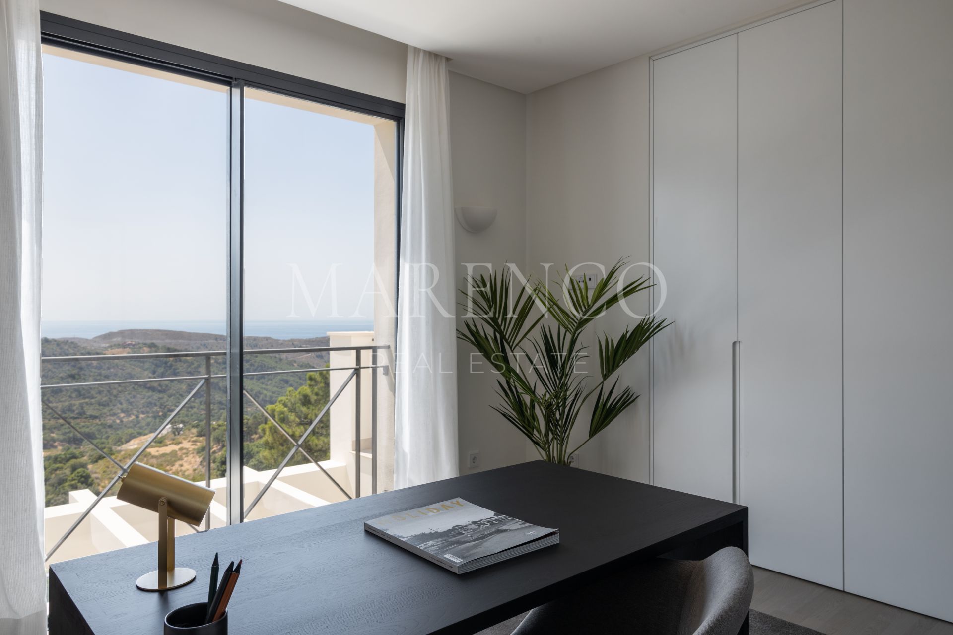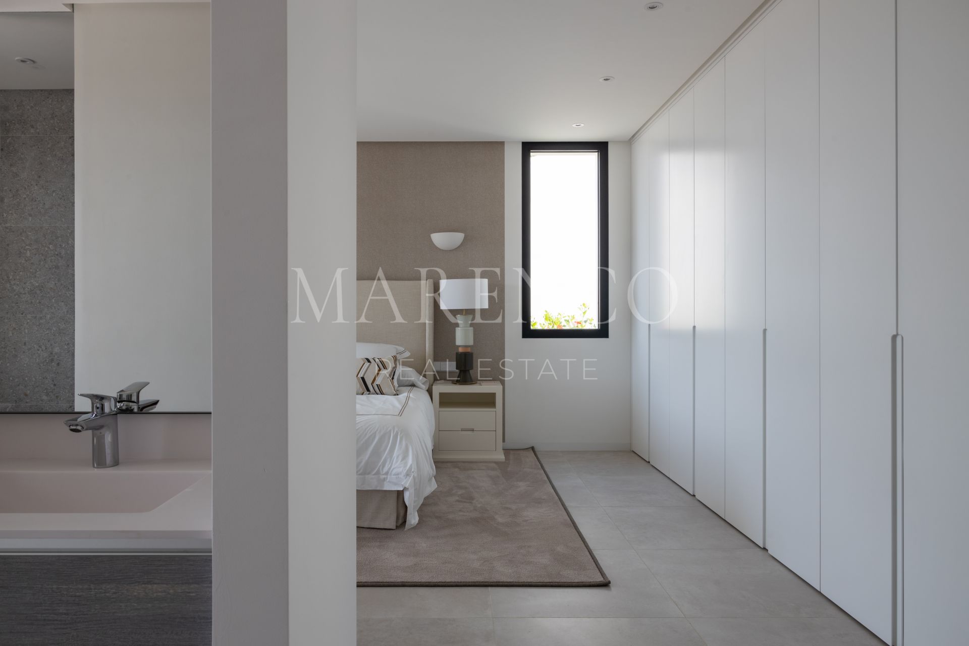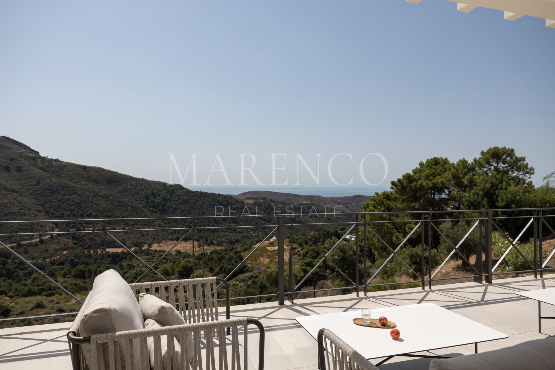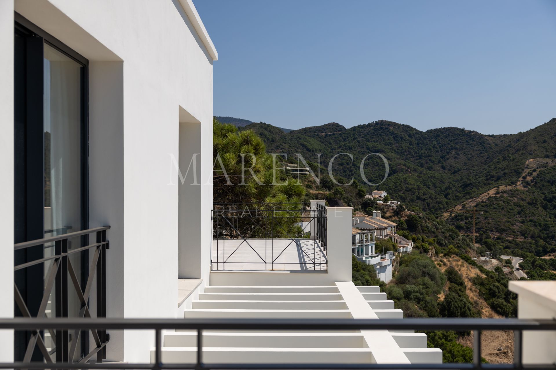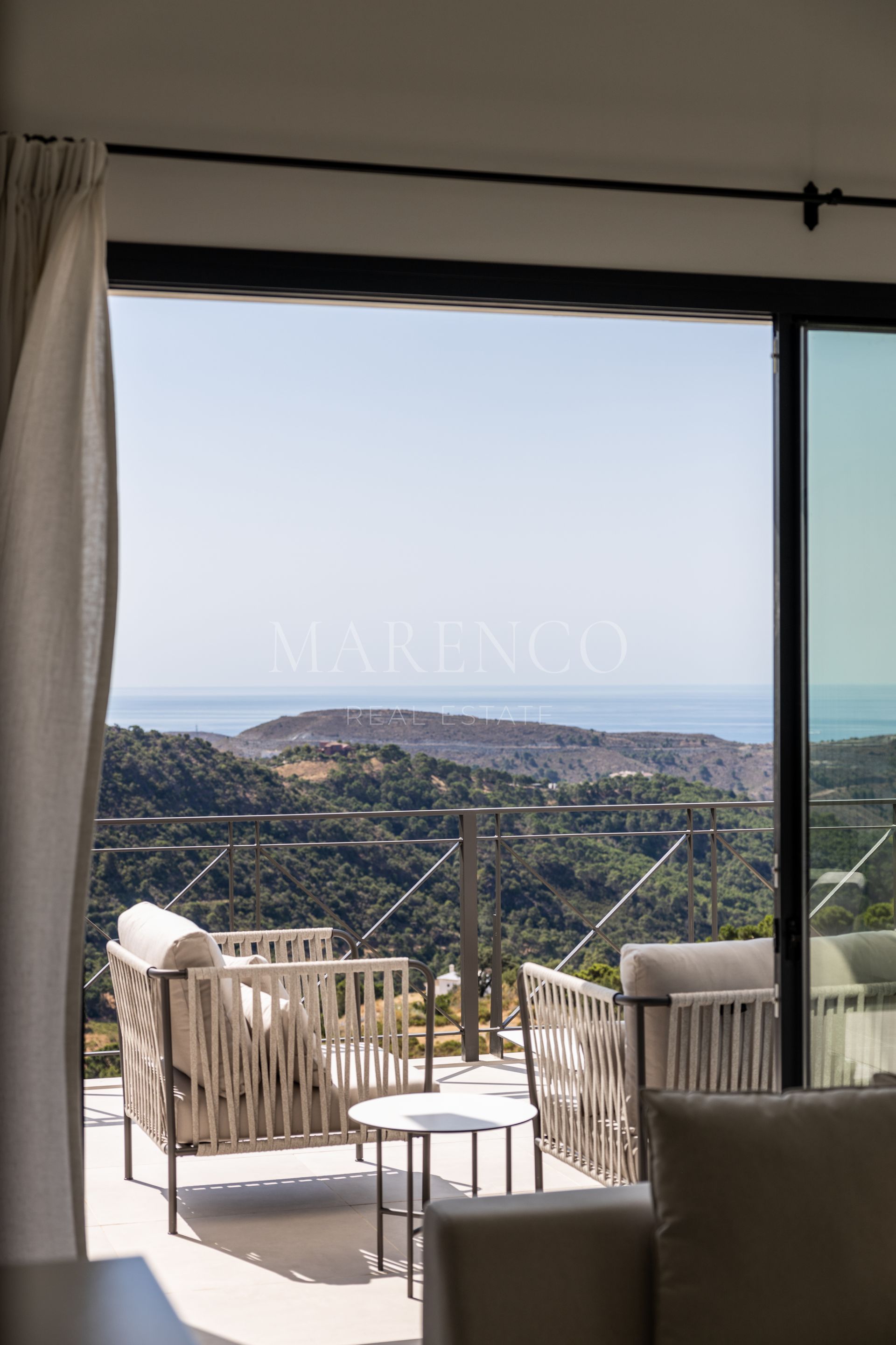 Diese Liegenschaft, orientation Süd-Ost, haben folgende Ausstattung: private terrasse, wohnzimmer, fussboden-kühlsystem, wassertank, nahe ortszentrum, meerblick, ausblick auf landschaft, bergsicht, büroraum, fußbodenheizung im gesamten haus, automatische bewässerungsanlage, hausautomation, waschküche, Überdachte terrasse, elektrische rollläden, einbauschränke, geschlossene wohnanlage, blick auf garten, blick aufs schwimmbad, panoramablick , bergnah, annehmlichkeiten nahebei, klimaanlage, küche ausgestattet, waschküche, offener kamin, nähe golfplatz, offene terrasse, keller, glastüren, abstellraum, offene küche, alarm, balkon, möbel nach wahl, sicherheitseingang, neubau, hervorragender zustand, wohnzimmer, 24std sicherheitsdienst und gästetoilette.