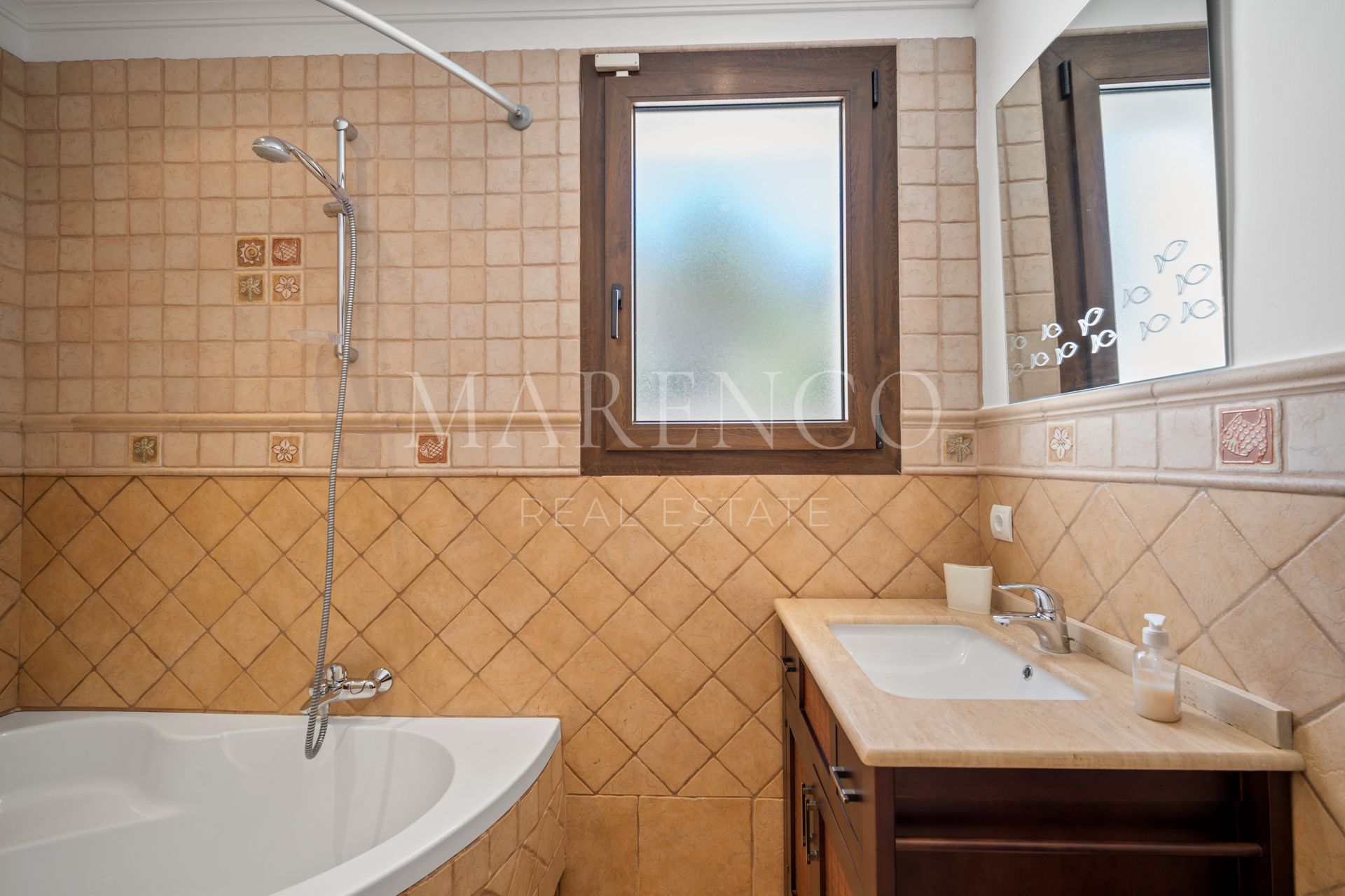 Diese Liegenschaft, orientation Südwesten, haben folgende Ausstattung: private terrasse, nähe ortszentrum, meerblick, landschaftlicher ausblick, bergsicht, Überdachte terrasse, geschlossene wohnanlage, blick auf garten, blick aufs schwimmbad, panoramablick , hanglage, küche komplett ausgestattet, waschküche, offener kamin, nähe golfplatz, offene terrasse, kellergeschoss, spielzimmer, glastüren, gästezimmer, abstellraum, alarm, hervorragender zustand, grill und 24std sicherheitsdienst.