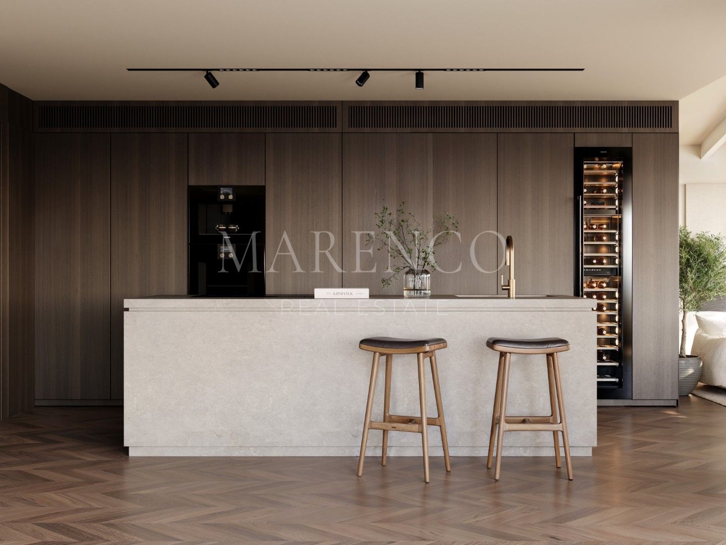 Mit einer bebauten Fläche von 312 m² auf einem 921 m² großen Grundstück sowie großzügigen Terrassen mit insgesamt 191 m² verfügt die Villa über 5 Schlafzimmer und 5+2 Badezimmer. Das Erdgeschoss bietet eine offene Küche, die nahtlos in zwei unterschiedliche Wohnbereiche übergeht: einen gemütlichen TV-Bereich sowie ein großzügiges Hauptwohnzimmer mit doppelt hohen Holzdecken. Beide Bereiche sind direkt mit dem Patio und dem Infinity-Pool verbunden. Auf dieser Ebene befinden sich zudem ein Schlafzimmer mit Bad en Suite, ein Hauswirtschaftsraum sowie ein praktisches, unabhängiges Gästehaus im Eingangsbereich – ideal, um Familie oder Gäste mit voller Privatsphäre zu empfangen.