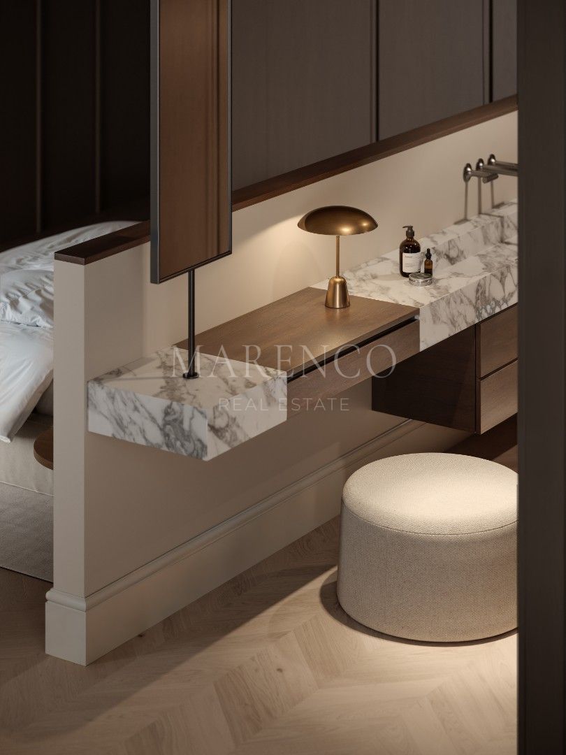 Das Obergeschoss ist vollständig der Master-Suite gewidmet. Sie verfügt über einen maßgefertigten Ankleidebereich, ein Bad en Suite und Zugang zu einer privaten Terrasse mit einer freistehenden Außenbadewanne unter einer Pergola – ein intimer Rückzugsort für absolute Entspannung.
