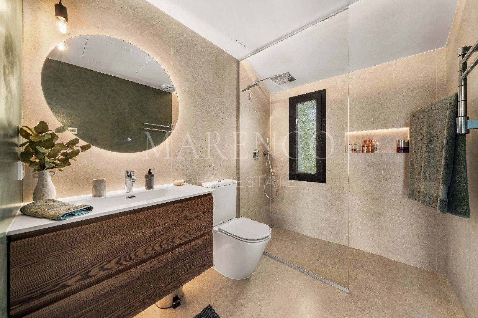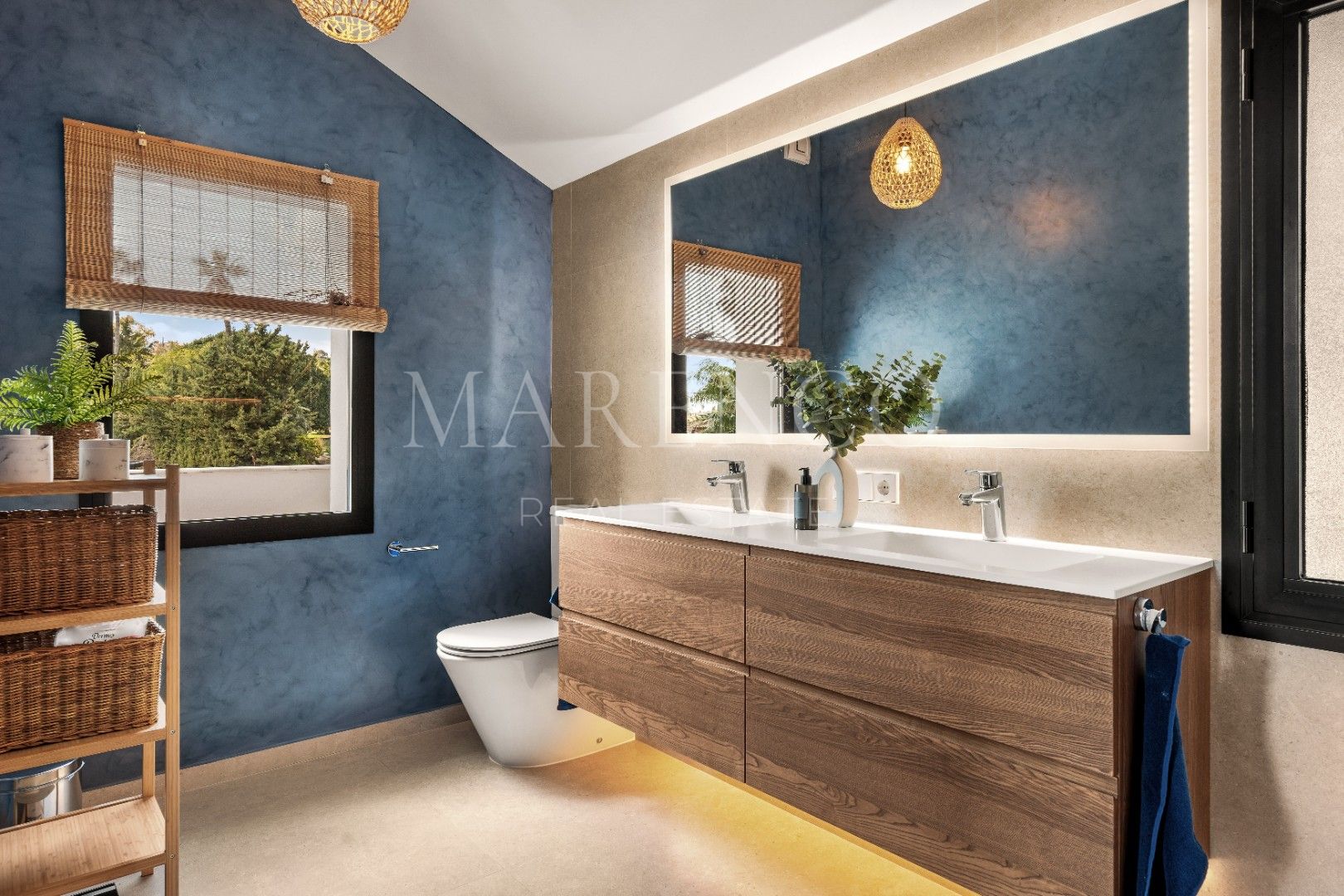 Das Obergeschoss ist dem Hauptschlafbereich gewidmet, wo eine anspruchsvolle Master-Suite mit hohen Decken, Einbauschränken, en-suite Badezimmer und Zugang zu einer privaten Terrasse hervorsticht. Ein zweites Schlafzimmer, ebenfalls mit en-suite Badezimmer, verfügt über eine eigene, nach Südwesten ausgerichtete Terrasse, perfekt, um die langen sonnigen Nachmittage und den Blick auf die Umgebung zu genießen. Das Untergeschoss verleiht dieser Luxusvilla in Nueva Andalucía eine ganz besondere zusätzliche Dimension, mit einem privaten Wellness- und Entertainmentbereich mit Fitnessraum und Lounge, der für Entspannung und Familienleben konzipiert wurde.
