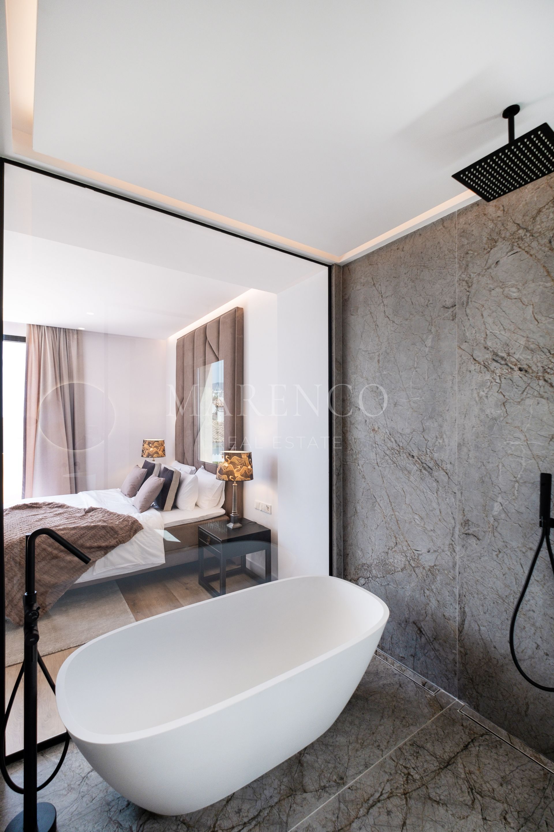 Auch der Außenbereich ist ebenso einladend wie das Innere der Villa. Die überdachte Terrasse führt in den angelegten Garten und verfügt über einen Infinity-Pool, der den Panoramablick auf das Meer unterstreicht. Integrierte Sonnenliegen laden zum Sonnenbaden ein, während ein Sonnendeck, eine Pergola, ein BBQ-Bereich und verschiedene Chill-out-Zonen die perfekte Atmosphäre für gesellige Runden oder ruhige Momente schaffen. Am Abend bietet die Sunset-Terrasse mit einem einzigartigen Open-Air-Kino unter dem Sternenhimmel den idealen Ort für Filmabende im Mondlicht.