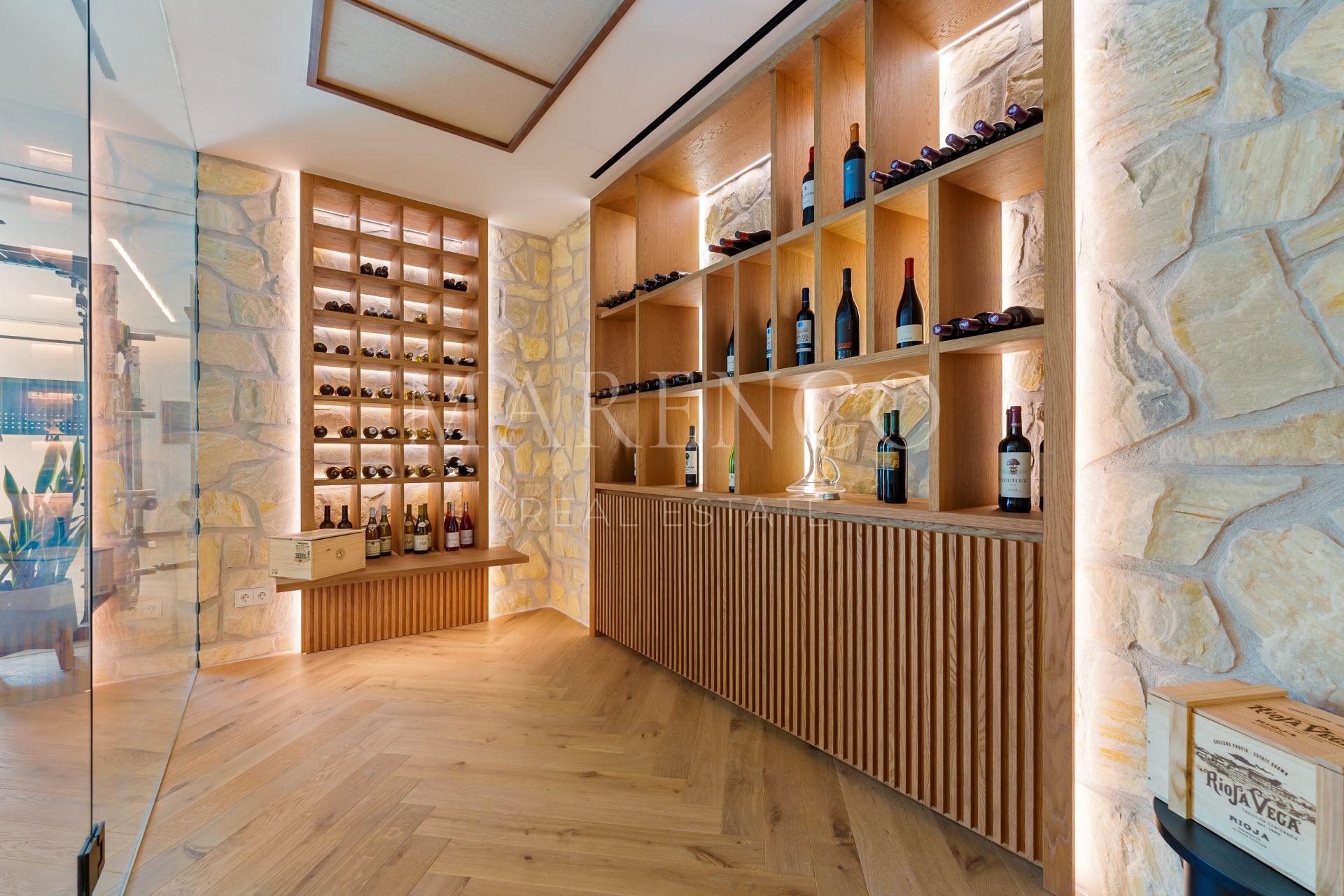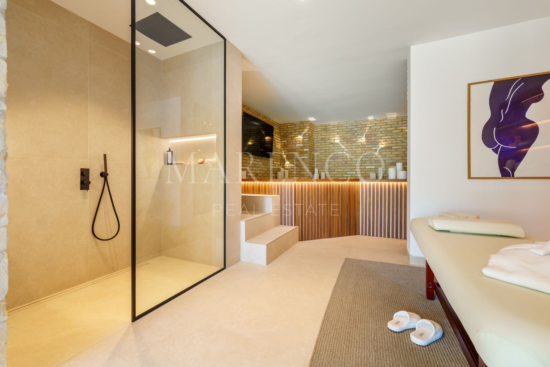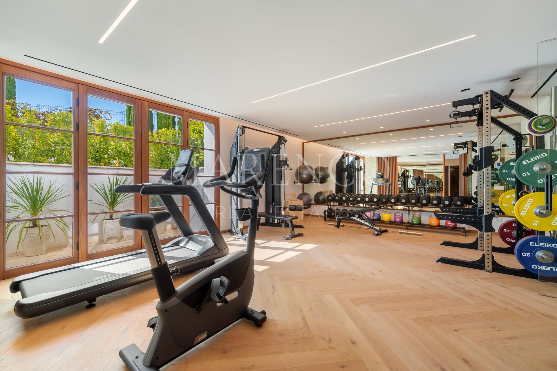 Diese elegante Villa mit 5 Schlafzimmern wurde individuell gestaltet und verfügt über en-suite Badezimmer, großzügige und helle Wohnbereiche mit Kamin sowie eine hochmoderne Küche. Die Master-Suite bietet eine nach Süden ausgerichtete Terrasse, und auch die vier Gästeschlafzimmer sind jeweils mit einem eigenen Bad ausgestattet. Zu den weiteren Highlights zählen ein Weinkeller, ein Unterhaltungsraum, ein Fitnessraum, ein Massageraum, drei Gästetoiletten, ein Waschraum mit vier Maschinen und nun auch ein privater Aufzug, der den Alltag noch komfortabler macht. Der private Salzwasserpool wird ergänzt durch eine nach Süden ausgerichtete Terrasse, eine Lounge, eine voll ausgestattete Außenküche mit Grill sowie eine stilvolle Chill-out-Zone – perfekt, um den mediterranen Lebensstil in vollen Zügen zu genießen.