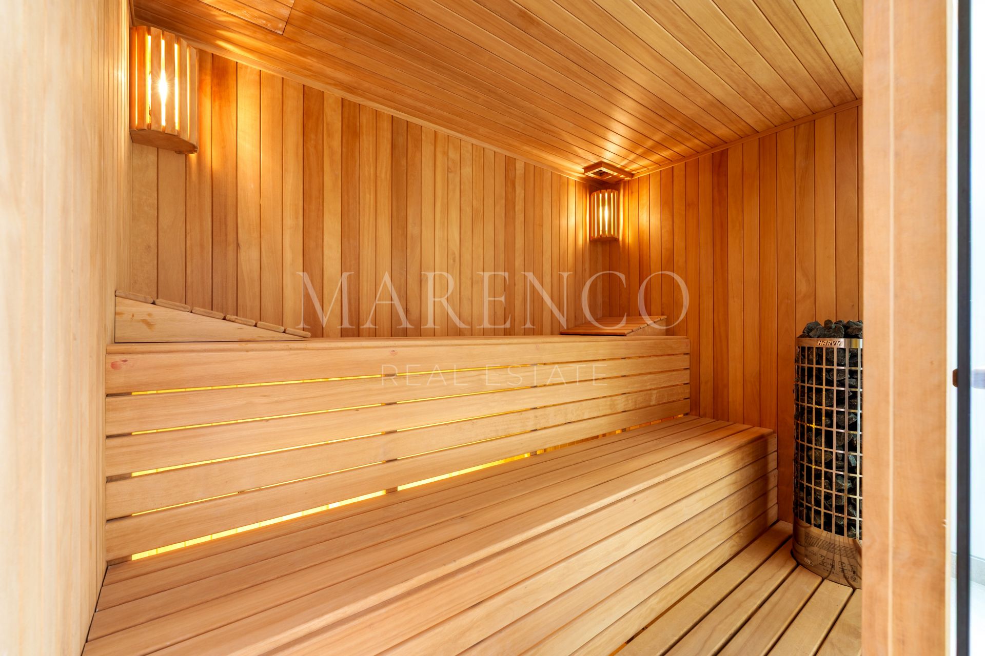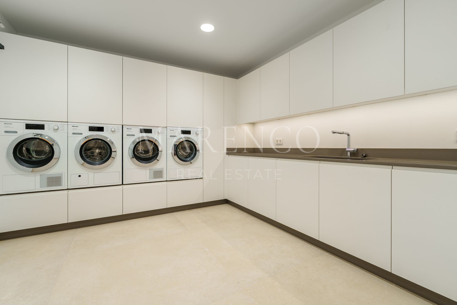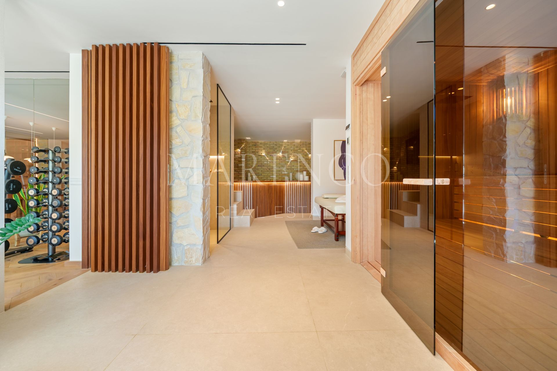 Diese elegante Villa mit 5 Schlafzimmern wurde individuell gestaltet und verfügt über en-suite Badezimmer, großzügige und helle Wohnbereiche mit Kamin sowie eine hochmoderne Küche. Die Master-Suite bietet eine nach Süden ausgerichtete Terrasse, und auch die vier Gästeschlafzimmer sind jeweils mit einem eigenen Bad ausgestattet. Zu den weiteren Highlights zählen ein Weinkeller, ein Unterhaltungsraum, ein Fitnessraum, ein Massageraum, drei Gästetoiletten, ein Waschraum mit vier Maschinen und nun auch ein privater Aufzug, der den Alltag noch komfortabler macht. Der private Salzwasserpool wird ergänzt durch eine nach Süden ausgerichtete Terrasse, eine Lounge, eine voll ausgestattete Außenküche mit Grill sowie eine stilvolle Chill-out-Zone – perfekt, um den mediterranen Lebensstil in vollen Zügen zu genießen.