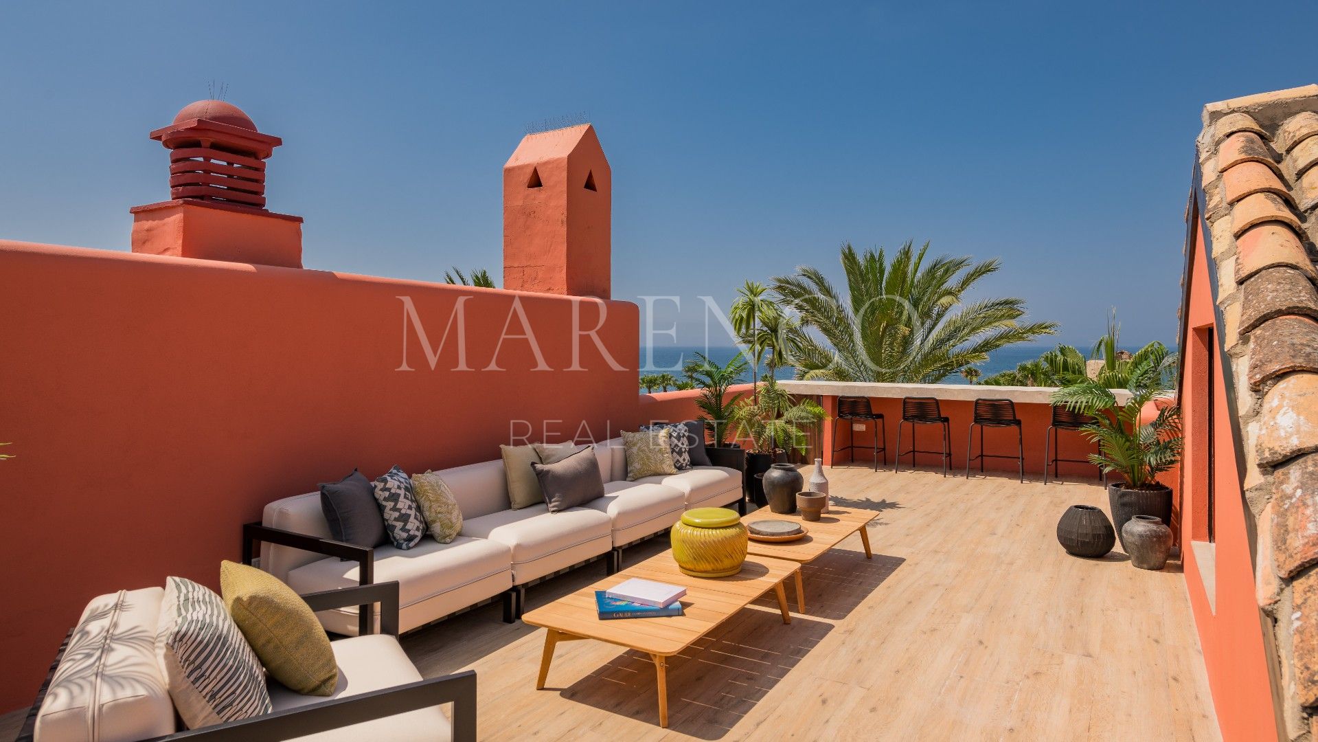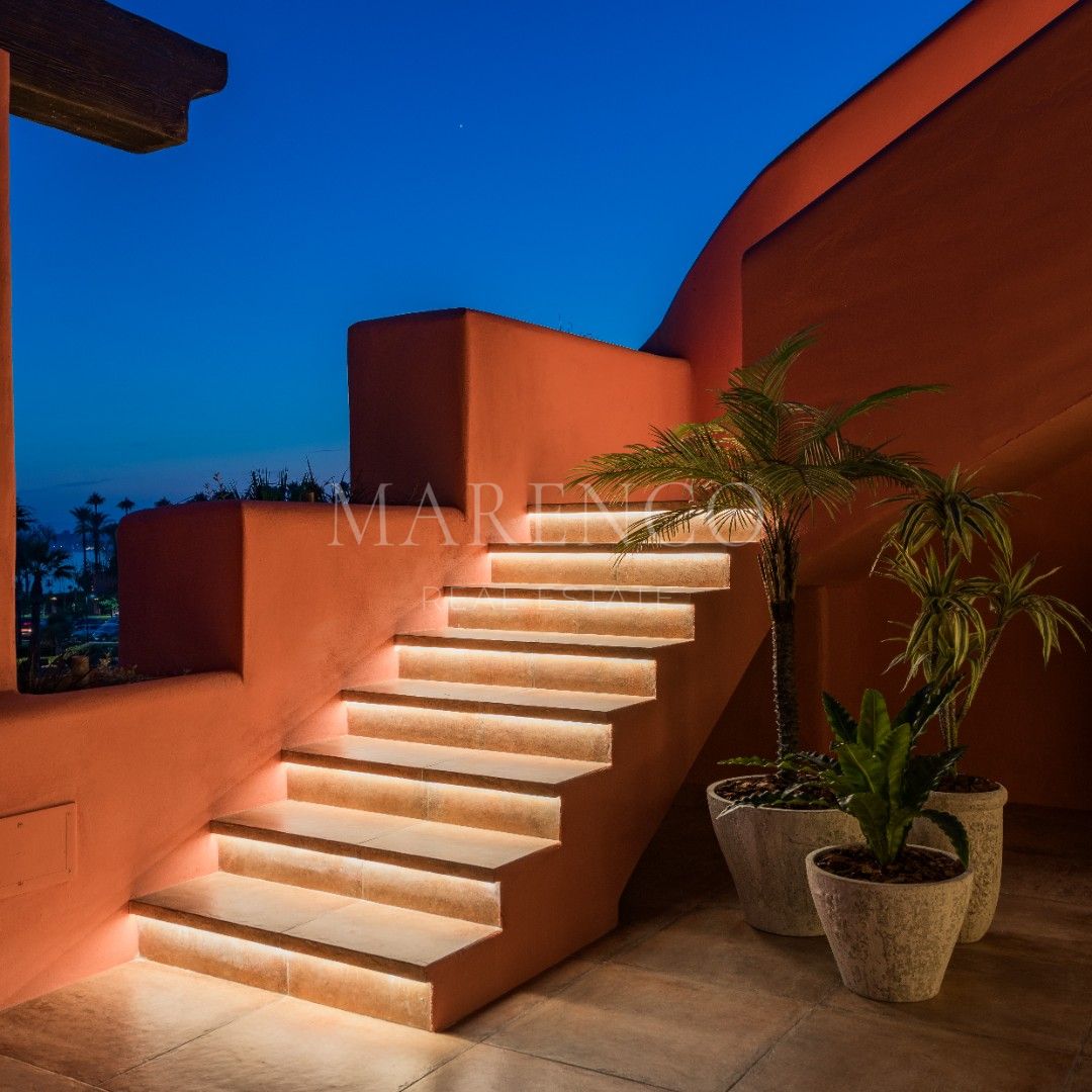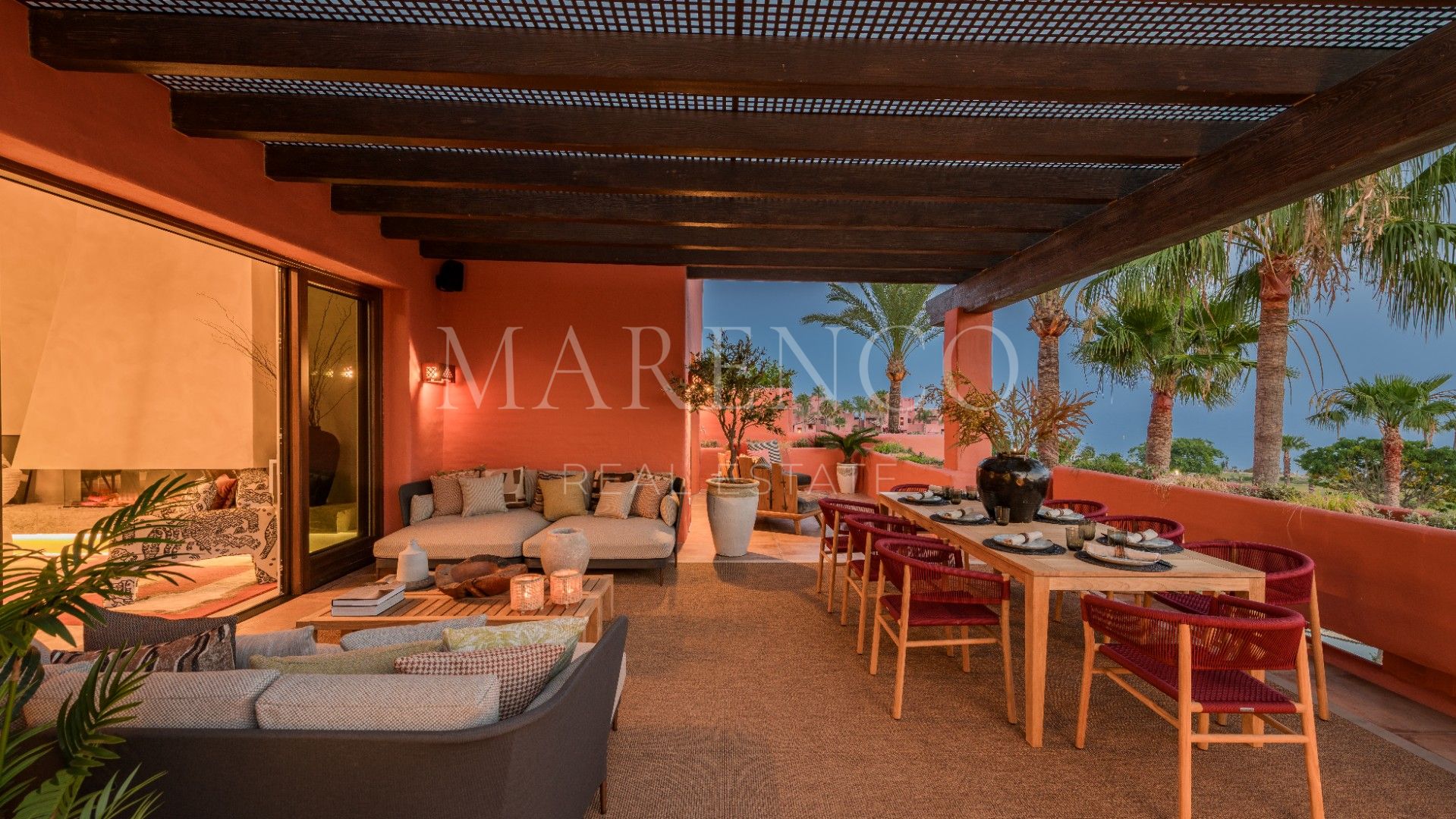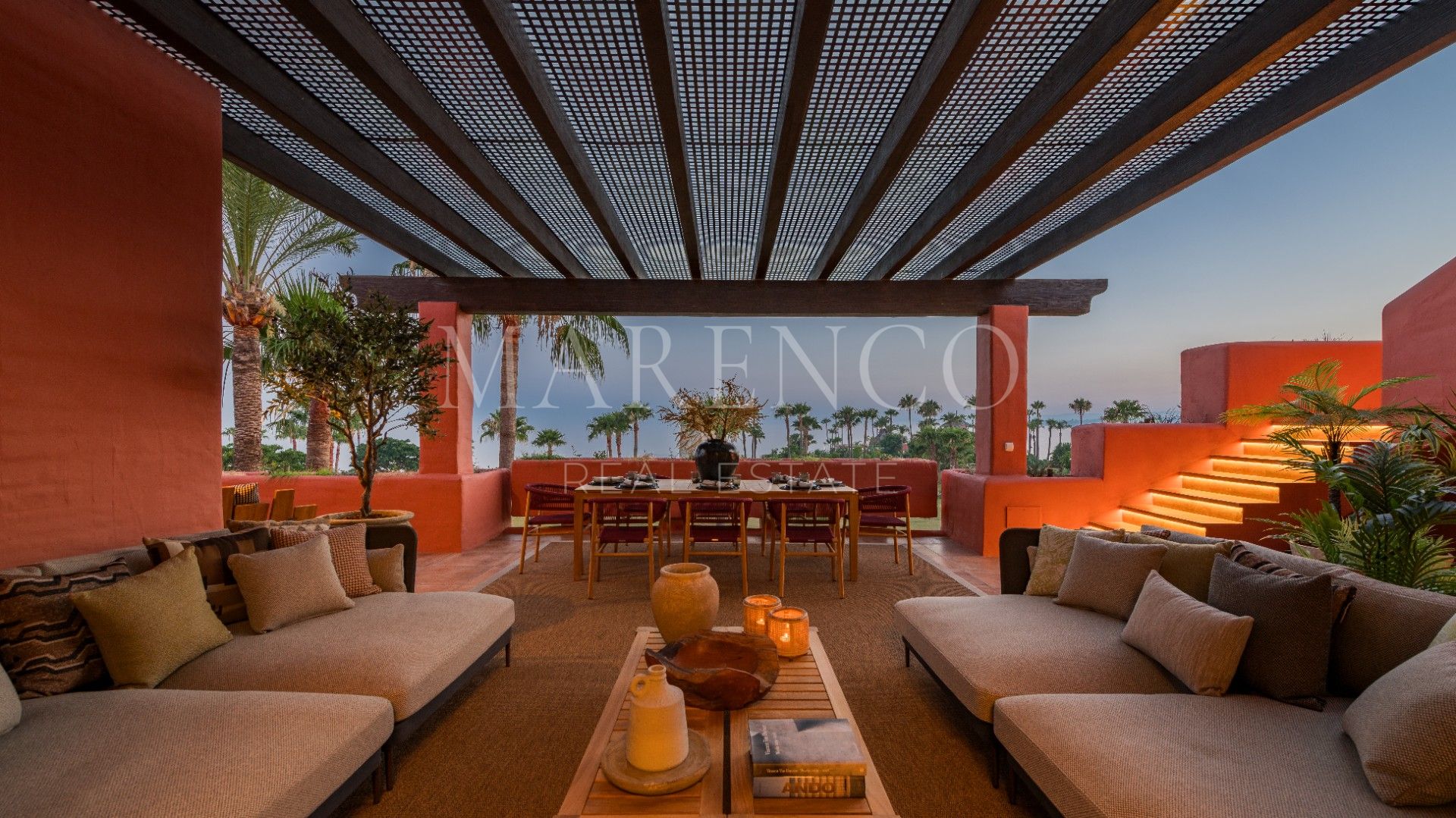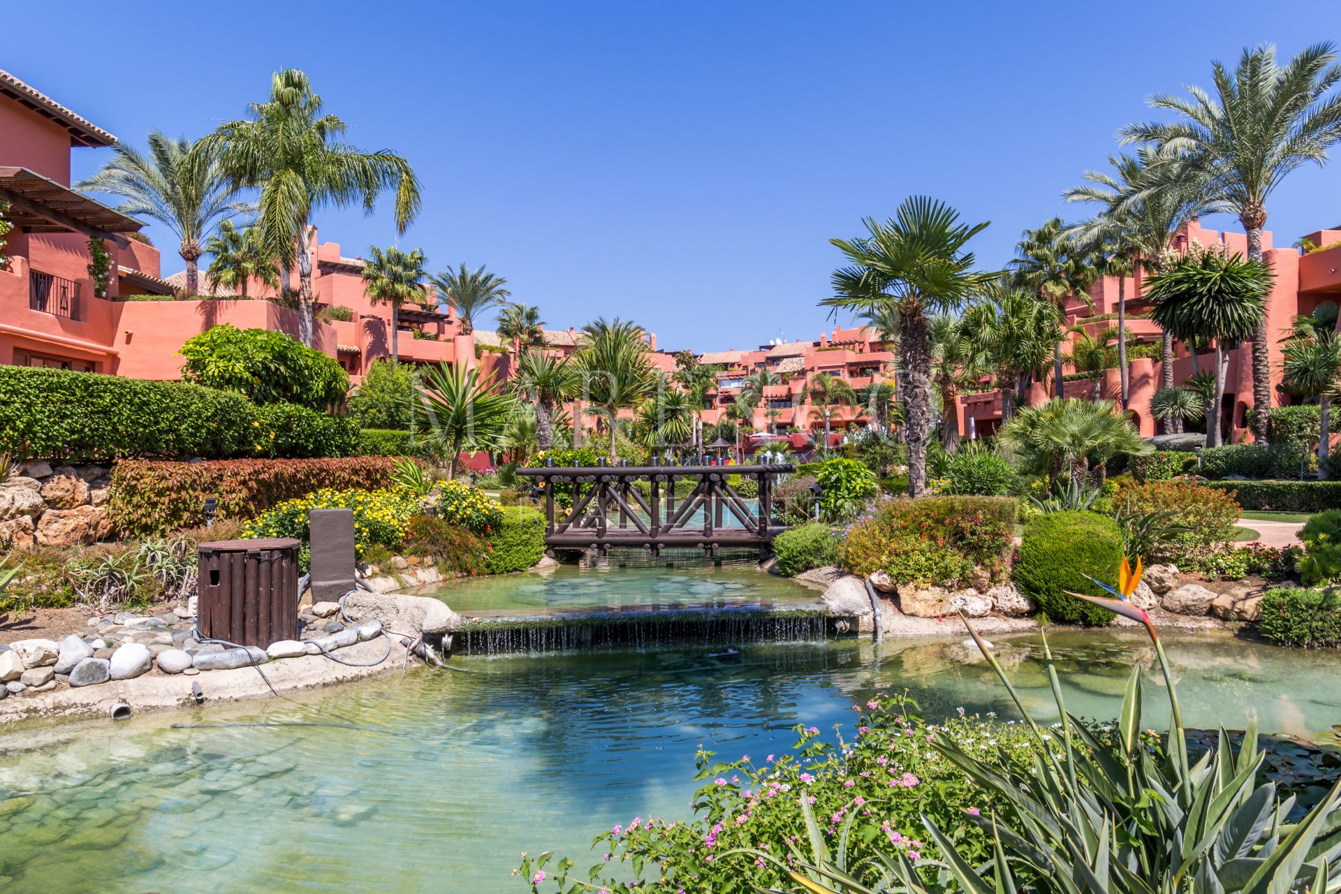 Erdgeschosswohnung zu verkaufen in Torre Bermeja, Estepona Ost mit 3 Schlafzimmer, 2 Badezimmer und hat Schwimmbad (gemeinschaftlich), garage (privat) und Garten (privat). Maße: 146m² Gebaut und 55m² Terrasse.