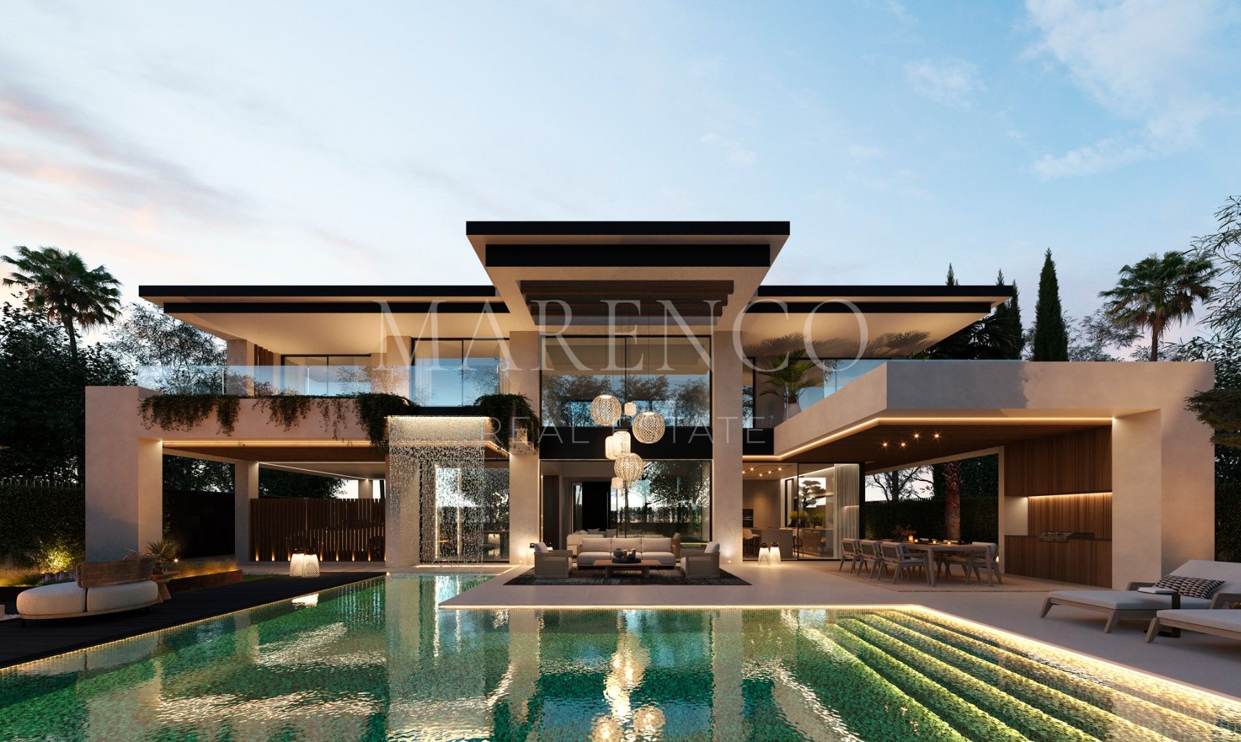 L’espace extérieur comprend un jardin avec une piscine à différentes profondeurs, un Pool Bar, une cascade depuis la terrasse et une salle à manger couverte. L’étage supérieur dispose d’une chambre principale avec dressing, salle de bain en suite, ainsi que deux autres chambres avec salles de bain en suite. Le solarium possède sa propre piscine et un espace barbecue.