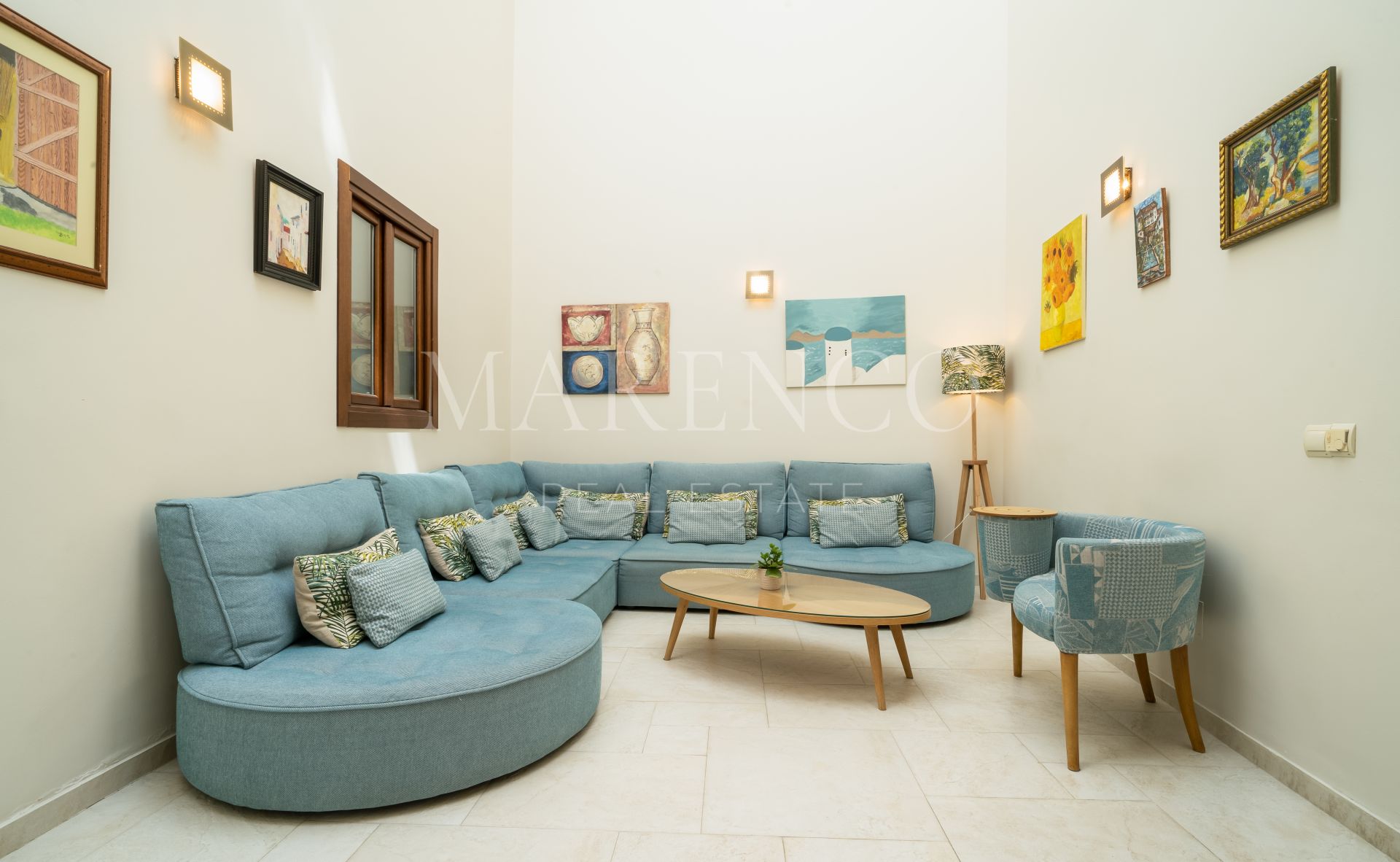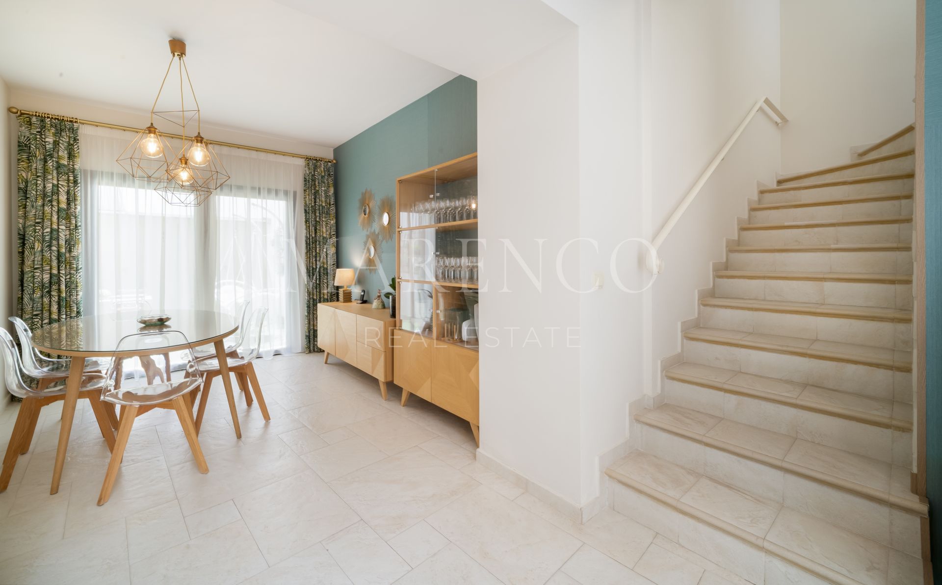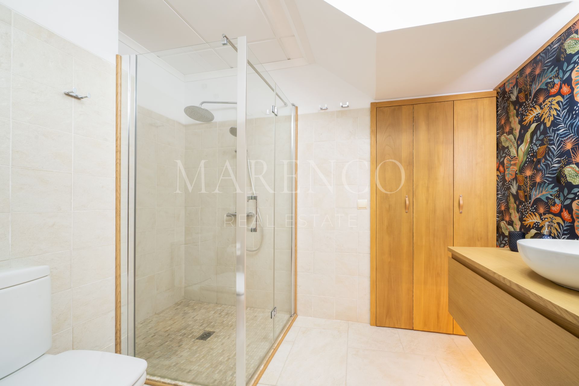 Distributed over 3 levels, it has 4 bedrooms and 3 bathrooms, a bright double-height living room with a dining area and direct access to the private terrace on the first floor, and also, a fully fitted kitchen.