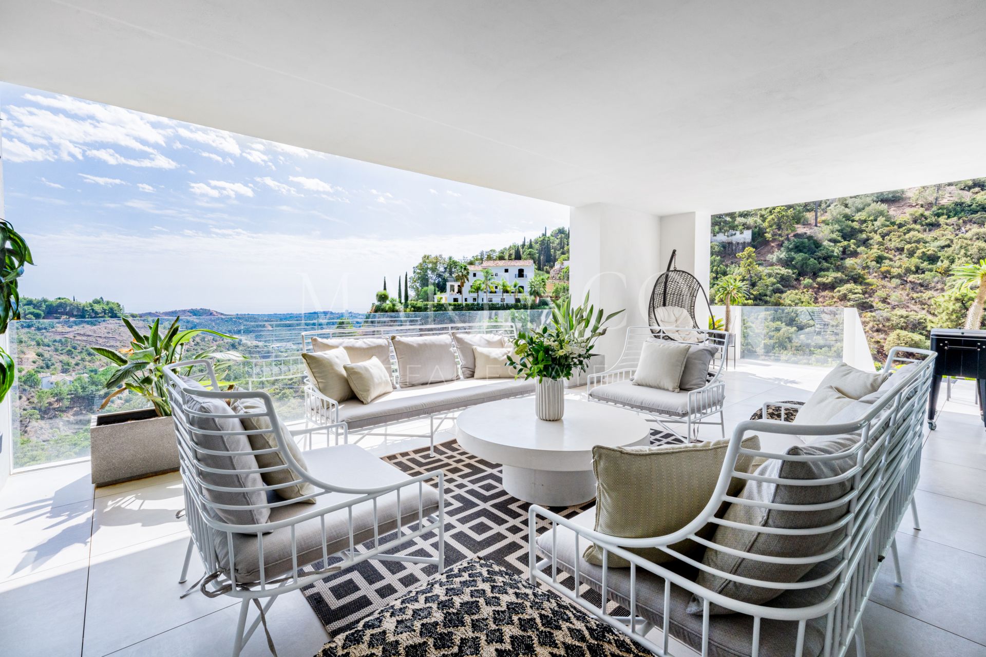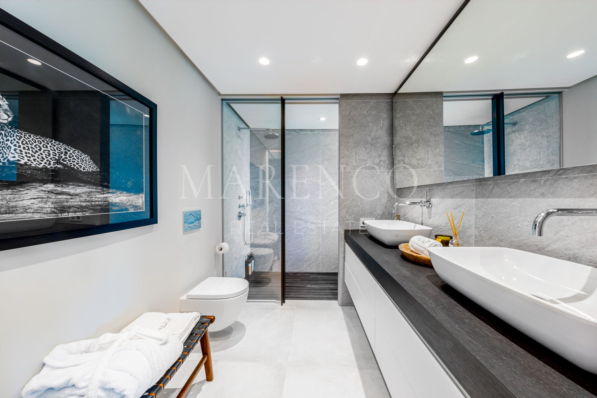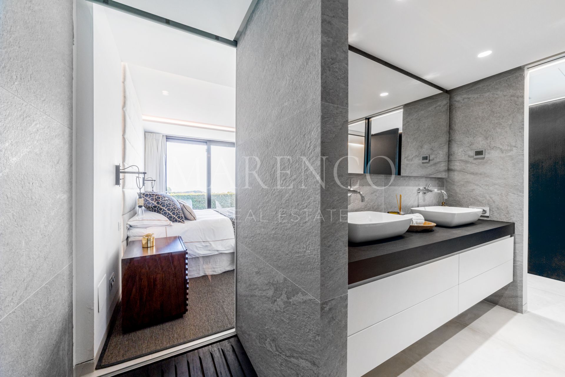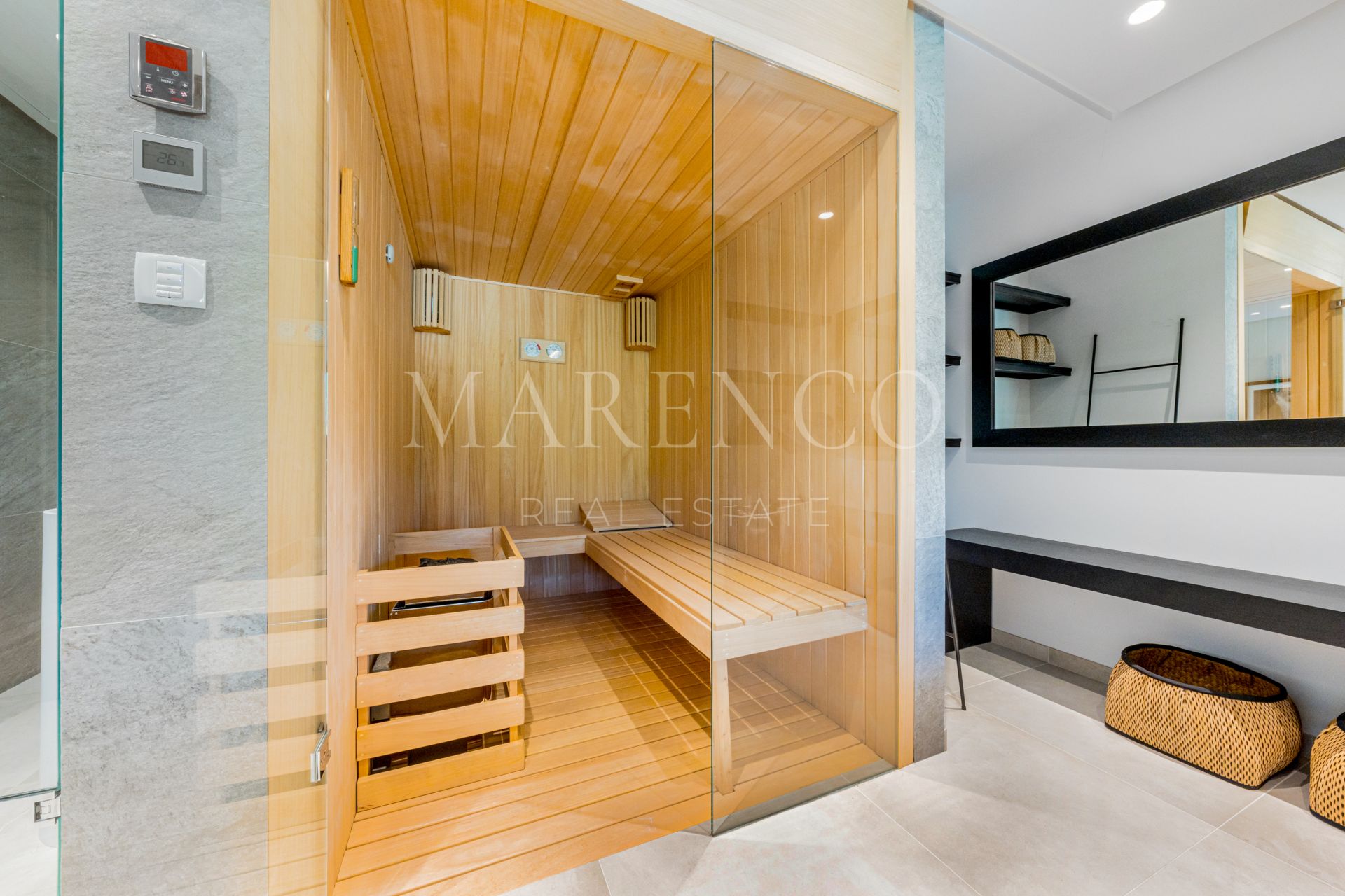 The spacious terraces offer multiple outdoor living and dining areas, ideal for enjoying the weather and the scenery. Furthermore, there is a private swimming pool with chiringuito / barbecue, a fully equipped gym and spa area, a lift, a wine cellar, a fully equipped Gaggenau kitchen, and a garage with space for 3 vehicles.