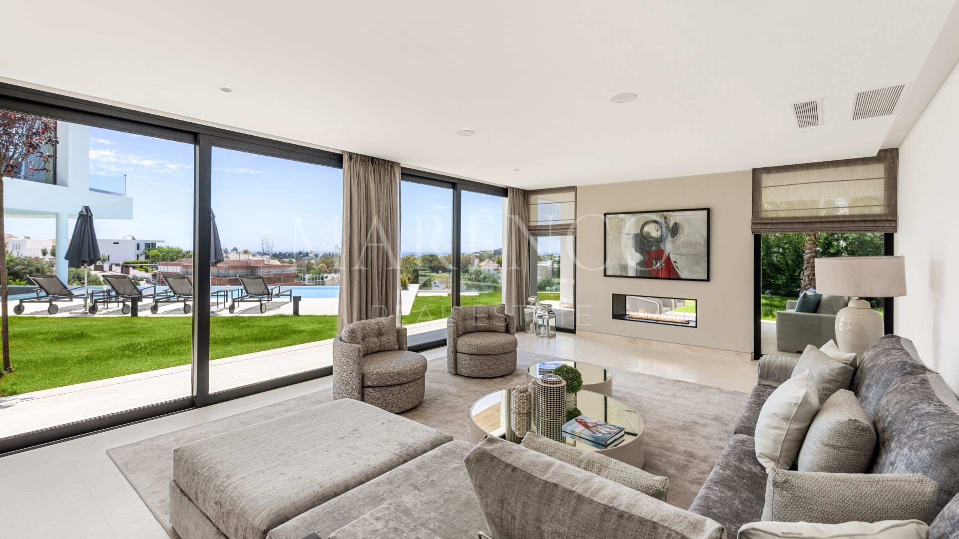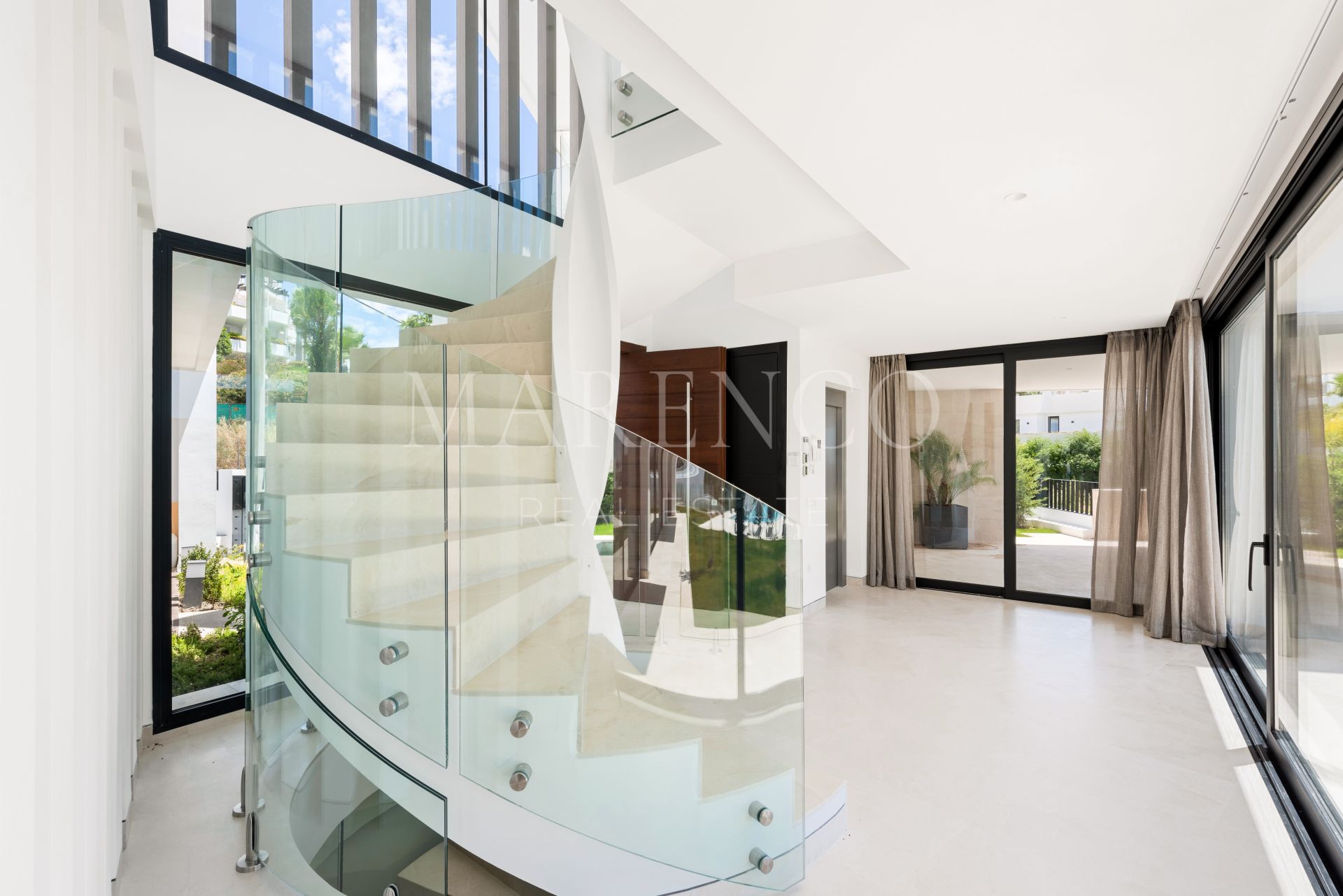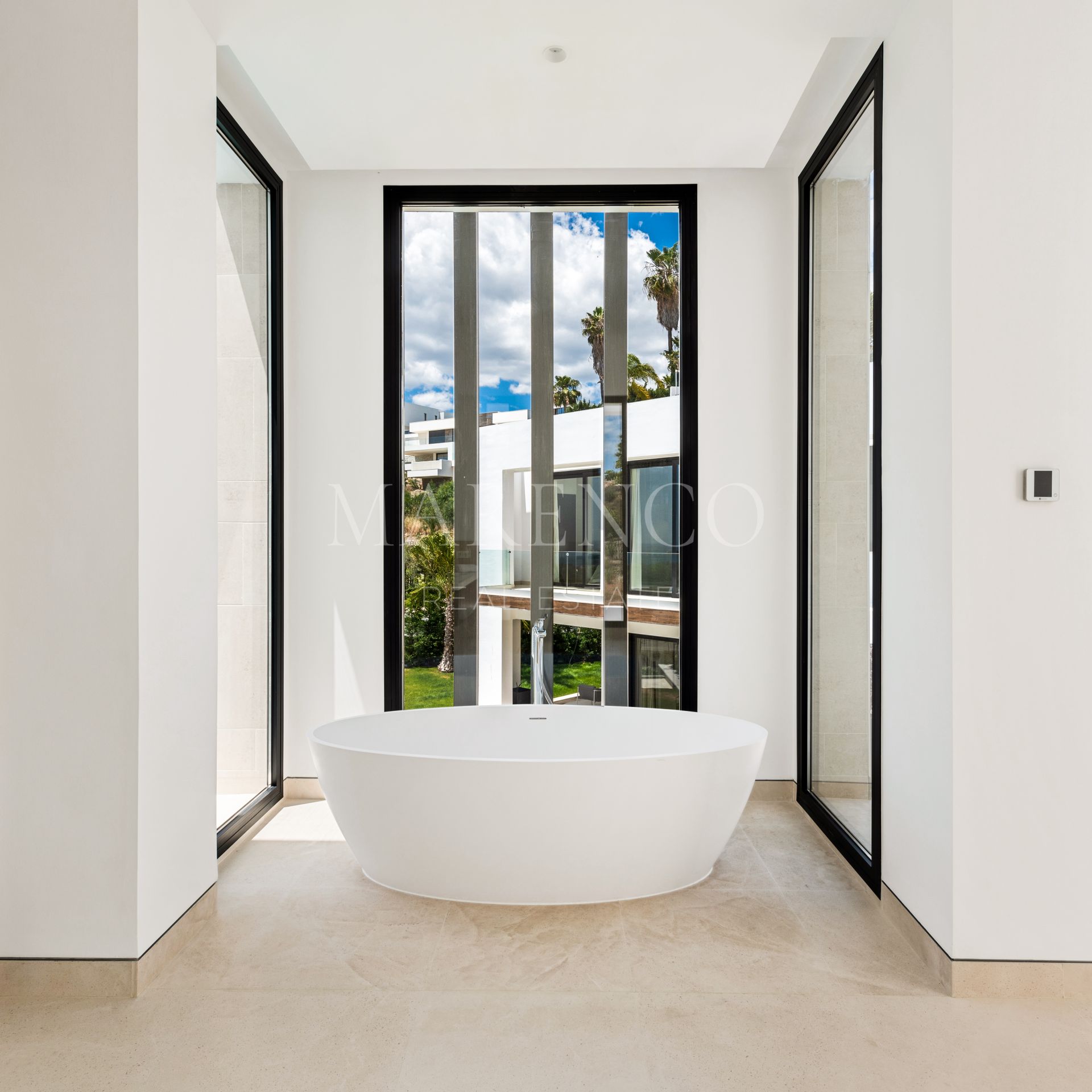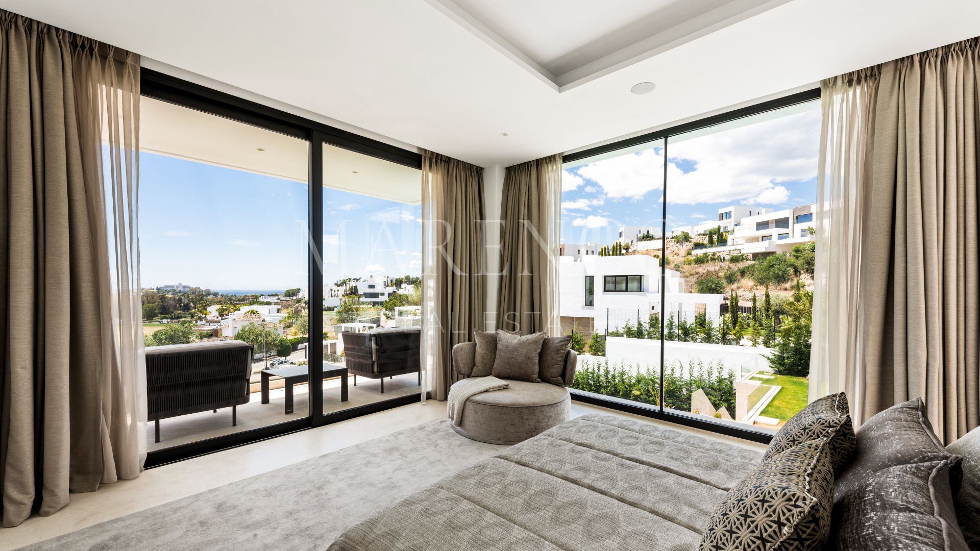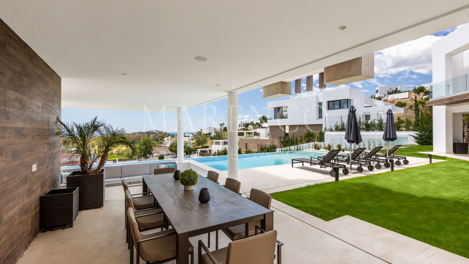 This modern villa is located in the area of La Alquería, in the municipality of Benahavís. Surrounded by golf courses, and nearby amenities, and is only a few minutes’ drive from Marbella town.