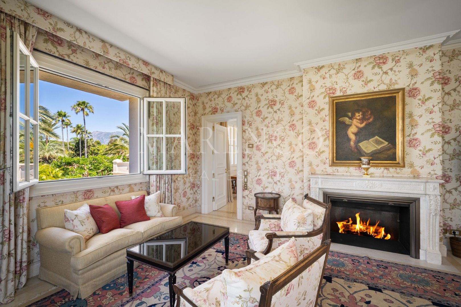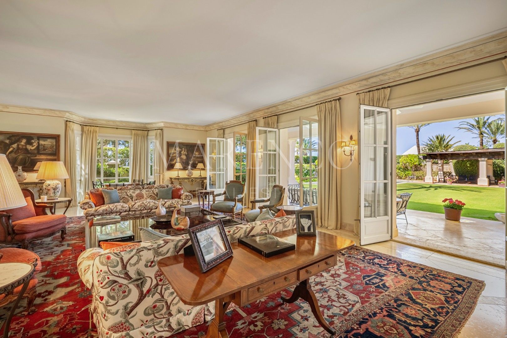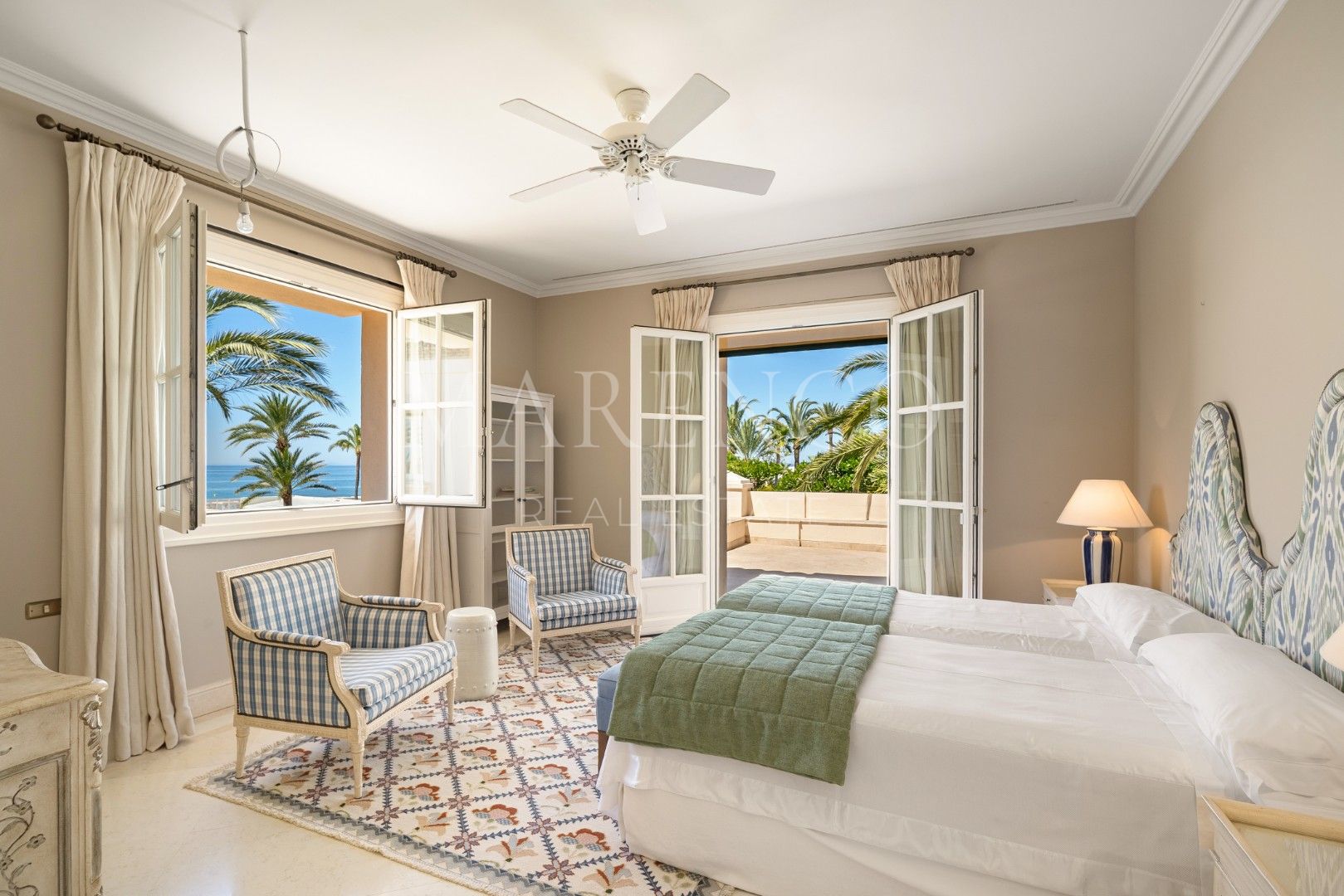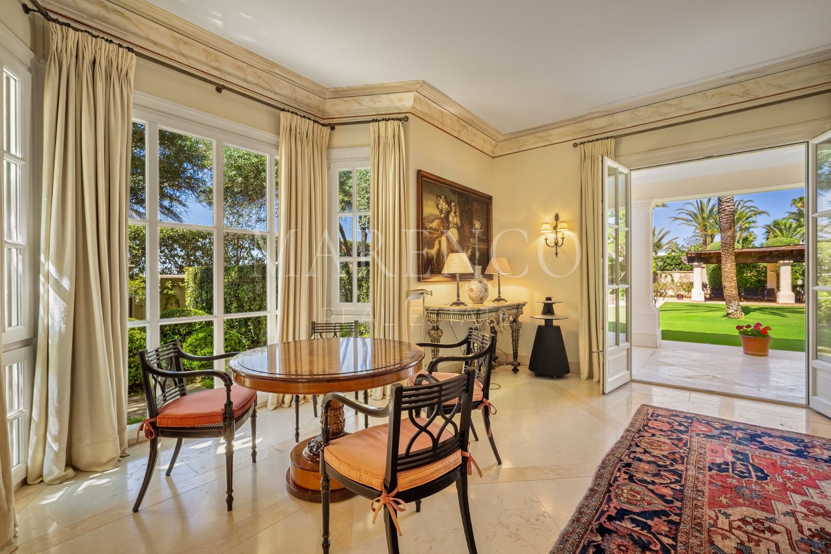 Casa de Jabalí is a prime beachfront estate in Los Monteros, Marbella East, offering an exceptional location just steps from the sea. This elegant property features classical architecture with a seamless indoor-outdoor flow, maximising space and natural light. The grand entry foyer leads to spacious living areas, including an impressive formal dining room and a large kitchen with a central island and modern appliances—ideal for both daily living and entertaining.