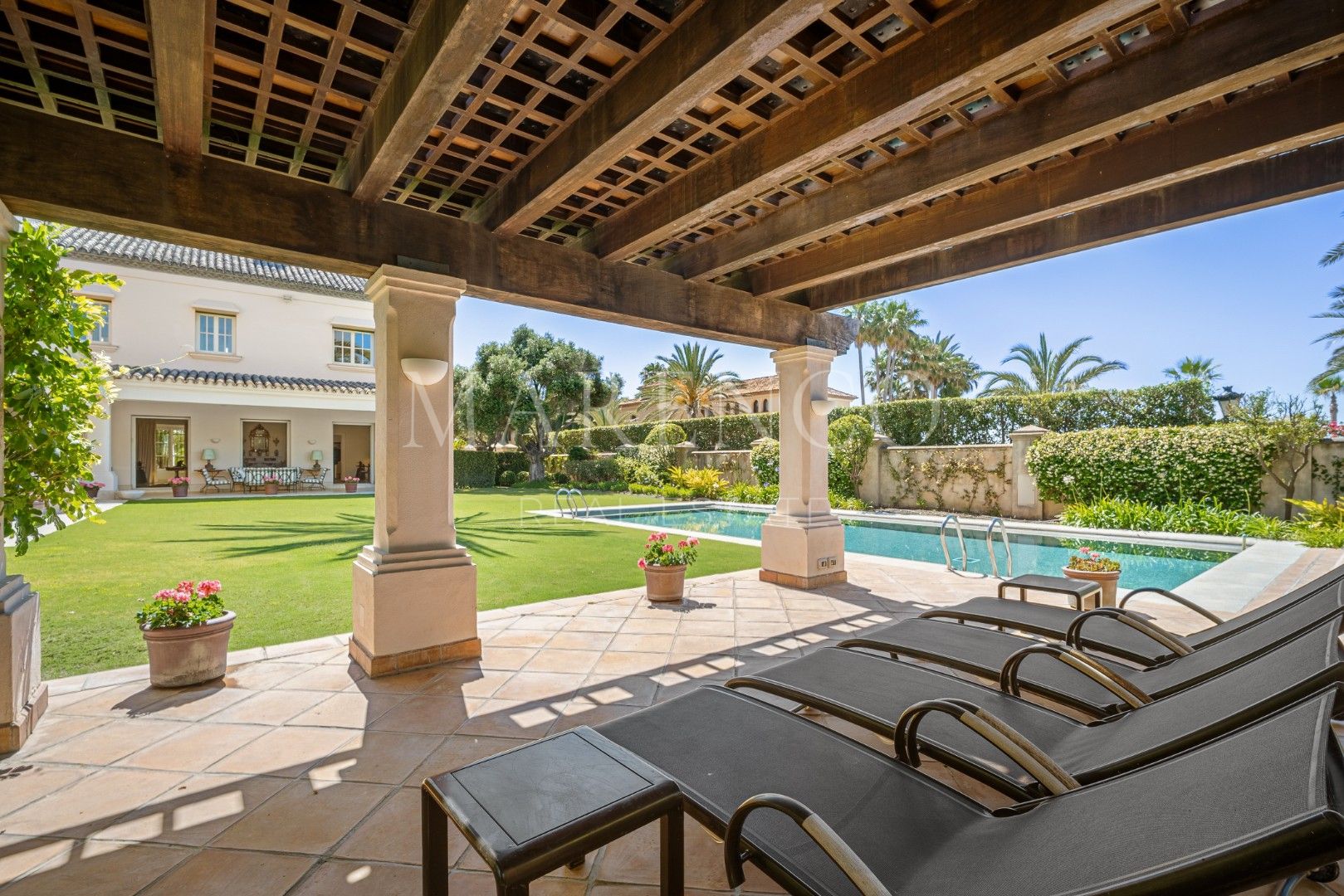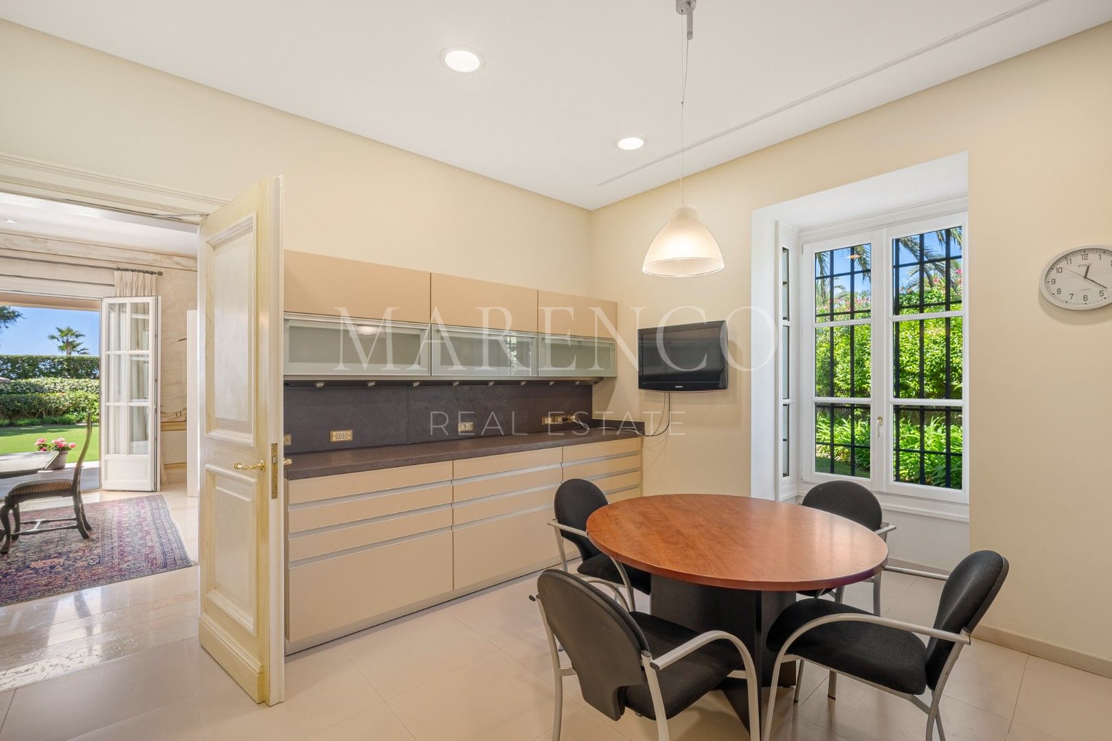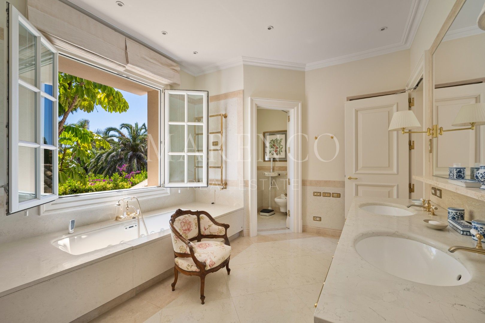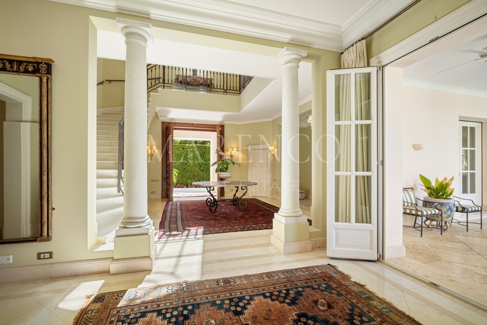 Casa de Jabalí is a prime beachfront estate in Los Monteros, Marbella East, offering an exceptional location just steps from the sea. This elegant property features classical architecture with a seamless indoor-outdoor flow, maximising space and natural light. The grand entry foyer leads to spacious living areas, including an impressive formal dining room and a large kitchen with a central island and modern appliances—ideal for both daily living and entertaining.