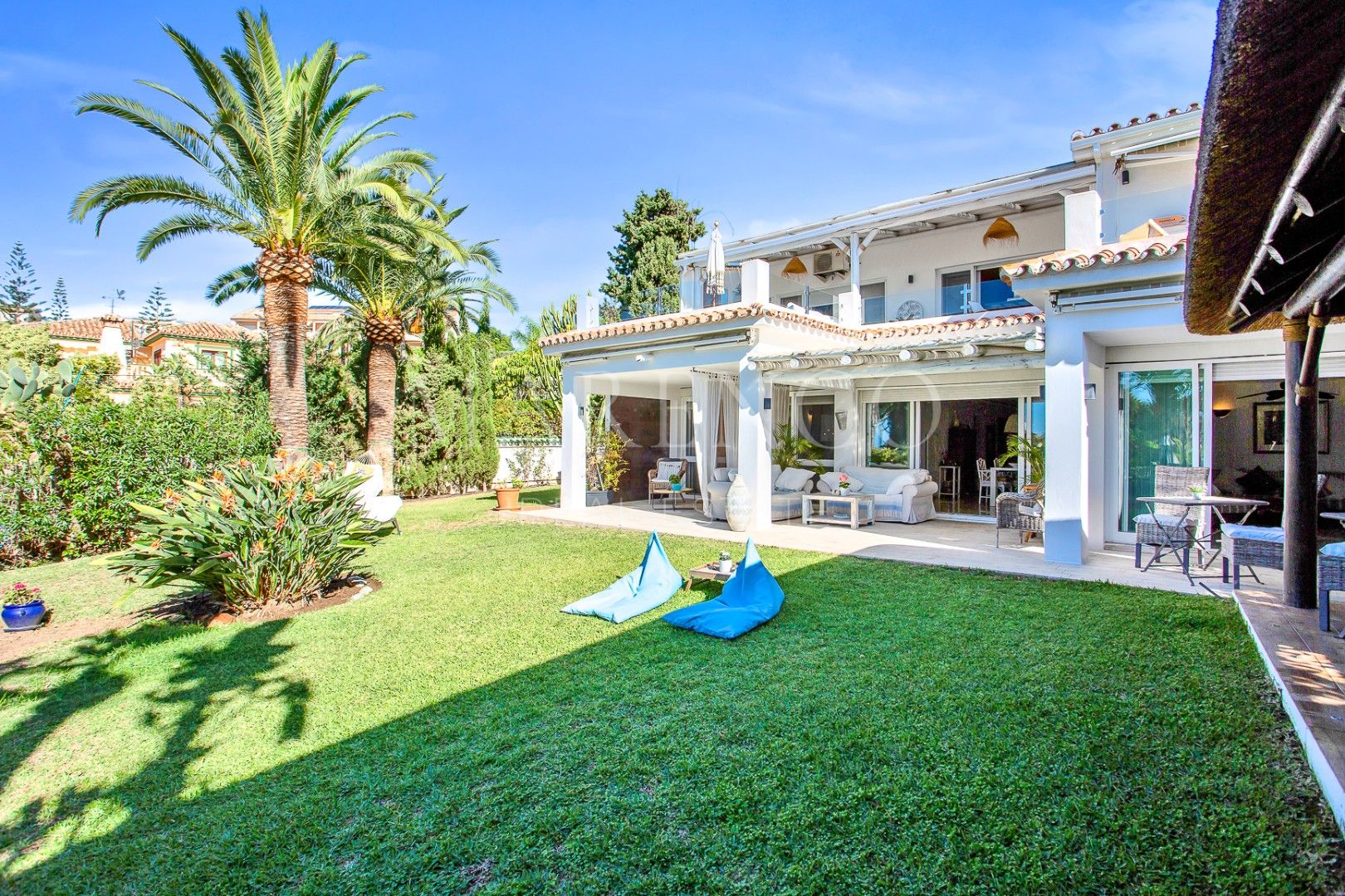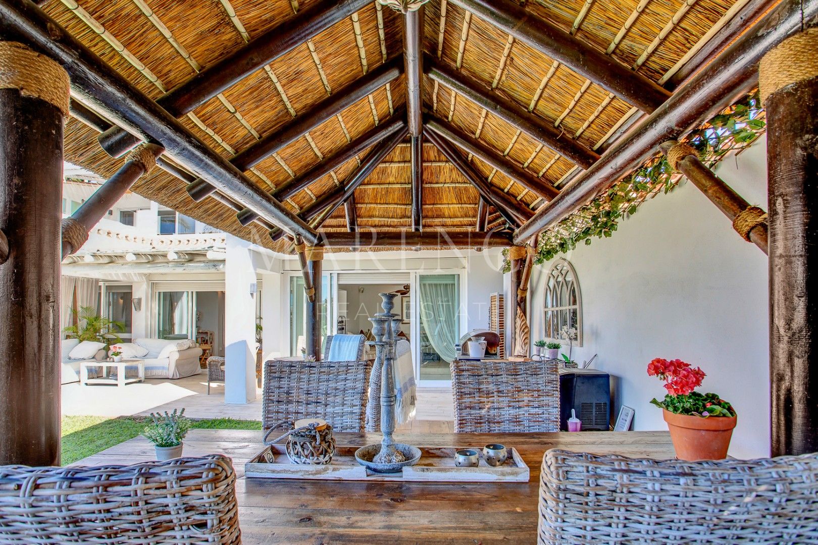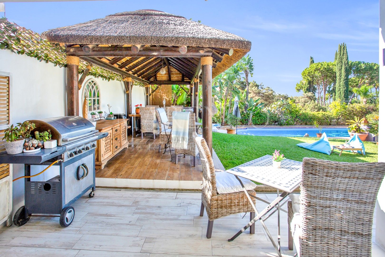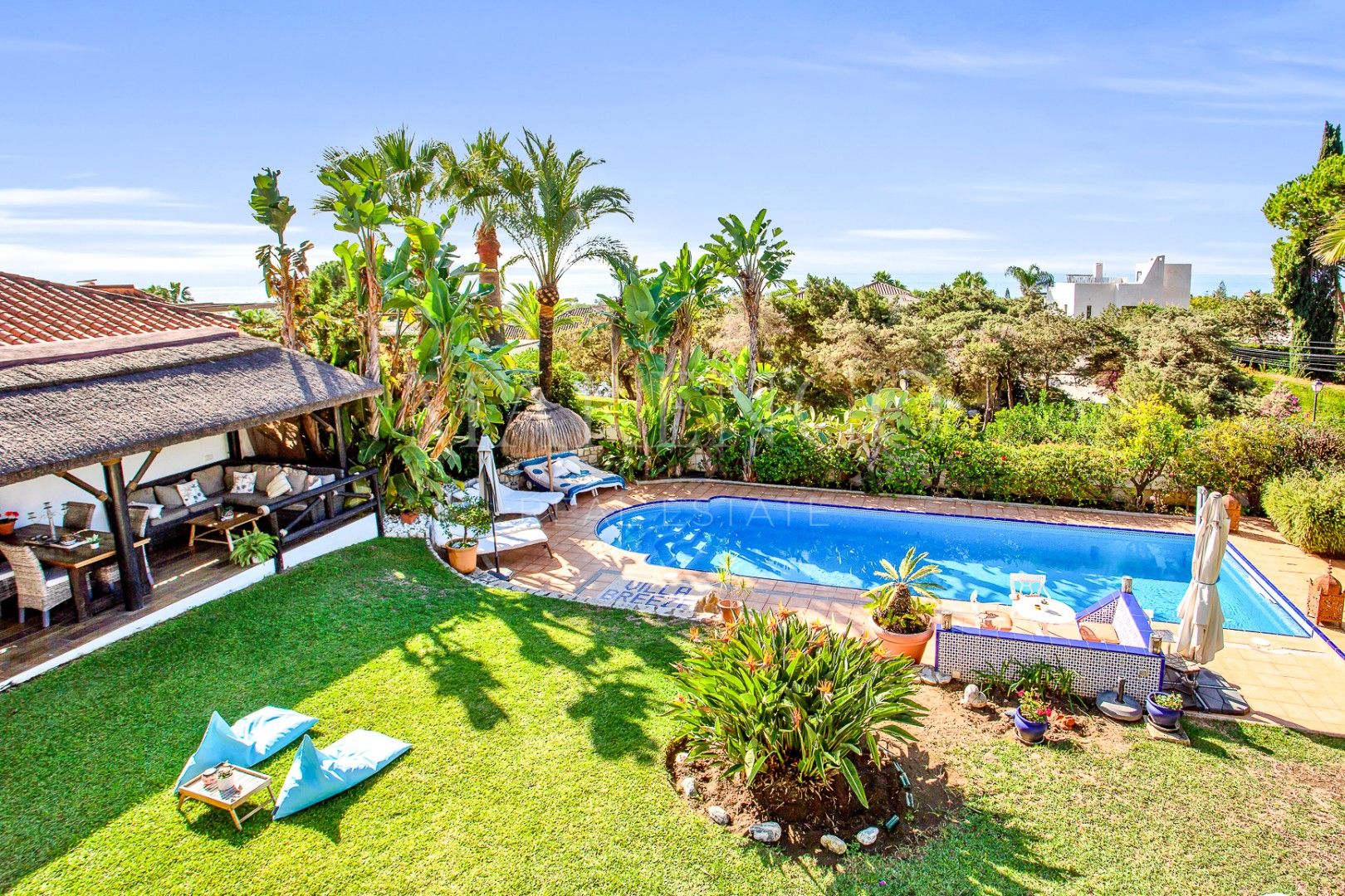 Outside, the villa sits on an 888 m² plot with mature landscaped gardens, offering a serene and private outdoor space. The large heated pool is perfect for year-round swimming. The plot and construction are flat, with parking for 4 cars.