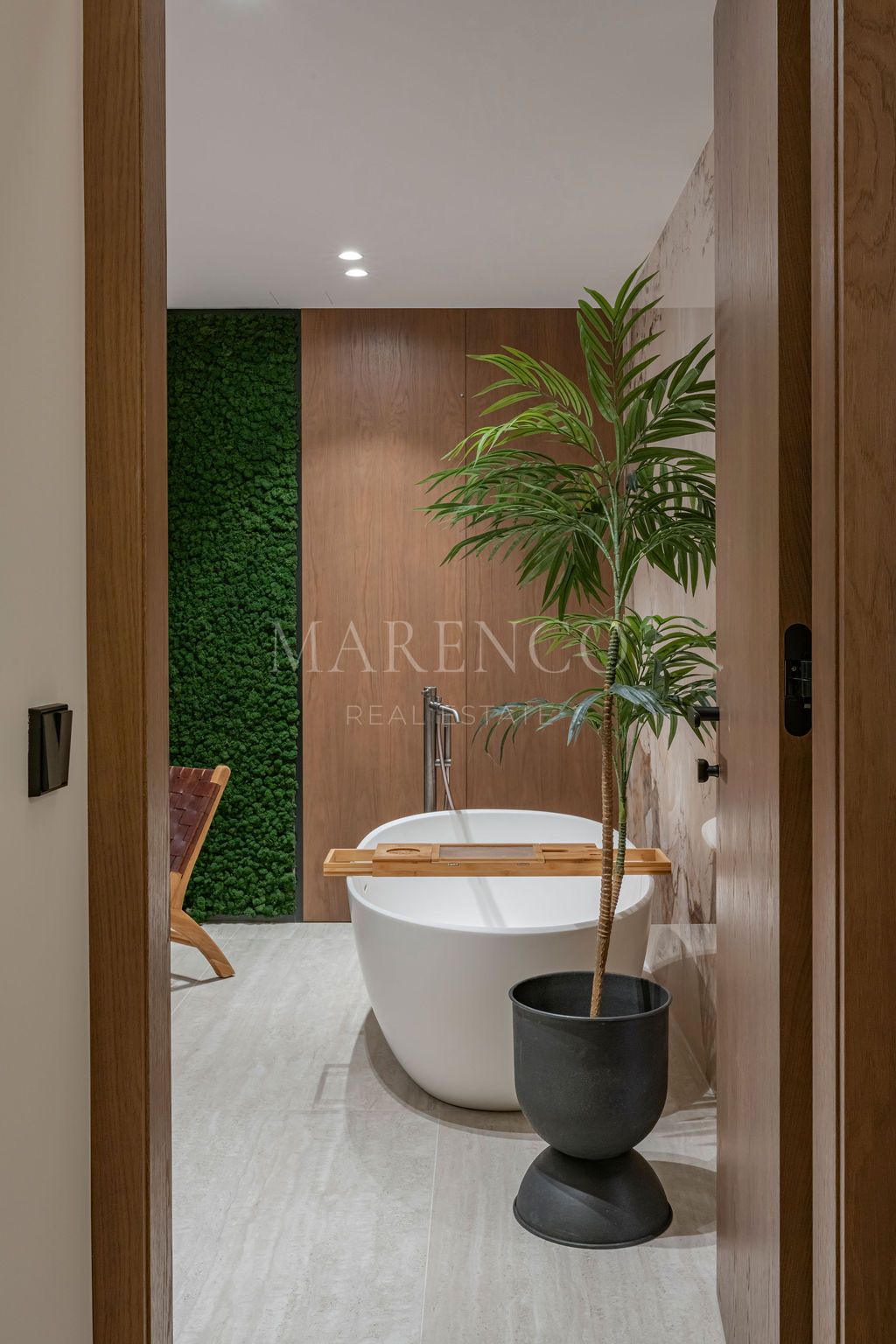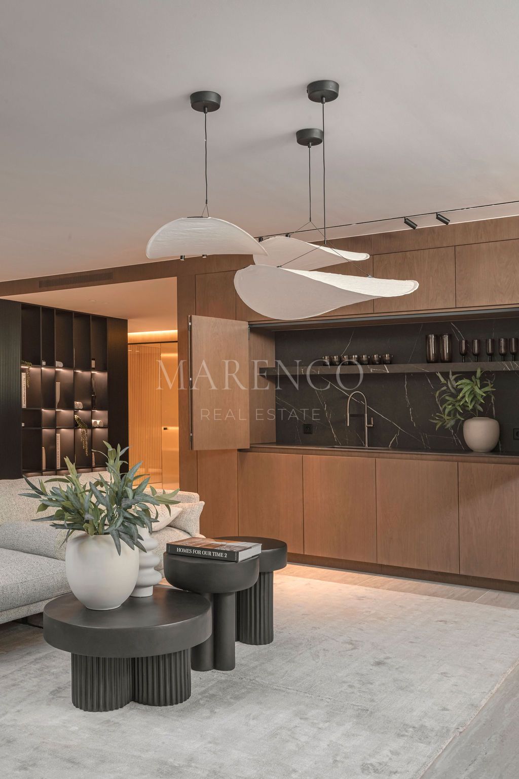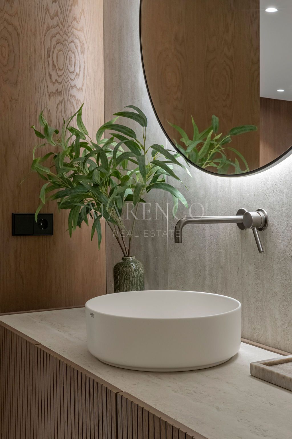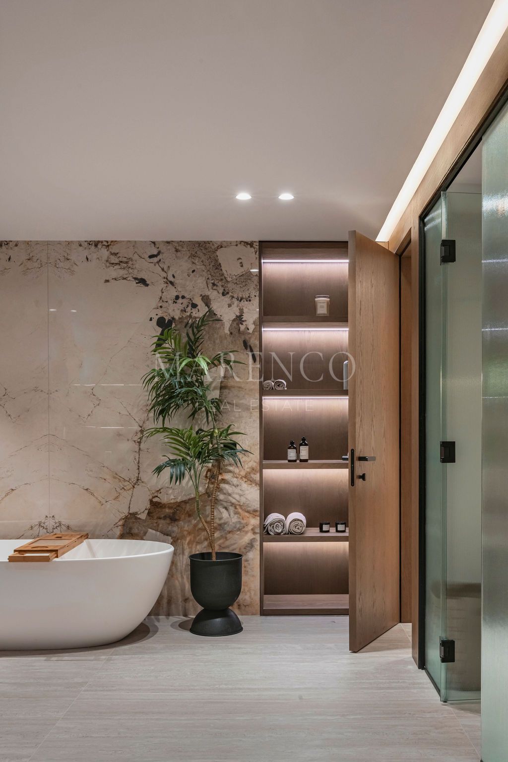 Inside, the villa offers an open-plan design that maximizes natural light with floor-to-ceiling glass doors, flooding the space with sunshine and offering spectacular views. The spacious 417 m² interior is designed for comfort and luxury, with 4 spacious bedrooms, each with en-suite bathrooms, providing privacy and tranquility. The modern kitchen is fitted with top-of-the-line appliances, seamlessly integrated into the living area, creating a perfect space for entertaining guests.