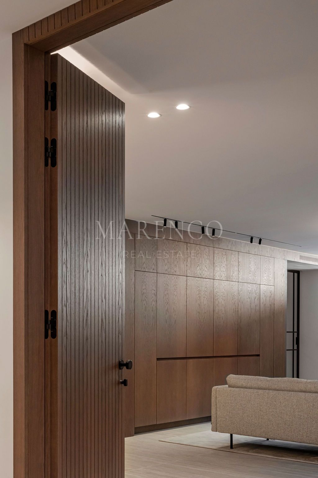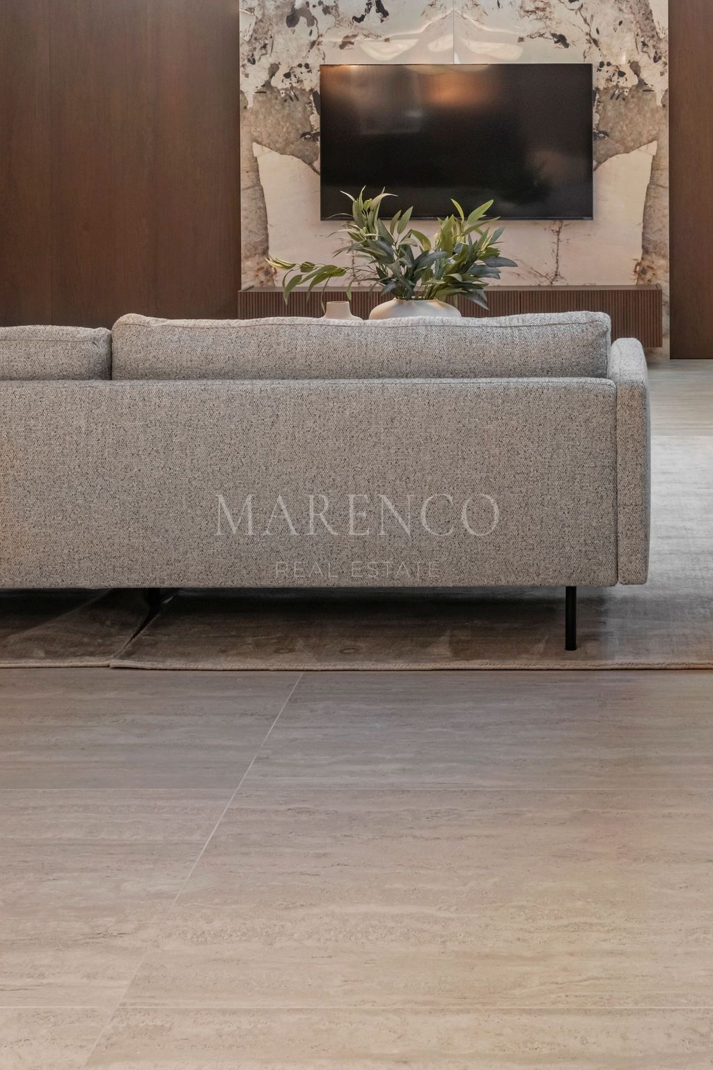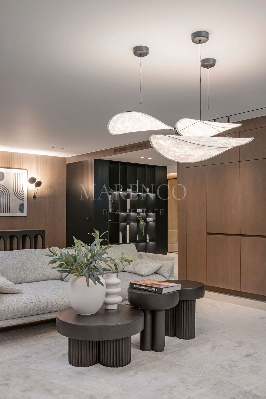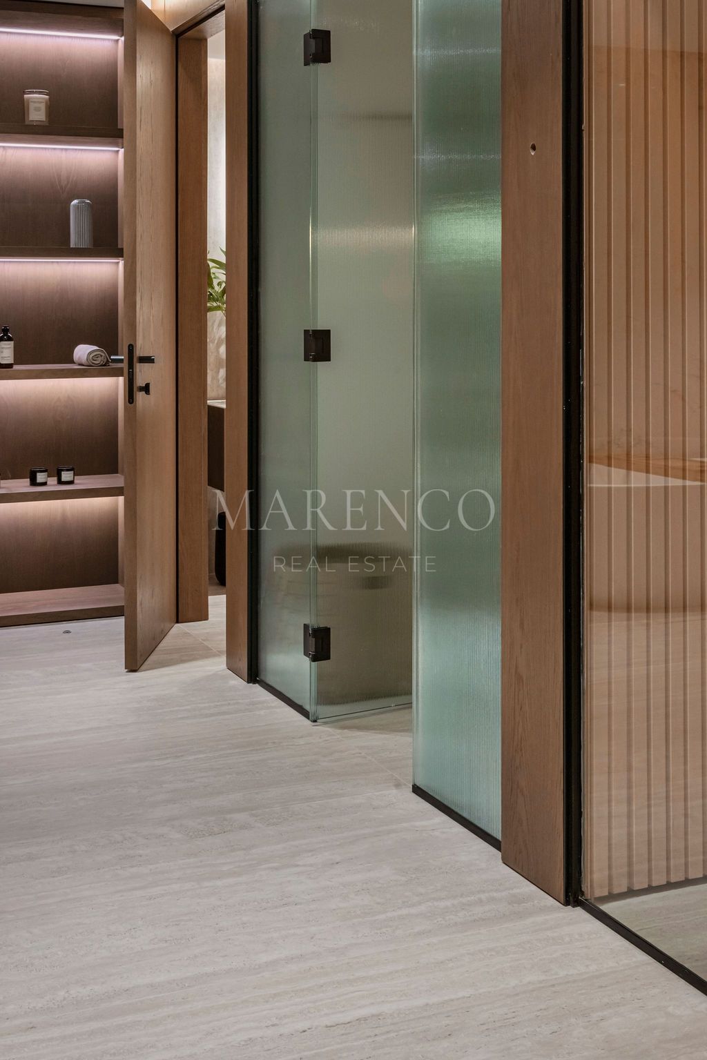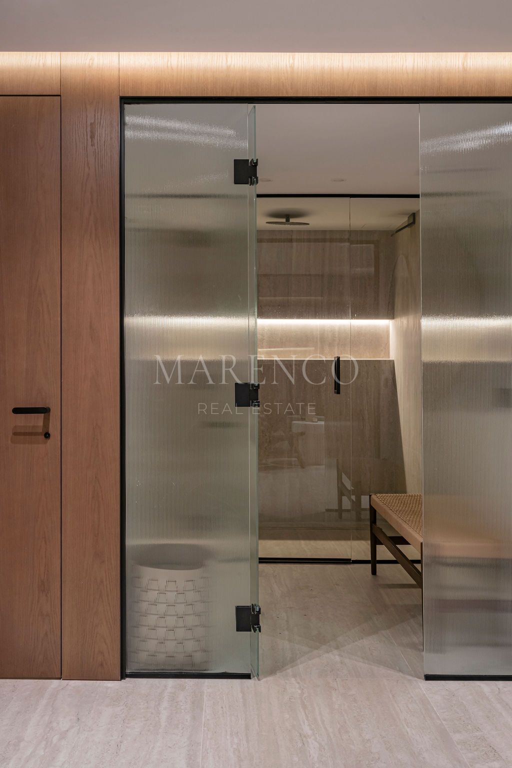 Inside, the villa offers an open-plan design that maximizes natural light with floor-to-ceiling glass doors, flooding the space with sunshine and offering spectacular views. The spacious 417 m² interior is designed for comfort and luxury, with 4 spacious bedrooms, each with en-suite bathrooms, providing privacy and tranquility. The modern kitchen is fitted with top-of-the-line appliances, seamlessly integrated into the living area, creating a perfect space for entertaining guests.
