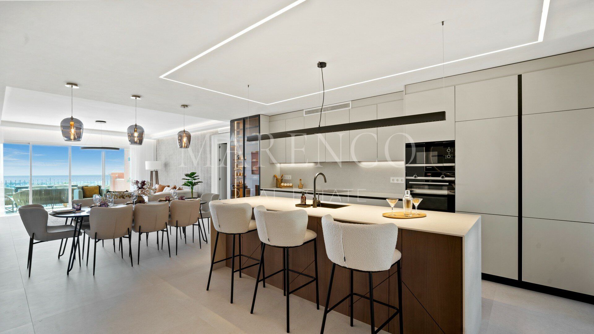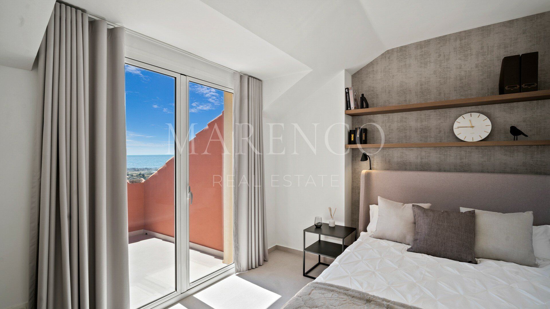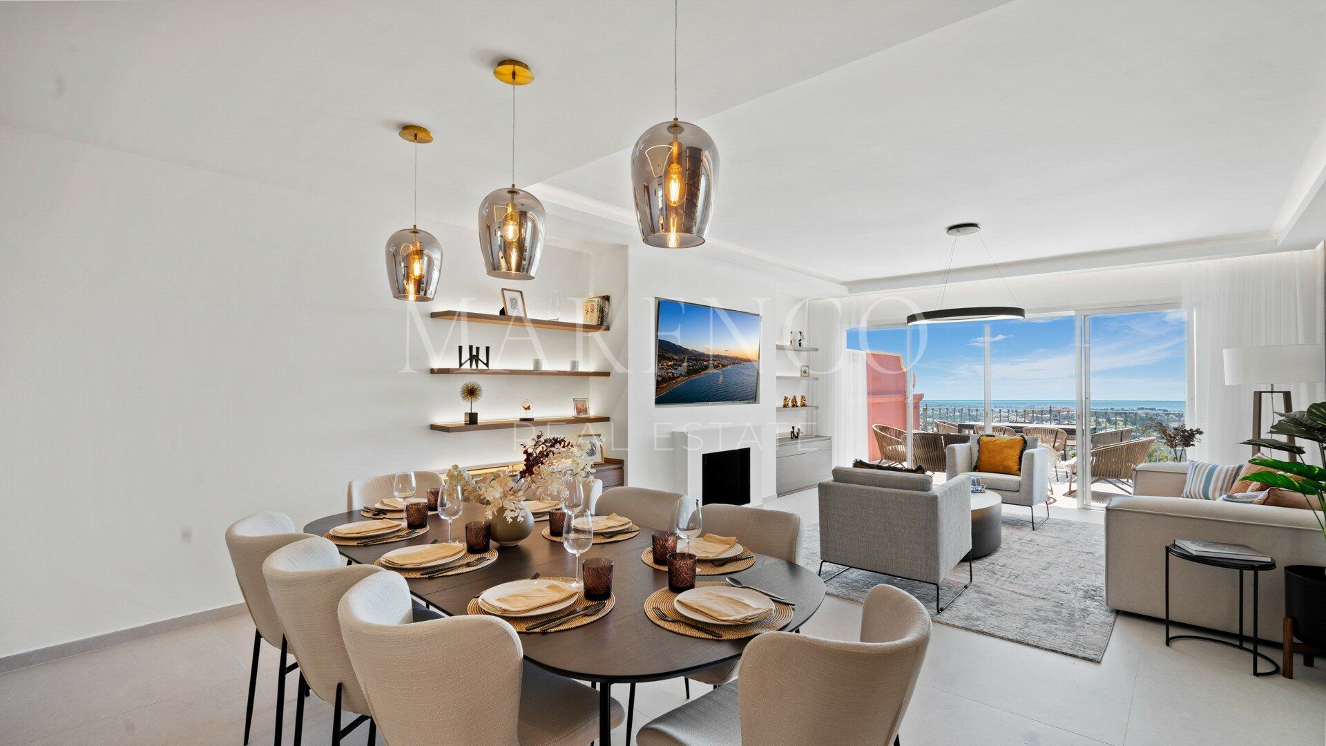 On the first level of the flat, we find the living room connected to the kitchen, dining room, and lounge. The special feature of this room is the fireplace that provides warmth and warmth, and also offers a lot of natural light coming from the large windows that give direct access to the terrace. From the terrace, you can enjoy the incredible views of the sea, the golf course, and the mountains. There is a guest bedroom, en-suite bathroom, laundry room, and guest toilet on the same level.
