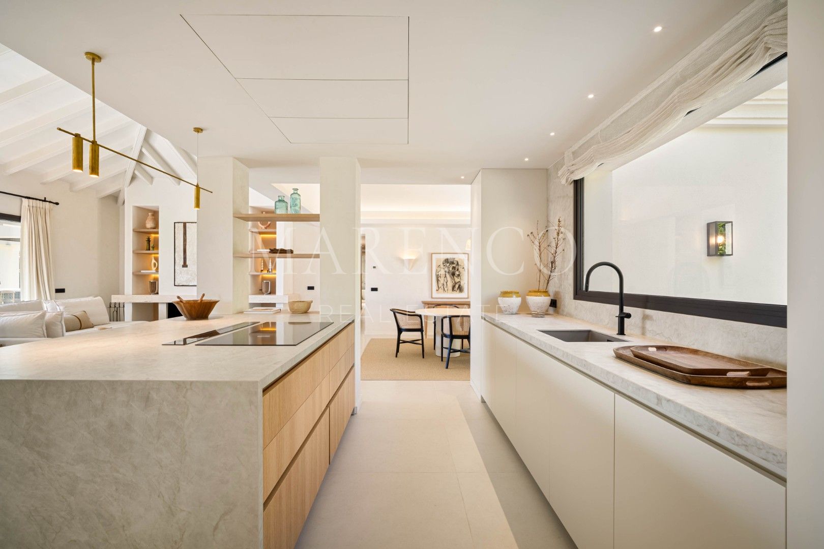 Step inside to discover a calming palette of natural tones, soaring vaulted ceilings, and an open-plan living space that seamlessly flows into a modern kitchen and dining area. Each detail has been carefully curated, from the sleek finishes and custom furnishings to the high-spec appliances and ambient lighting. Floor-to-ceiling glass doors invite natural light throughout and open onto a generous terrace complete with a sunken lounge, outdoor kitchen, and a striking infinity-edge pool that appears to float above the landscape.