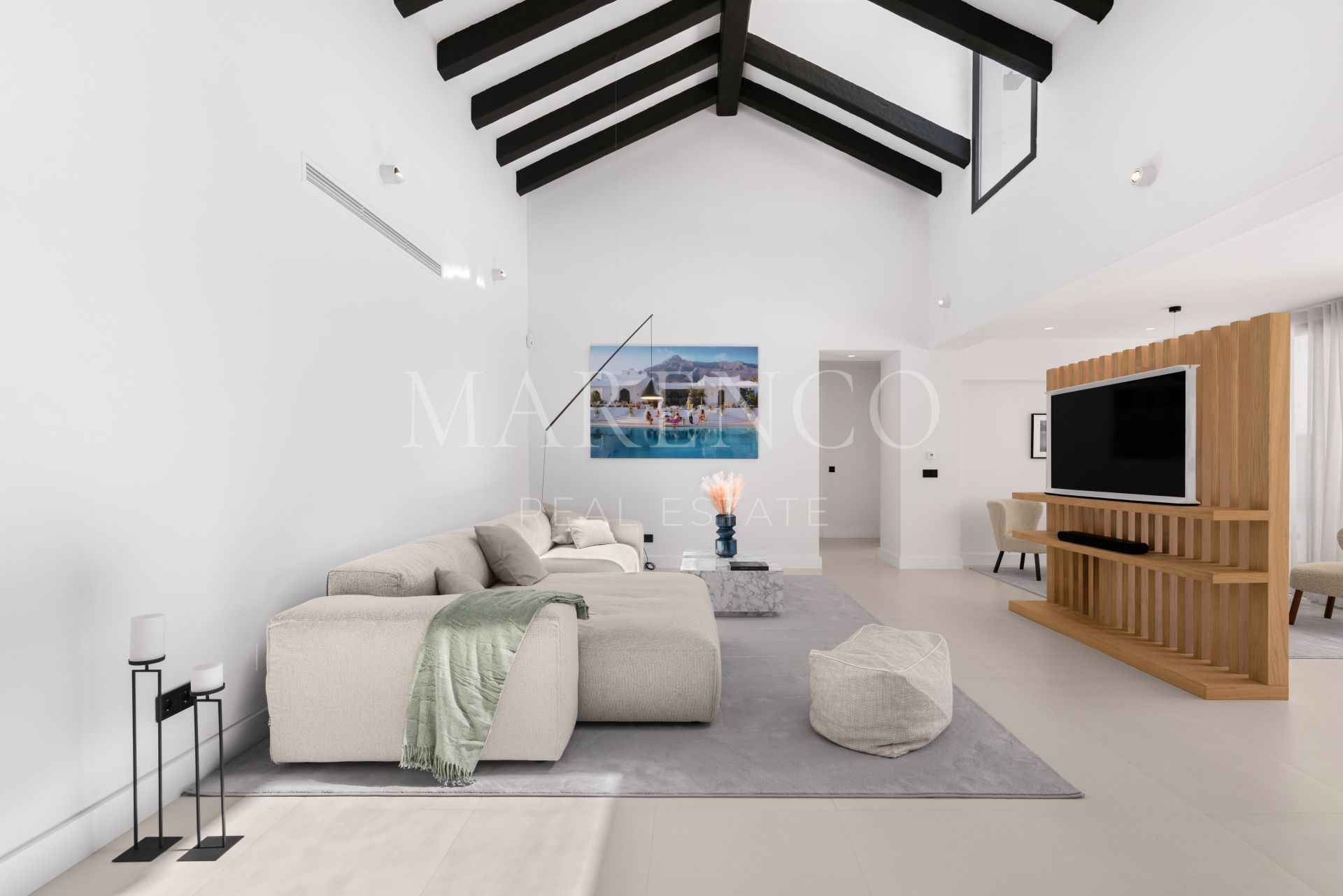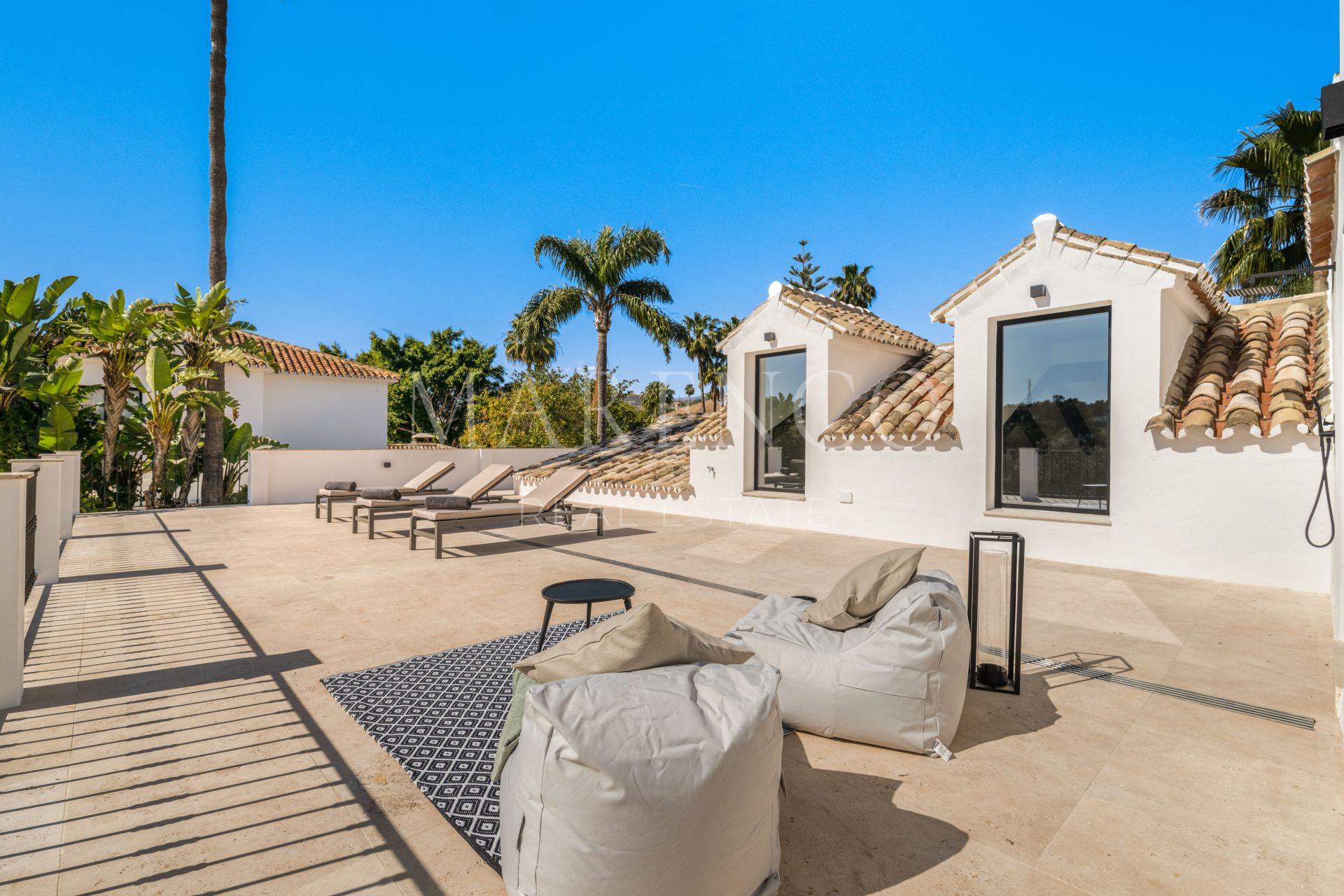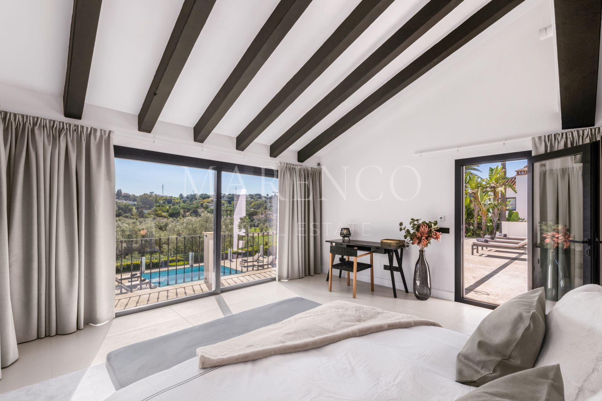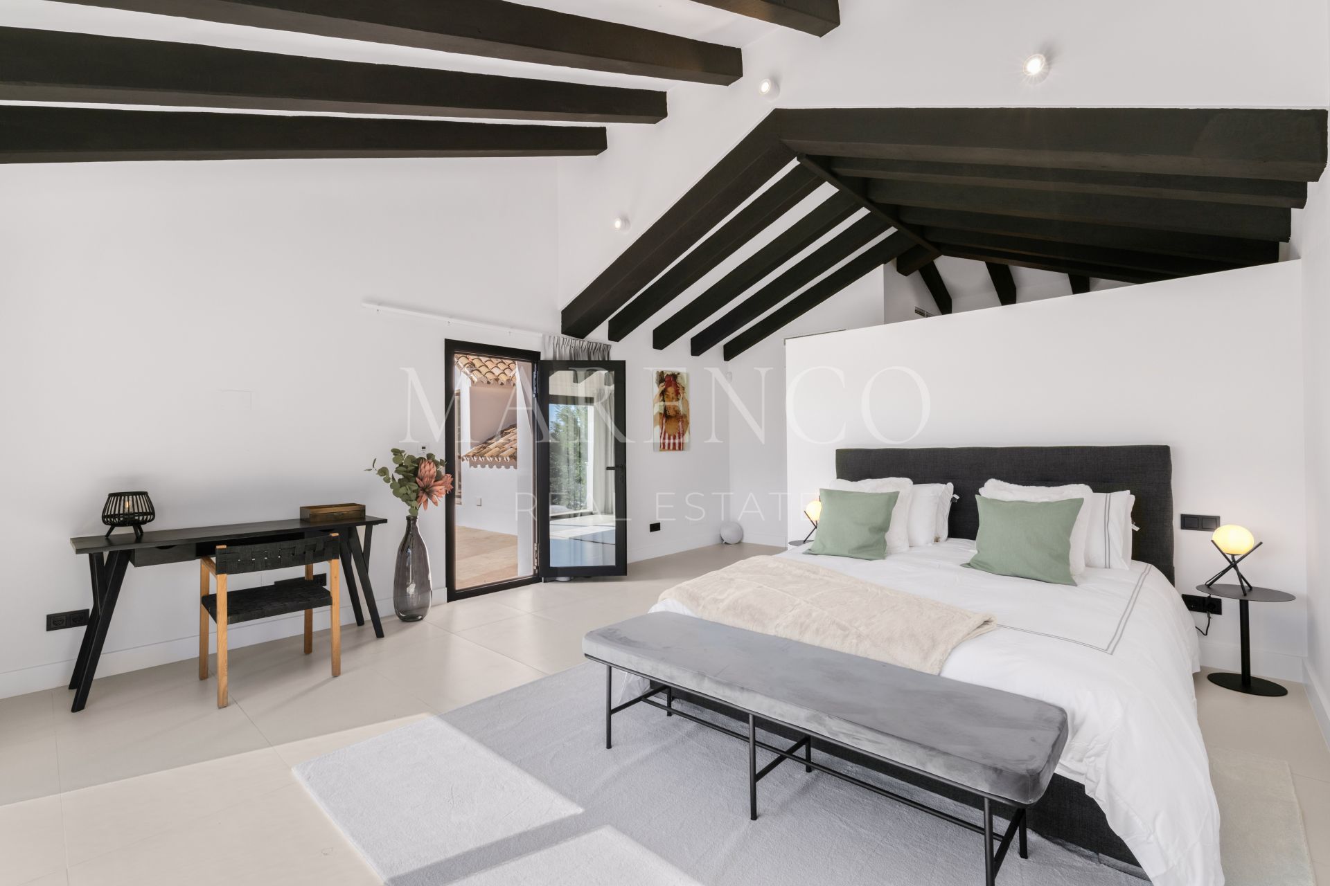 The property has been recently refurbished with a modern design in warm tones while preserving the Andalusian style. Distributed over 2 levels, the villa has a large living room with a double-height ceiling and wooden beams. Next, a fantastic open-plan kitchen fully equipped with the best appliances and a dining area. Furthermore, 4 en-suite bedrooms with beautiful views and access to the outdoor area complete this floor.