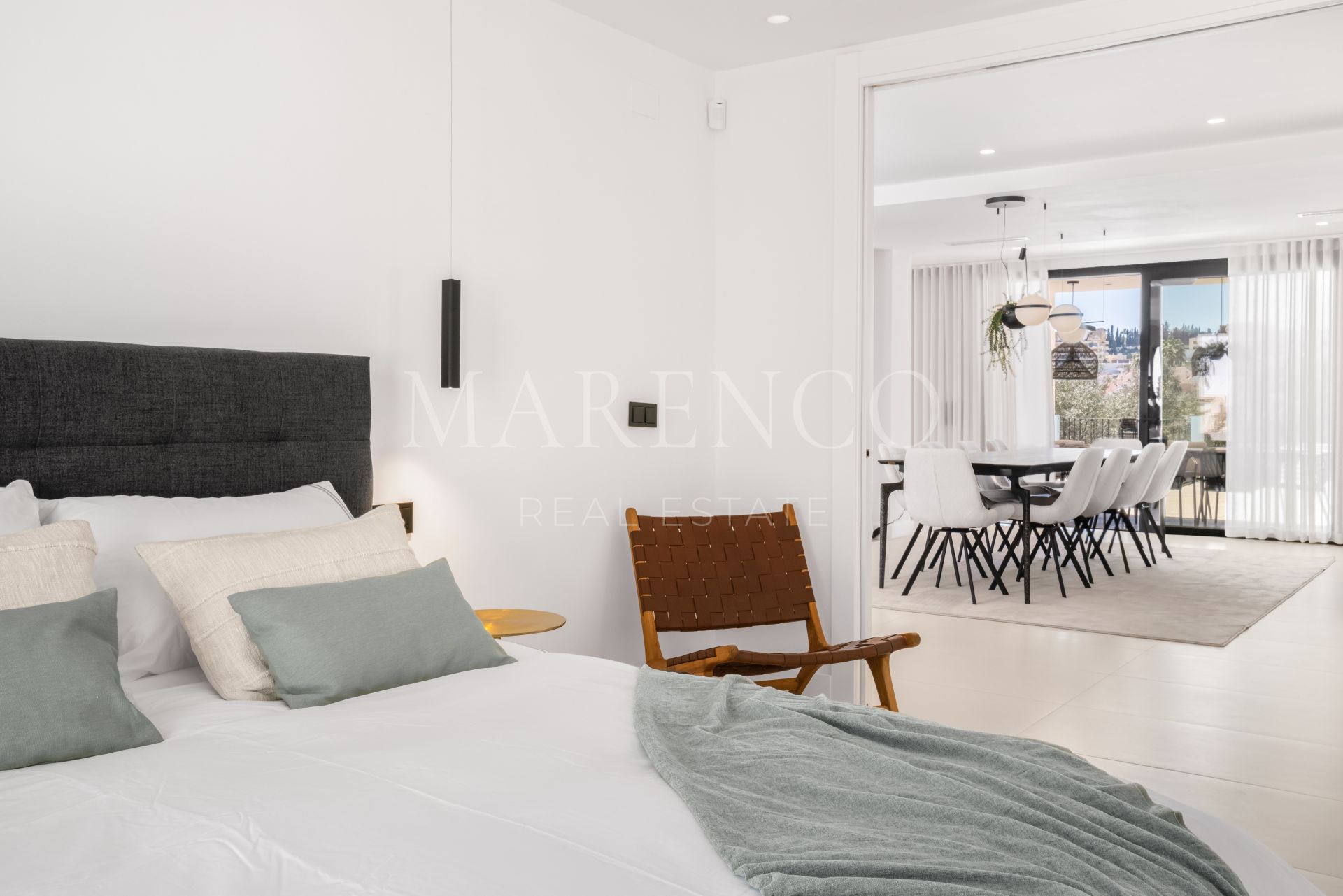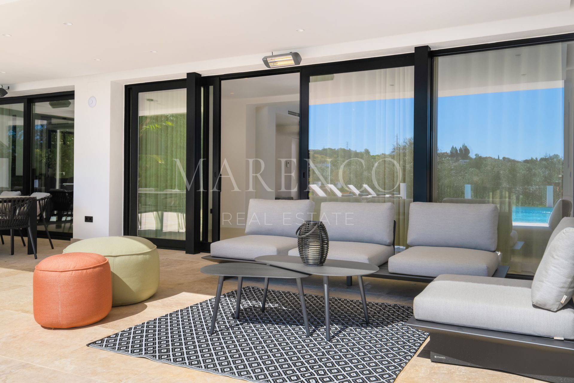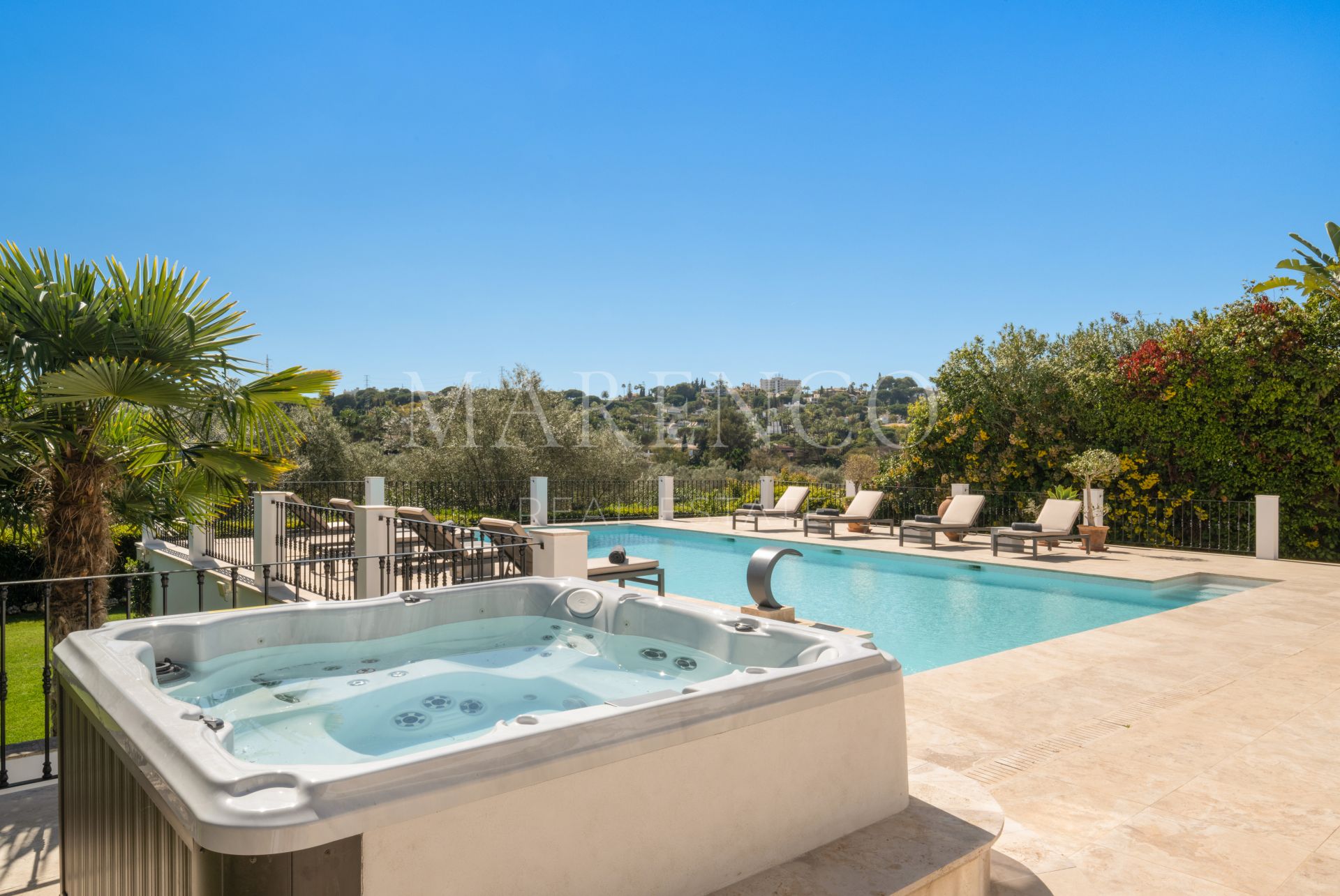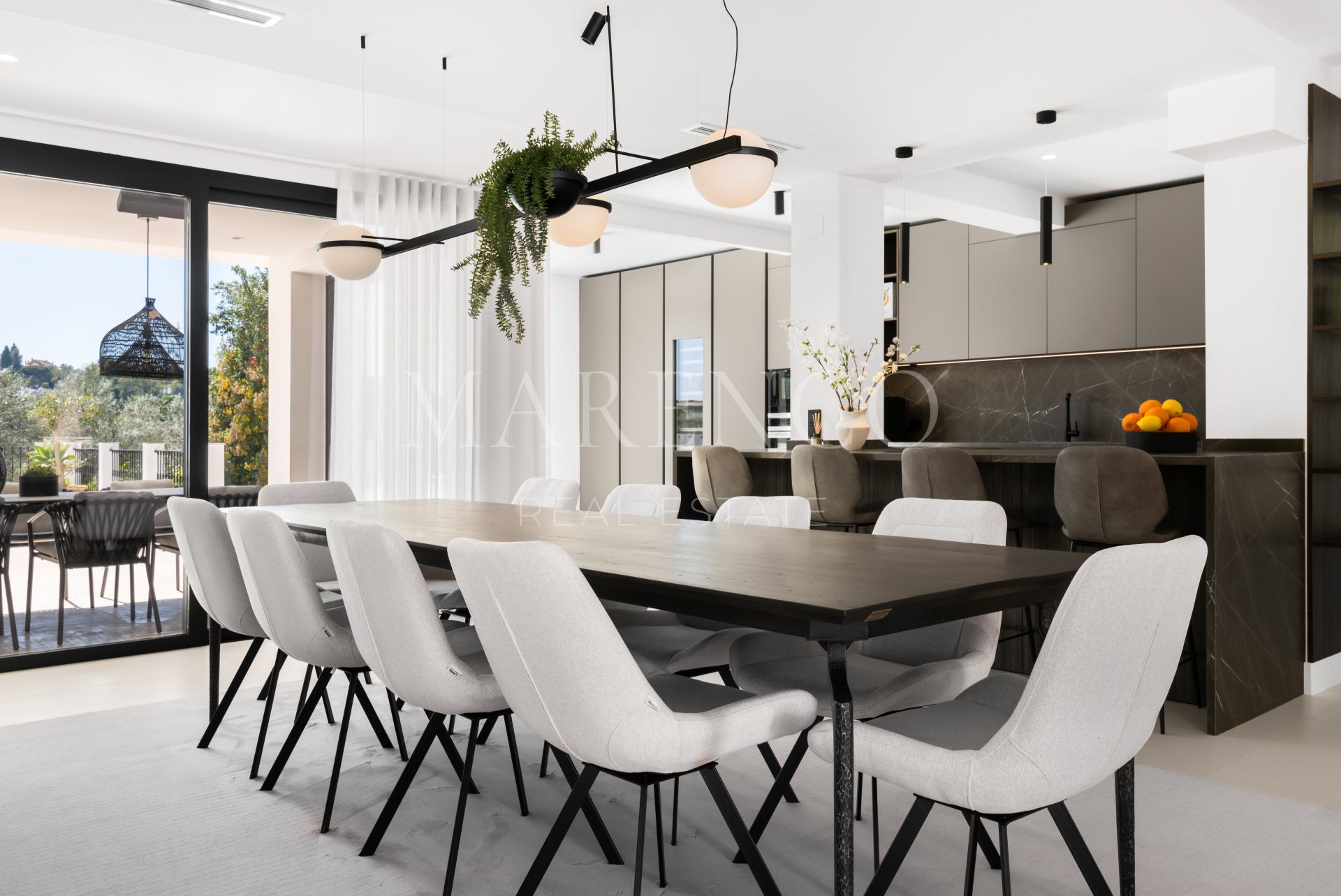 The property has been recently refurbished with a modern design in warm tones while preserving the Andalusian style. Distributed over 2 levels, the villa has a large living room with a double-height ceiling and wooden beams. Next, a fantastic open-plan kitchen fully equipped with the best appliances and a dining area. Furthermore, 4 en-suite bedrooms with beautiful views and access to the outdoor area complete this floor.
