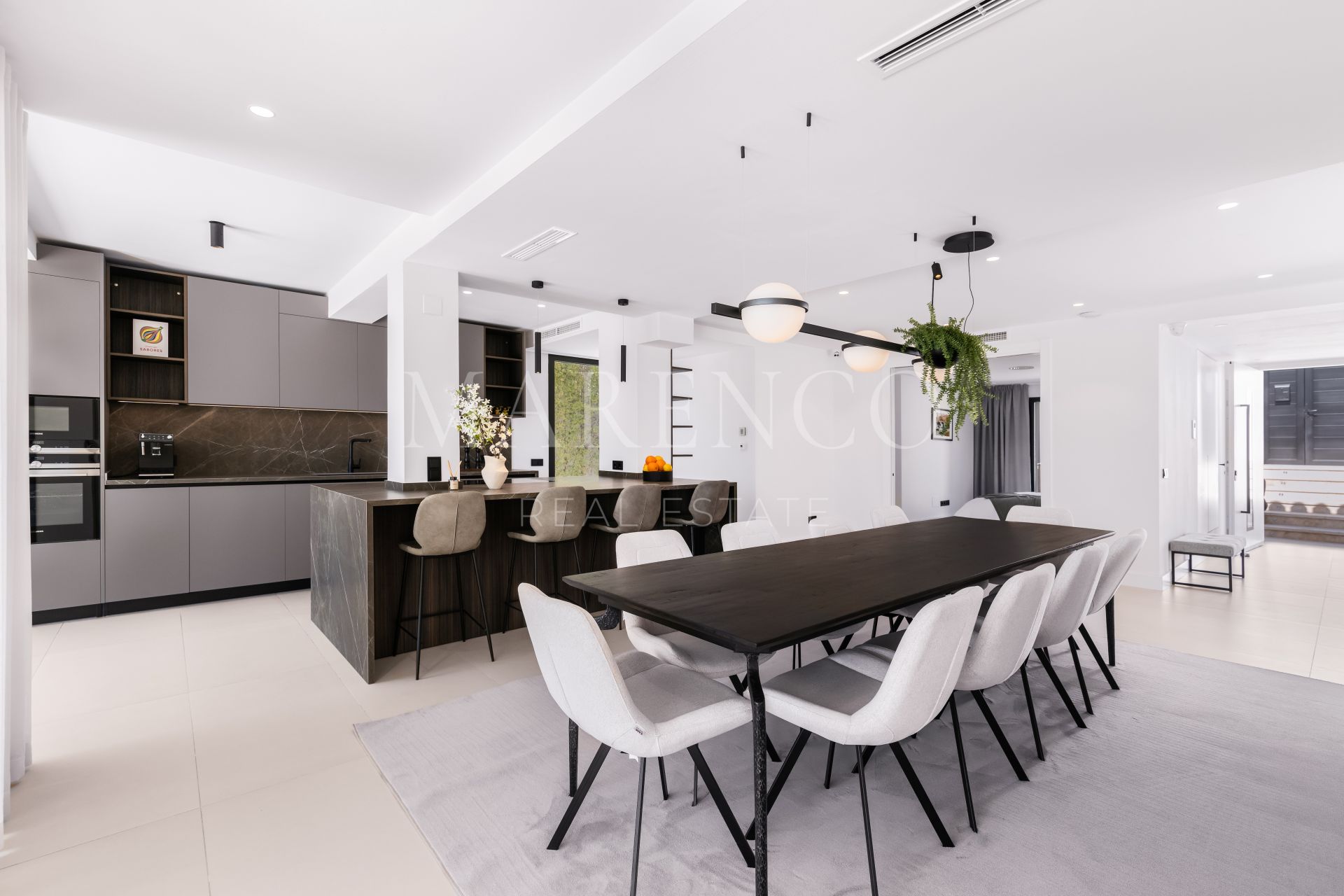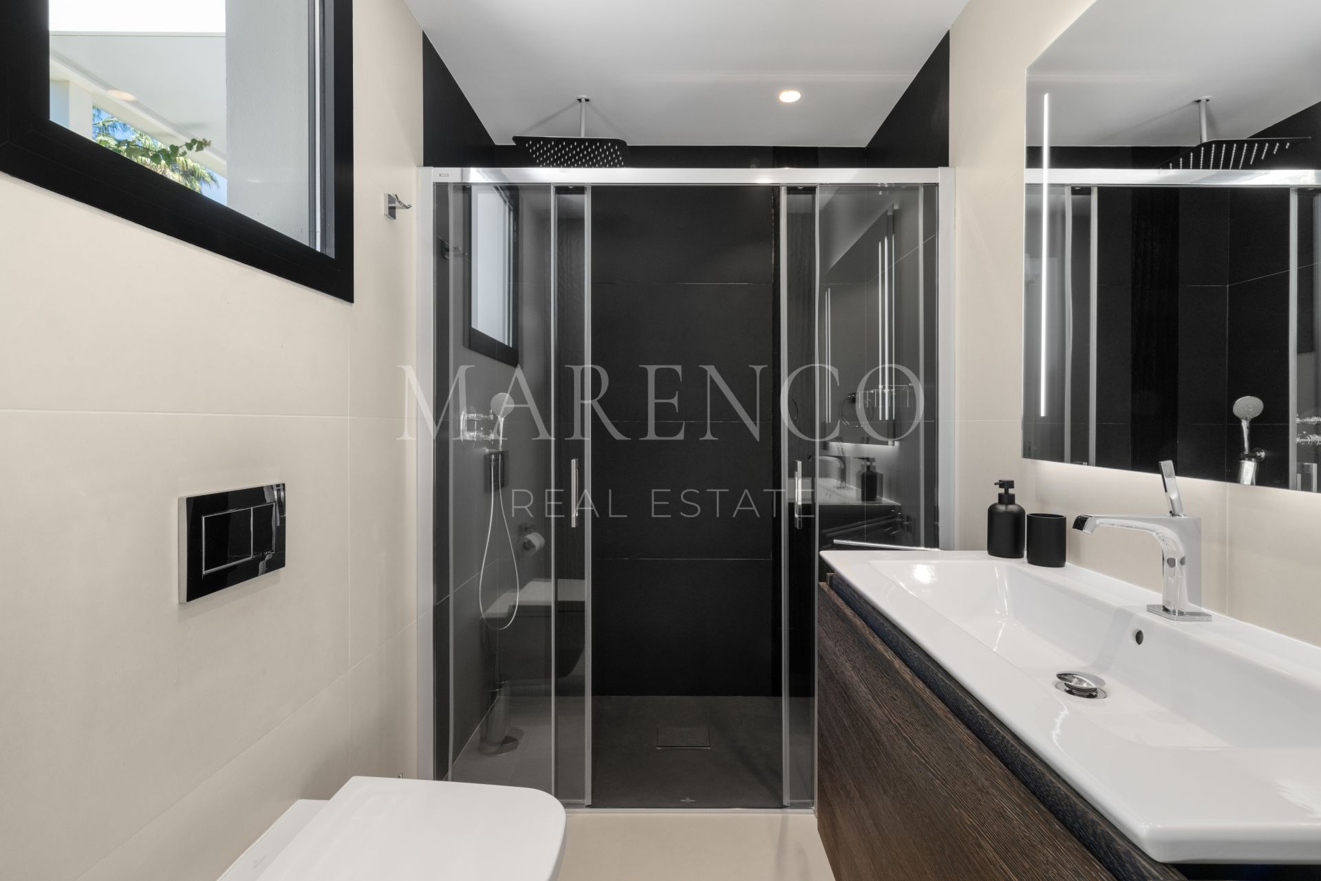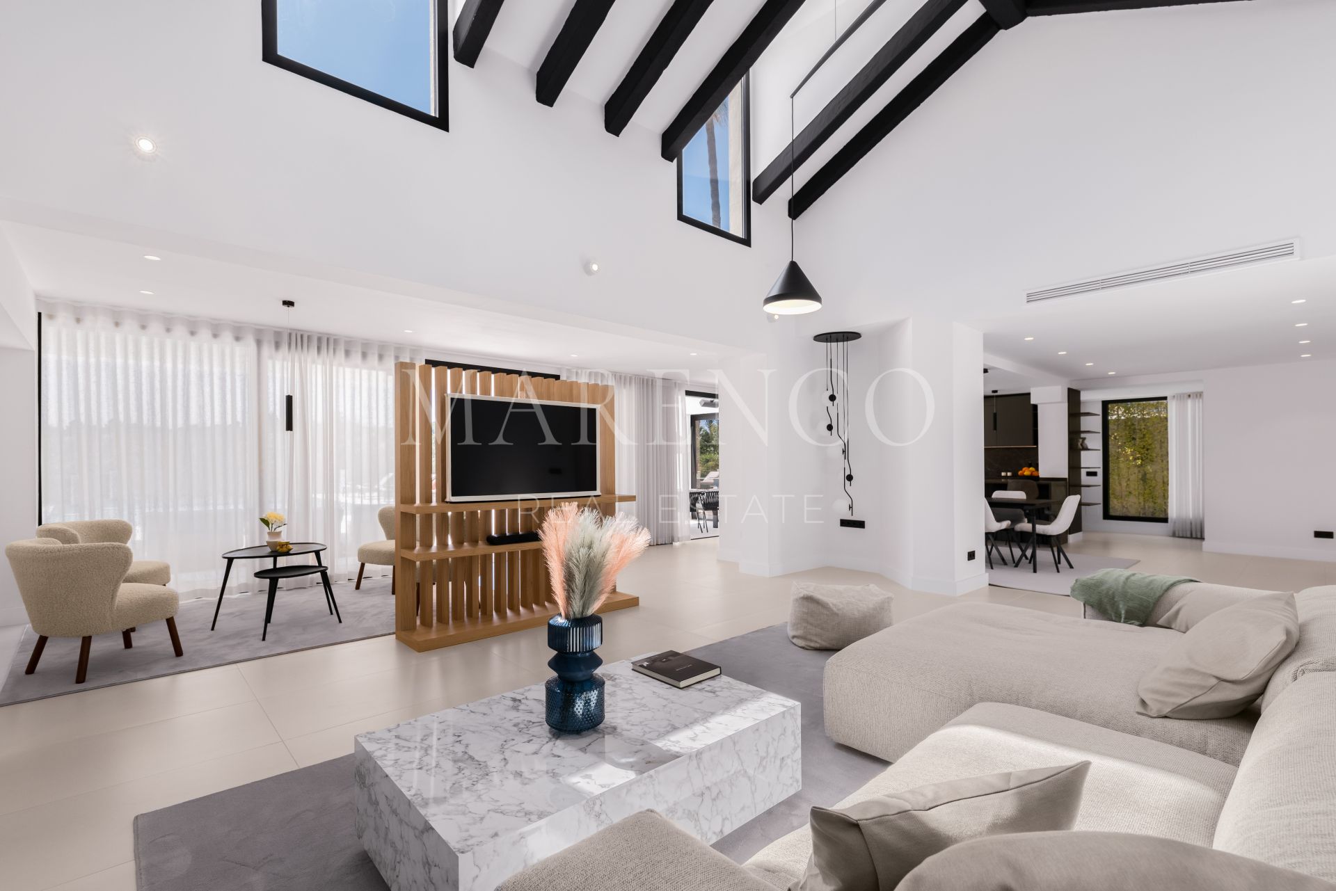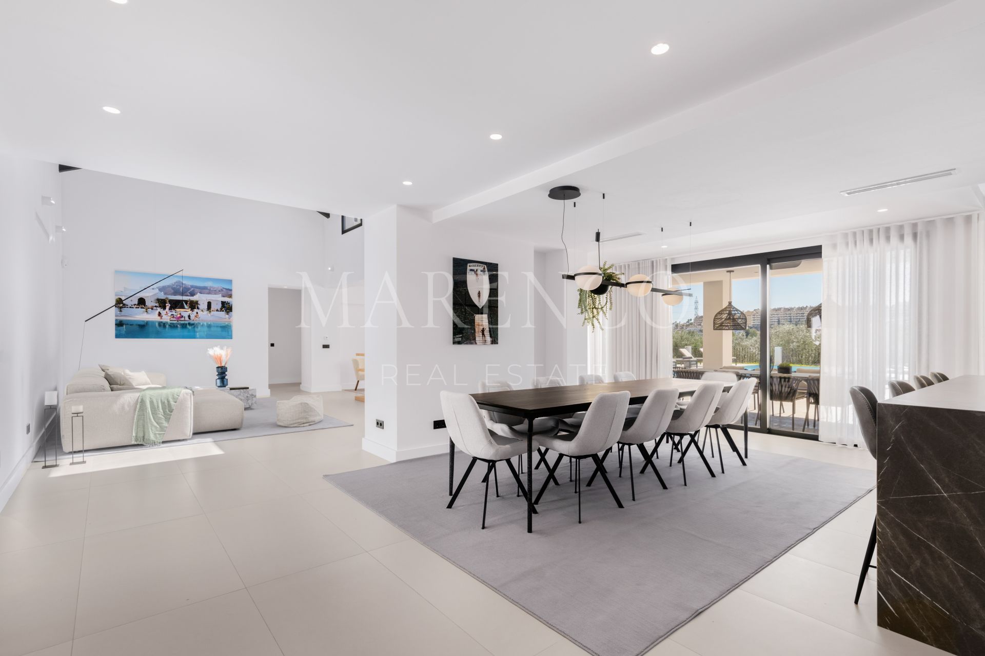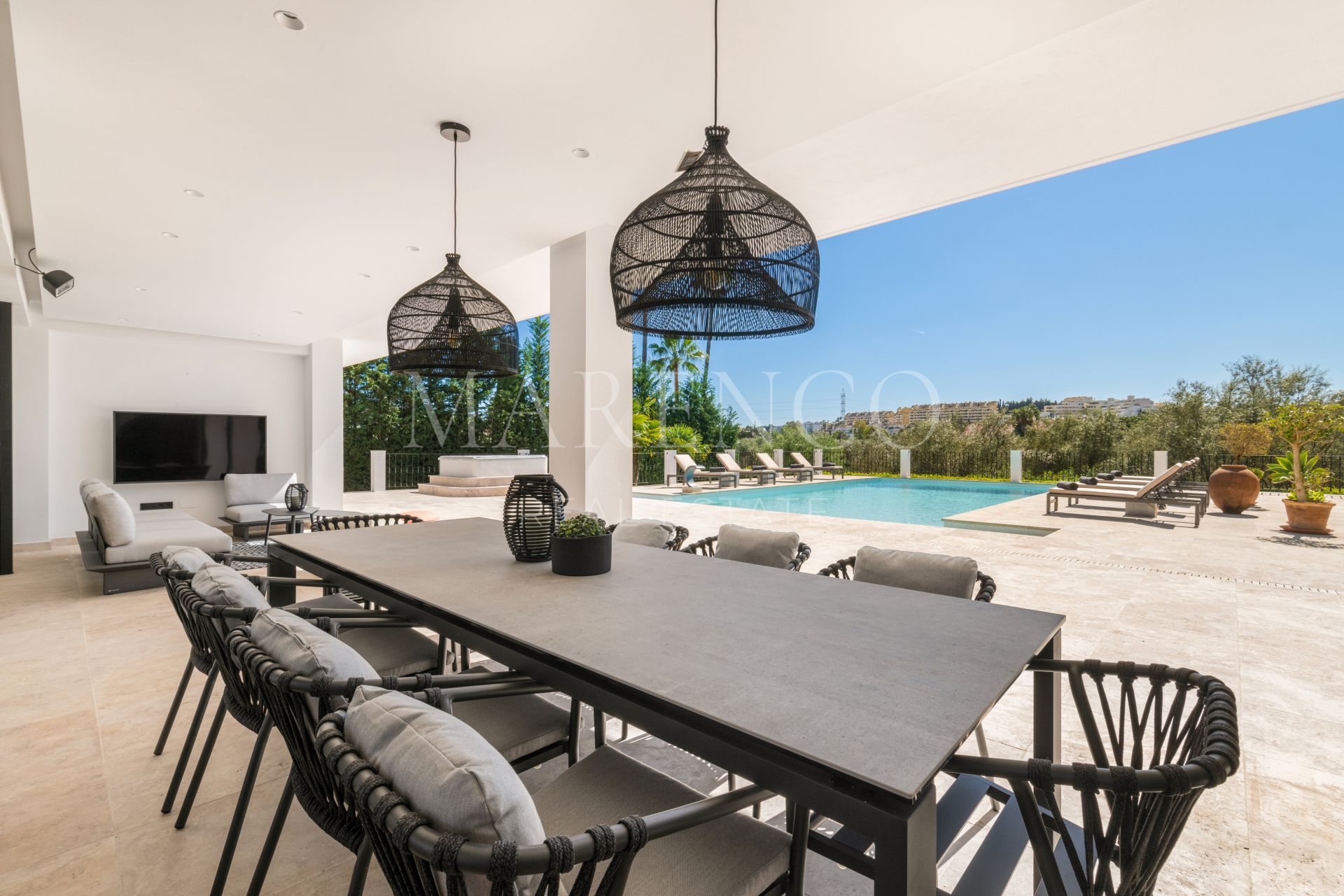 The property has been recently refurbished with a modern design in warm tones while preserving the Andalusian style. Distributed over 2 levels, the villa has a large living room with a double-height ceiling and wooden beams. Next, a fantastic open-plan kitchen fully equipped with the best appliances and a dining area. Furthermore, 4 en-suite bedrooms with beautiful views and access to the outdoor area complete this floor.