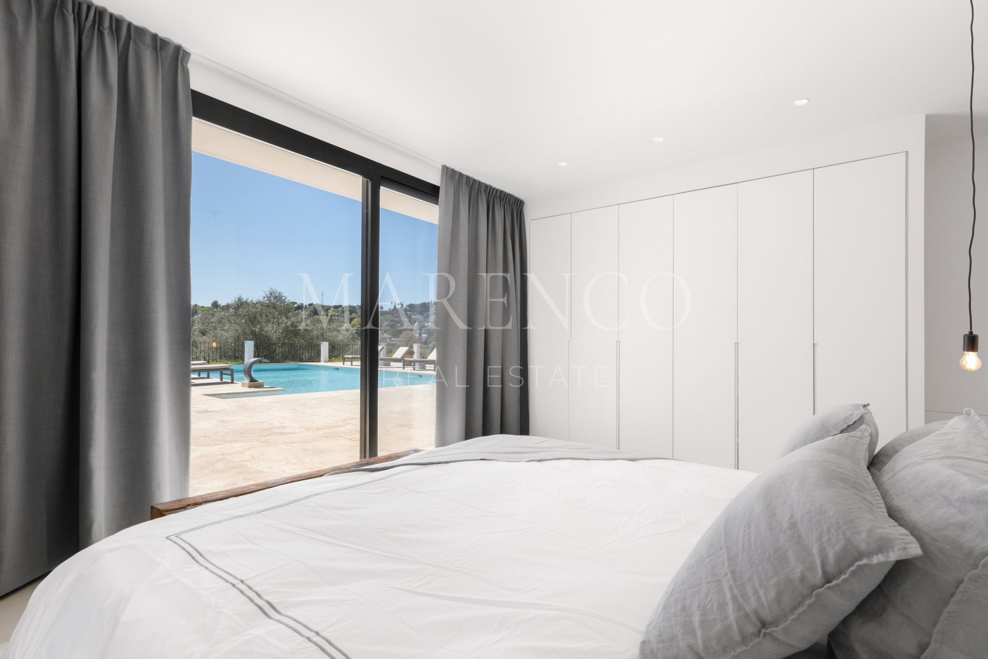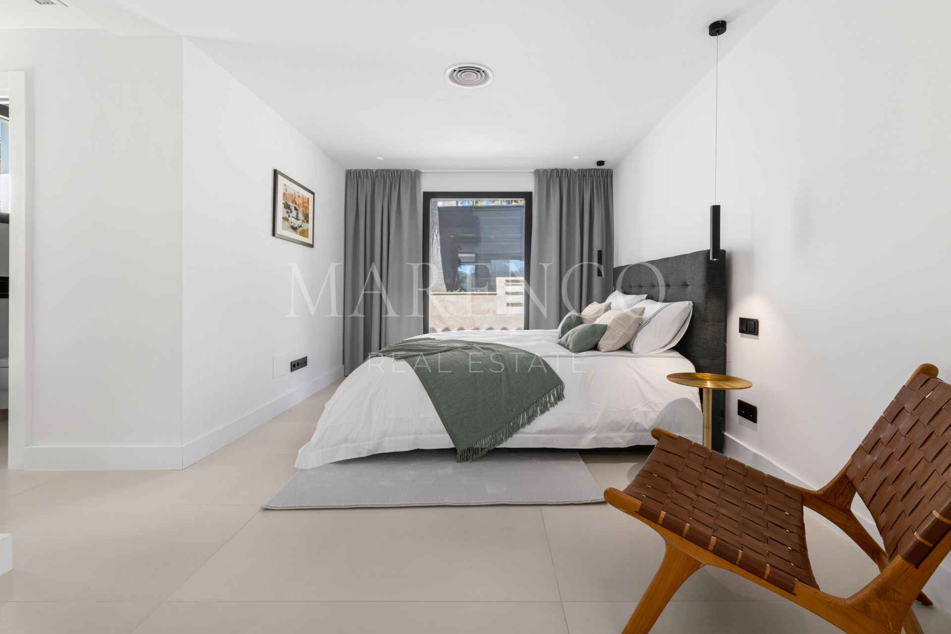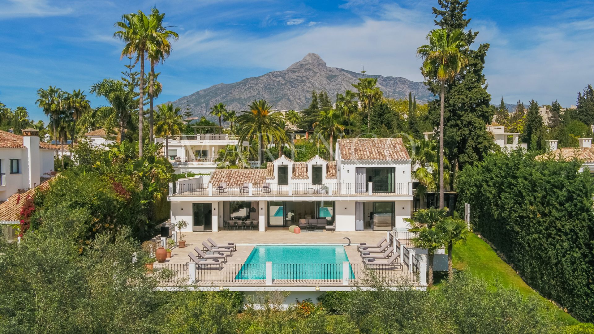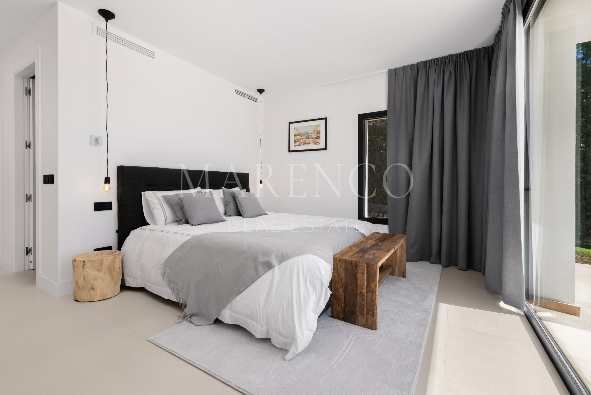 The property has been recently refurbished with a modern design in warm tones while preserving the Andalusian style. Distributed over 2 levels, the villa has a large living room with a double-height ceiling and wooden beams. Next, a fantastic open-plan kitchen fully equipped with the best appliances and a dining area. Furthermore, 4 en-suite bedrooms with beautiful views and access to the outdoor area complete this floor.