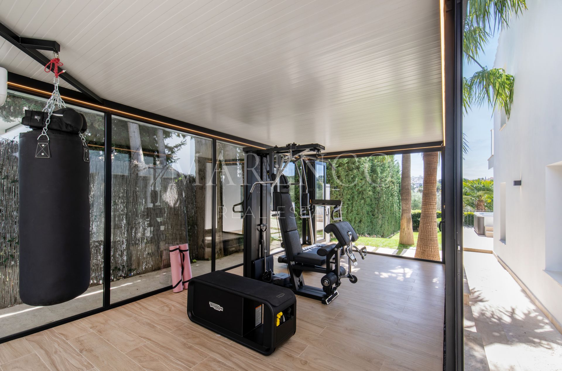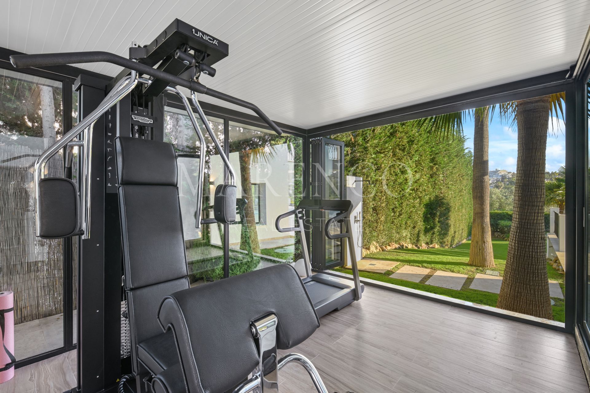 A magnificent outdoor area with a salt water swimming pool, outdoor dining area, and barbecue area. Private garage with space for several vehicles, fully equipped gymnasium, air conditioning, and underfloor heating throughout the house.