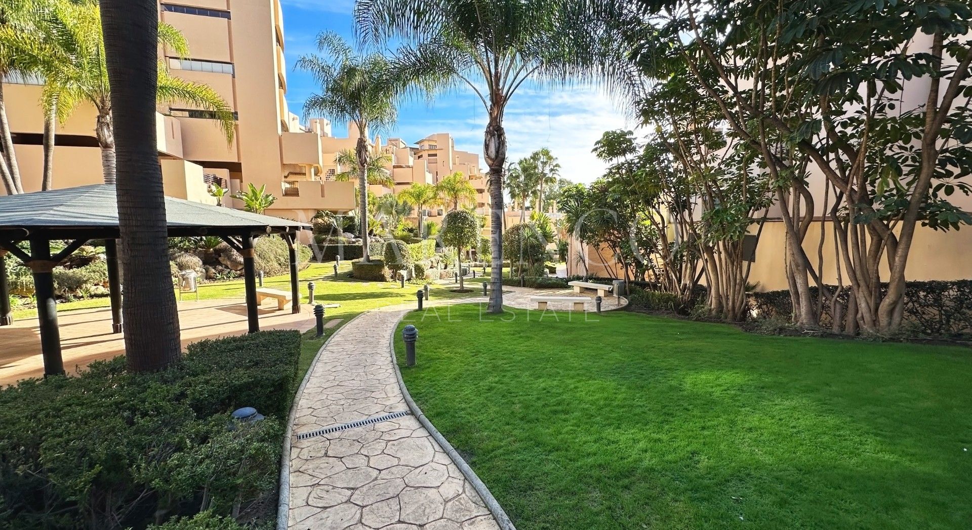El apartamento cuenta con dos amplios dormitorios bañados en luz natural, además de una luminosa y espaciosa zona de estar que se abre sin esfuerzo a una generosa terraza privada. Desde aquí, se puede disfrutar de vistas serenas a la piscina y a los exuberantes jardines, convirtiéndola en el lugar ideal para relajarse al aire libre o recibir invitados. Cada detalle ha sido cuidadosamente diseñado para potenciar el confort y el lujo, garantizando una experiencia de vida excepcional.