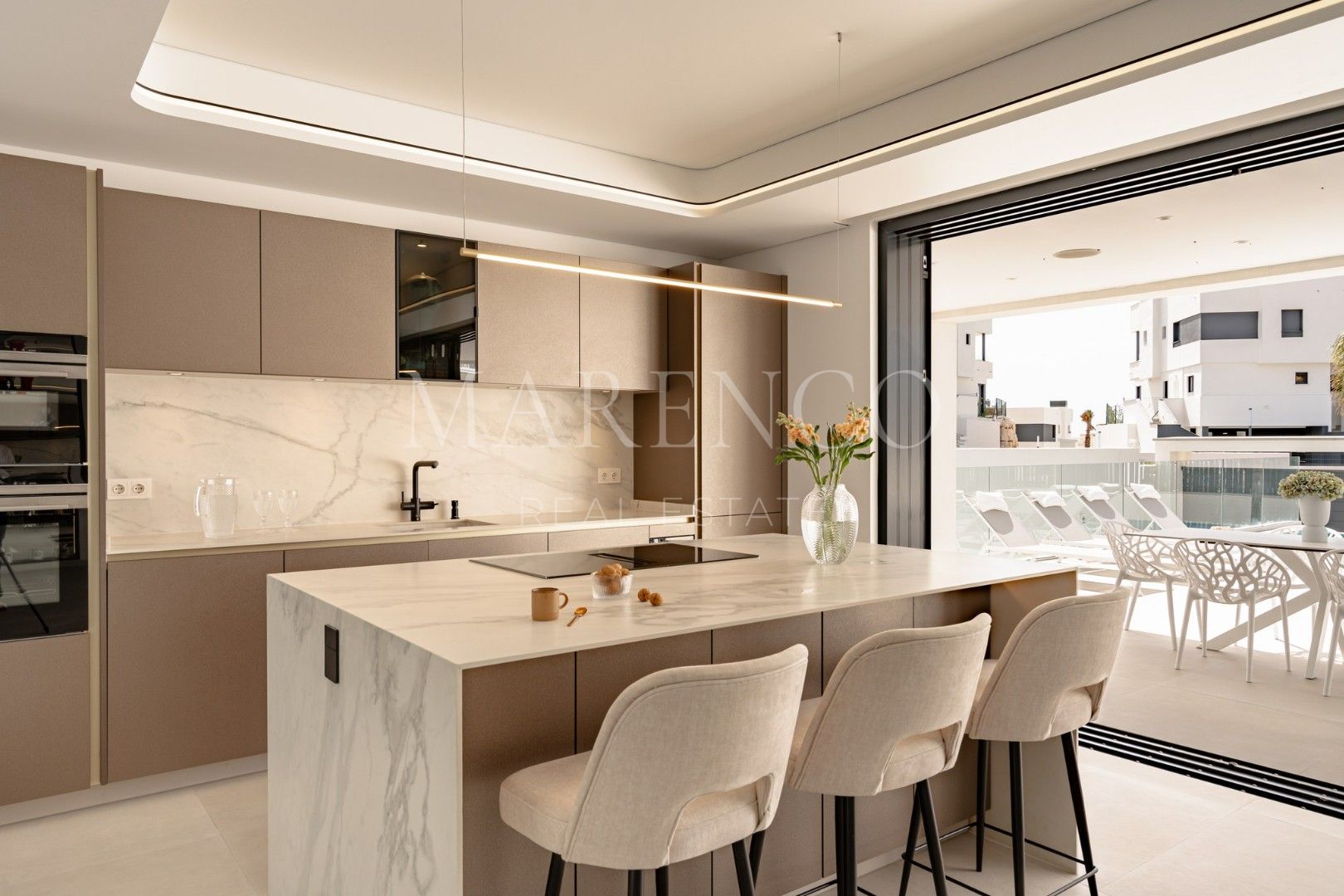 La vivienda cuenta con aproximadamente 330 m² construidos, distribuidos en cuatro dormitorios y tres baños, con una distribución pensada para ofrecer comodidad y funcionalidad. El corazón de la casa es un amplio salón-comedor de concepto abierto, con grandes ventanales que conectan de forma fluida con el exterior. La cocina, completamente equipada y con isla central, se integra perfectamente en el espacio, creando un entorno ideal tanto para el día a día como para recibir invitados. El dormitorio principal dispone de vestidor, baño en suite y acceso a terraza privada, aportando un plus de privacidad y confort.