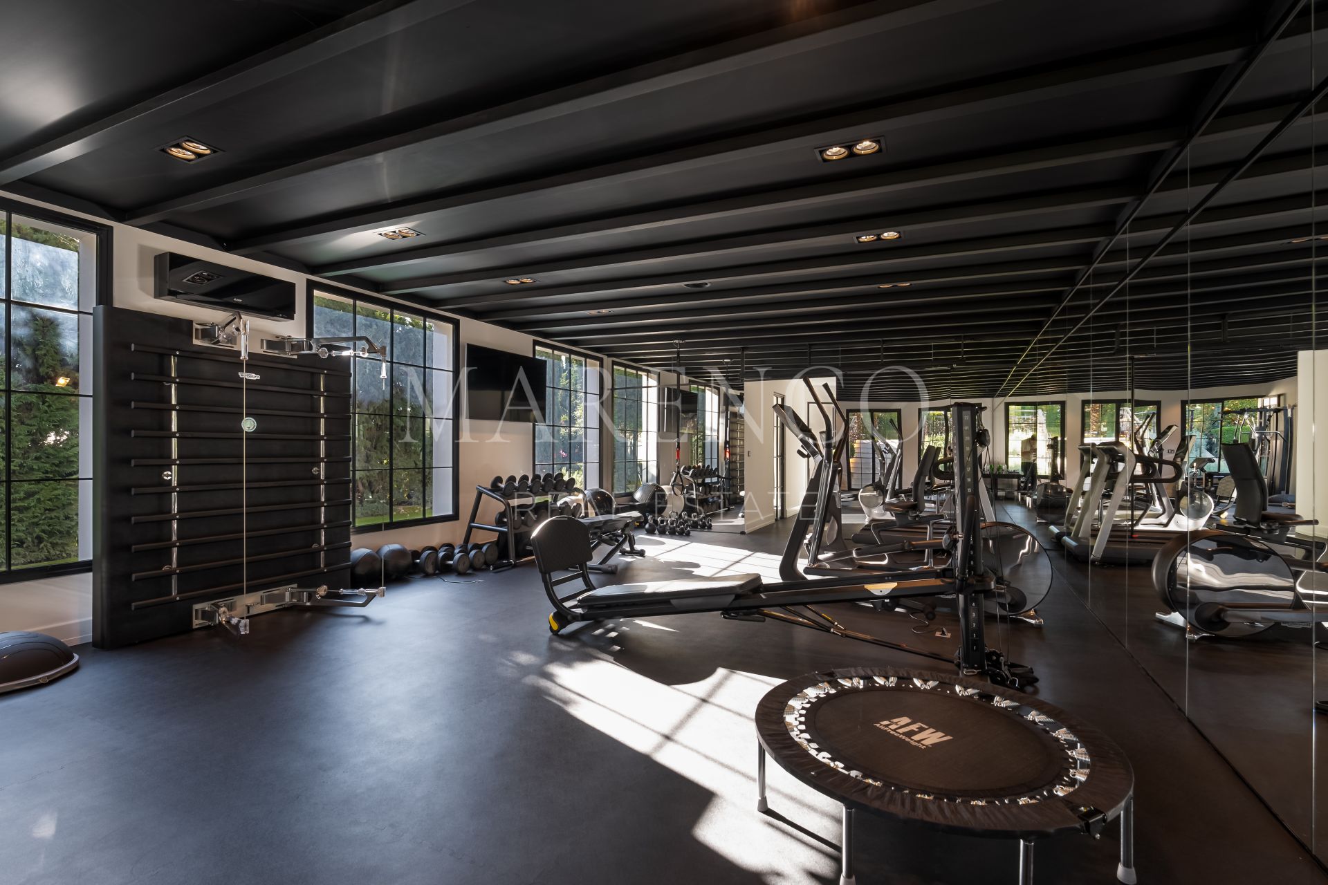 Además de la villa principal, un edificio separado alberga un gimnasio completamente equipado, un baño turco, una sala de masajes, un baño completo y espacio de almacenamiento, ofreciendo un refugio privado de bienestar. En el exterior, la propiedad dispone de una hermosa zona de piscina rodeada de jardines paisajísticos, una zona de barbacoa, una cancha de tejo y amplias terrazas diseñadas para el relax y el entretenimiento.