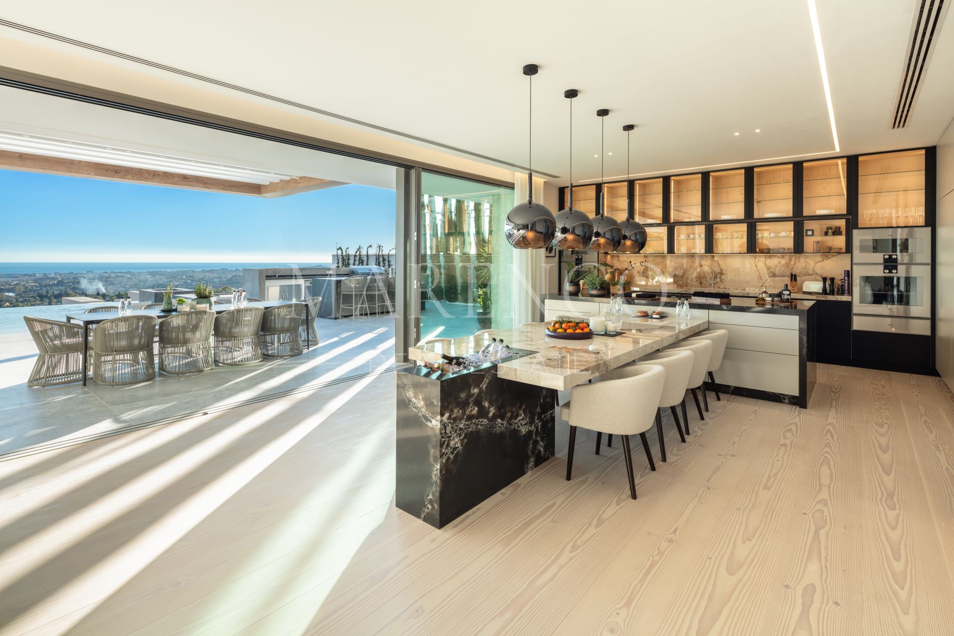 Distribuida en dos niveles, cuenta con un elegante salón de planta abierta con zona de comedor junto a una exquisita cocina gourmet con electrodomésticos de alta gama. Con 5 dormitorios, incluyendo un espectacular dormitorio principal con magníficas vistas al mar, vestidor y baño en suite.