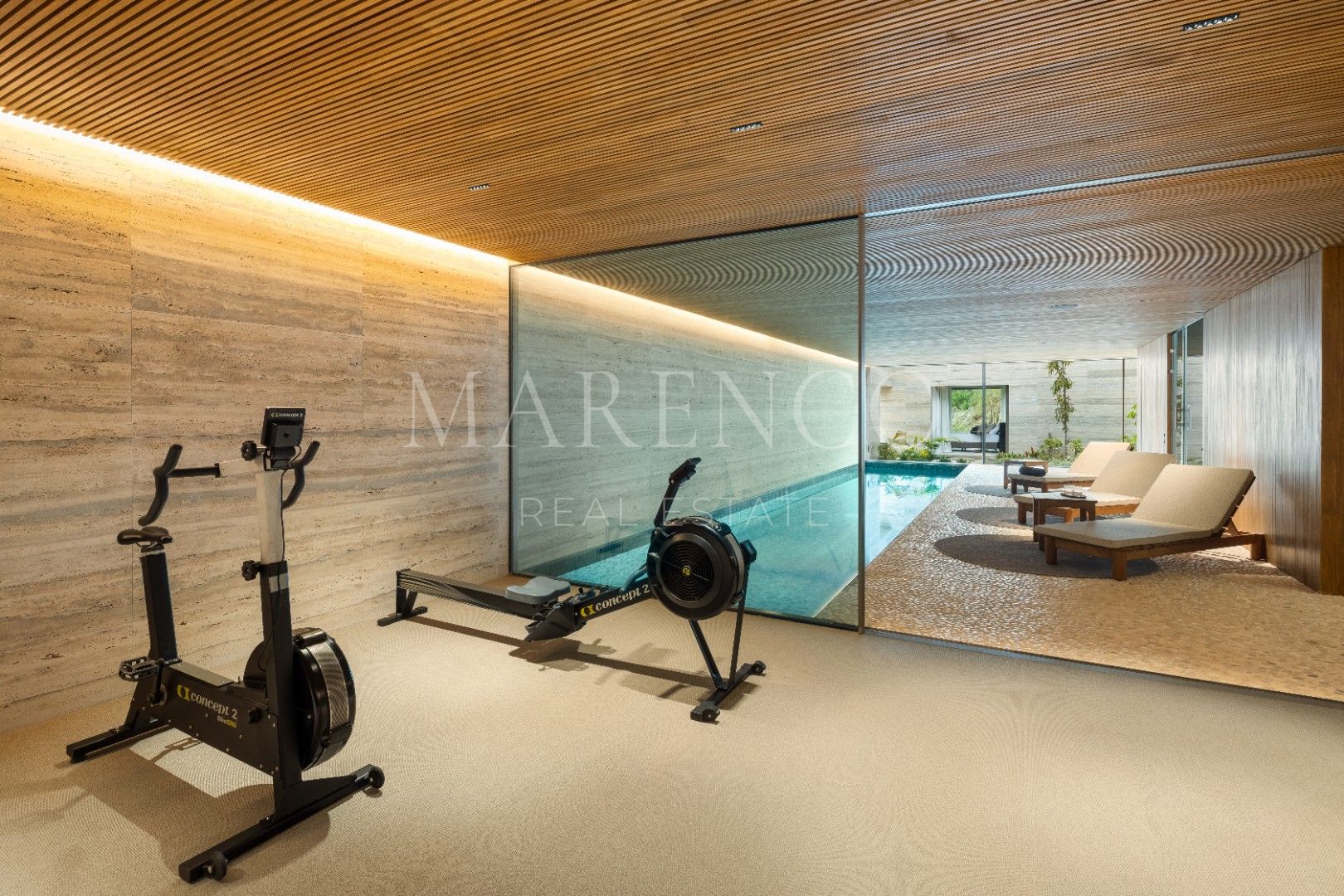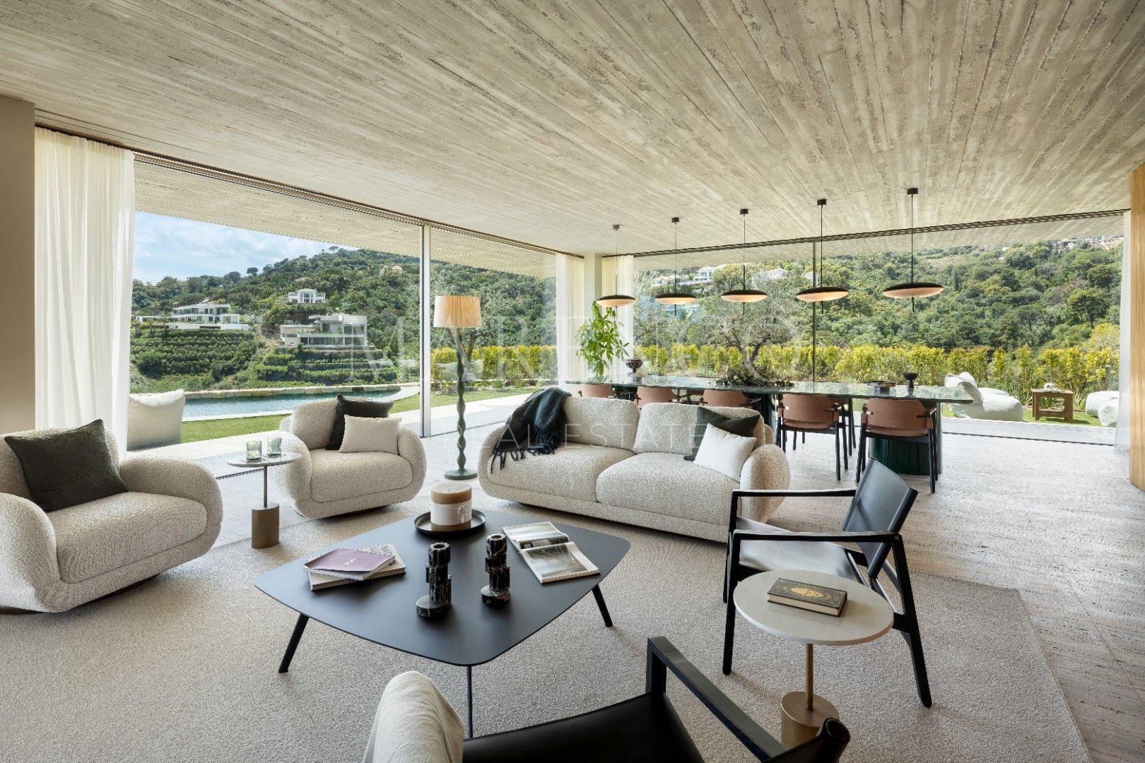 Las amplias terrazas ofrecen el entorno ideal para disfrutar de comidas al aire libre y momentos de tranquilidad bajo el sol andaluz. En el interior, cada detalle refleja una elegancia moderna, con un mobiliario cuidadosamente seleccionado que complementa las líneas arquitectónicas de la villa. Las comodidades de última generación incluyen una piscina climatizada, baño turco, sala de cine privada y bodega, garantizando un estilo de vida definido por el confort y el placer.