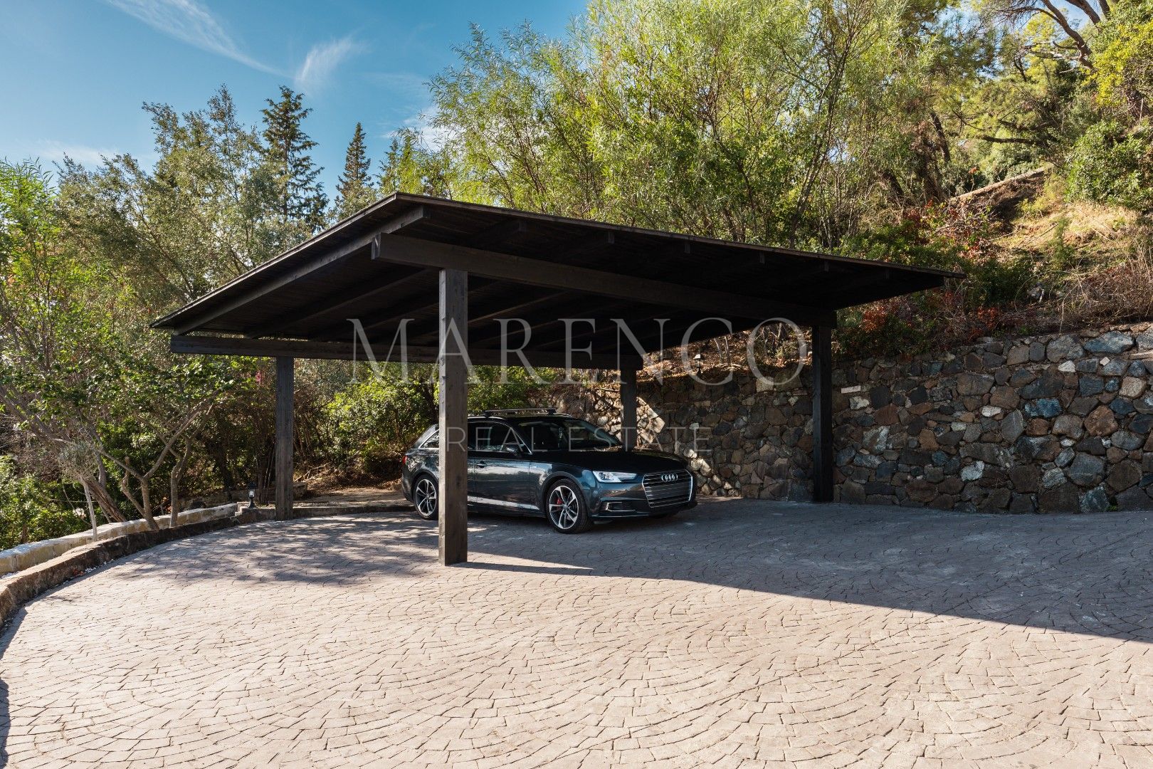 Las terrazas, presentes en varios niveles, permiten disfrutar de diferentes perspectivas del entorno natural, desde rincones íntimos para leer hasta miradores abiertos donde contemplar el mar. El área exterior se completa con una piscina privada, zonas de descanso rodeadas de vegetación autóctona y un amplio espacio de aparcamiento que incluye un garaje cerrado, un carport cubierto para dos vehículos y espacio exterior adicional para varios coches más