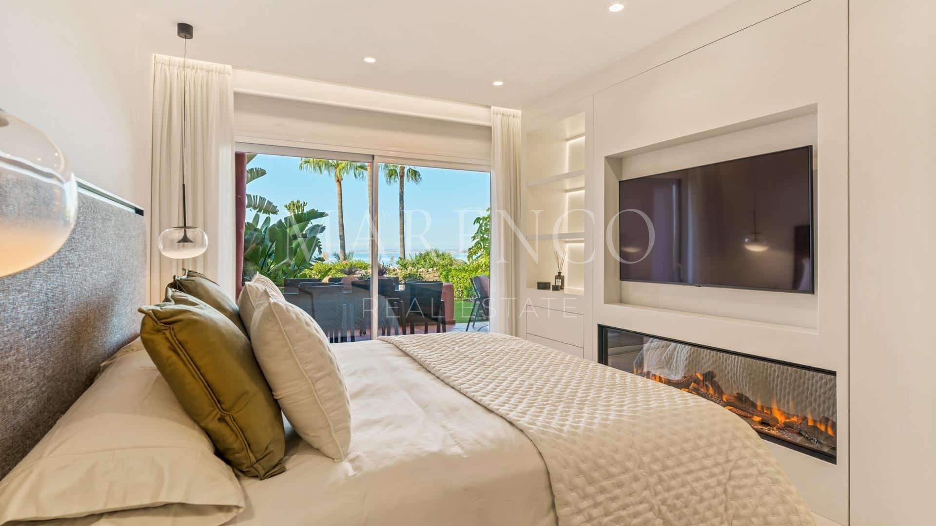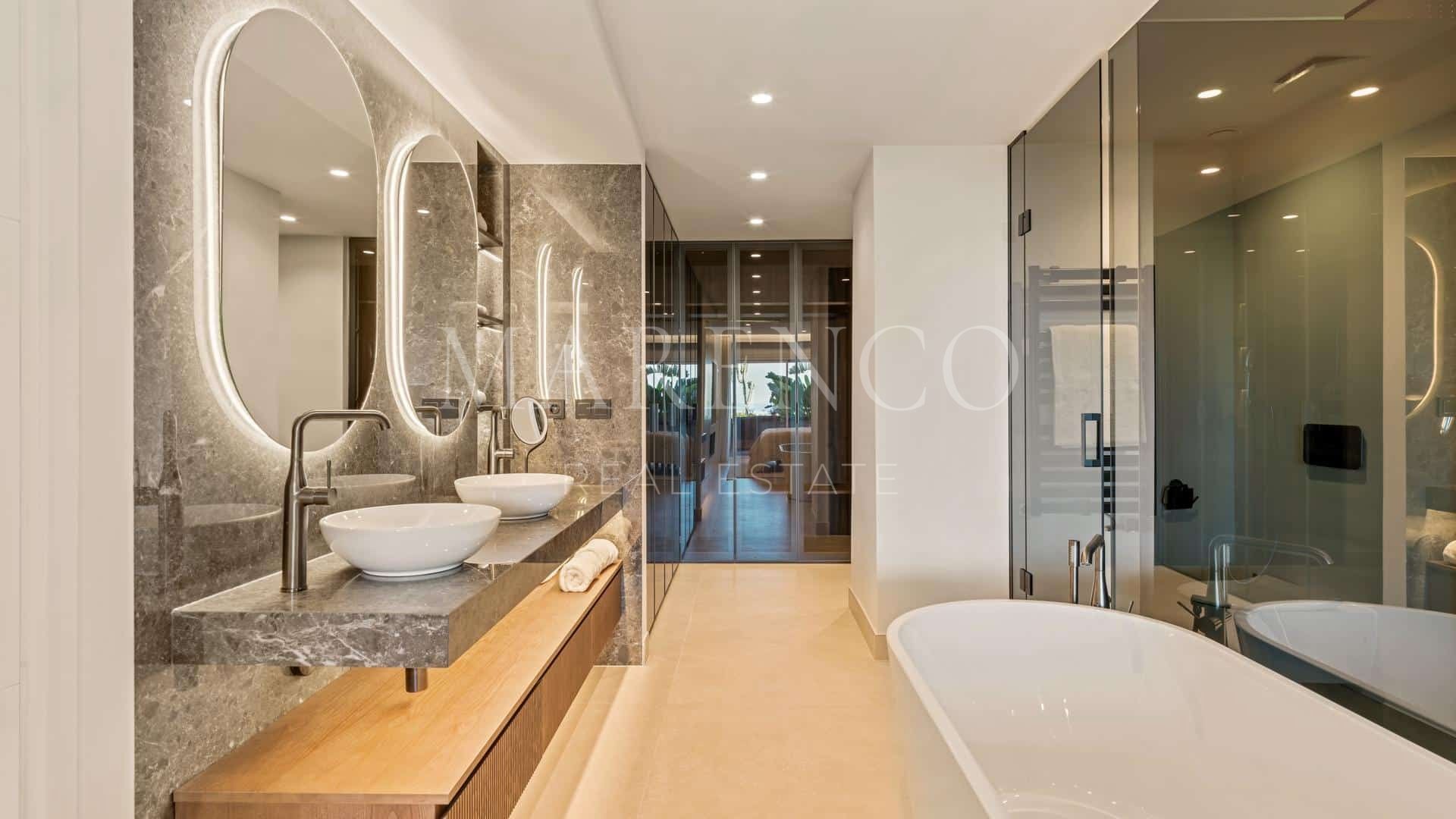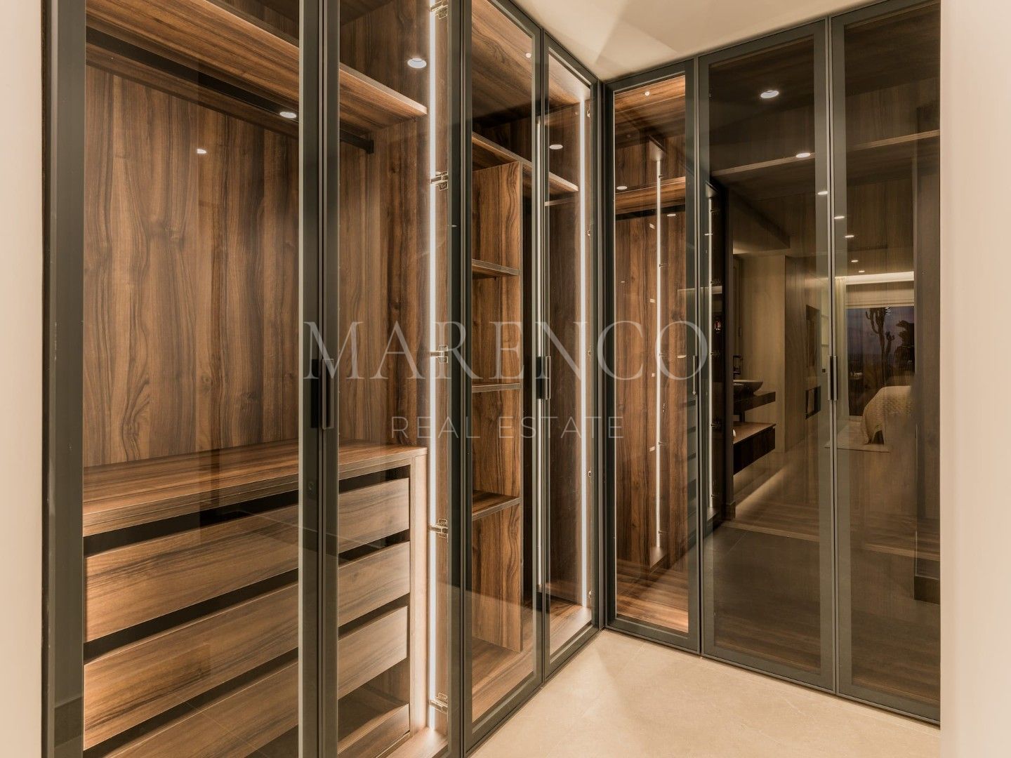 Al ingresar, se encontrará con una cocina abierta impecable y una sala de estar, cuidadosamente diseñadas por nuestro talentoso decorador de interiores para ofrecer vistas panorámicas del fascinante mar Mediterráneo. Los detalles lujosos, como el sistema de sonido Bang & Olufsen y la acogedora chimenea eléctrica, realzan la experiencia en este extraordinario interior.
